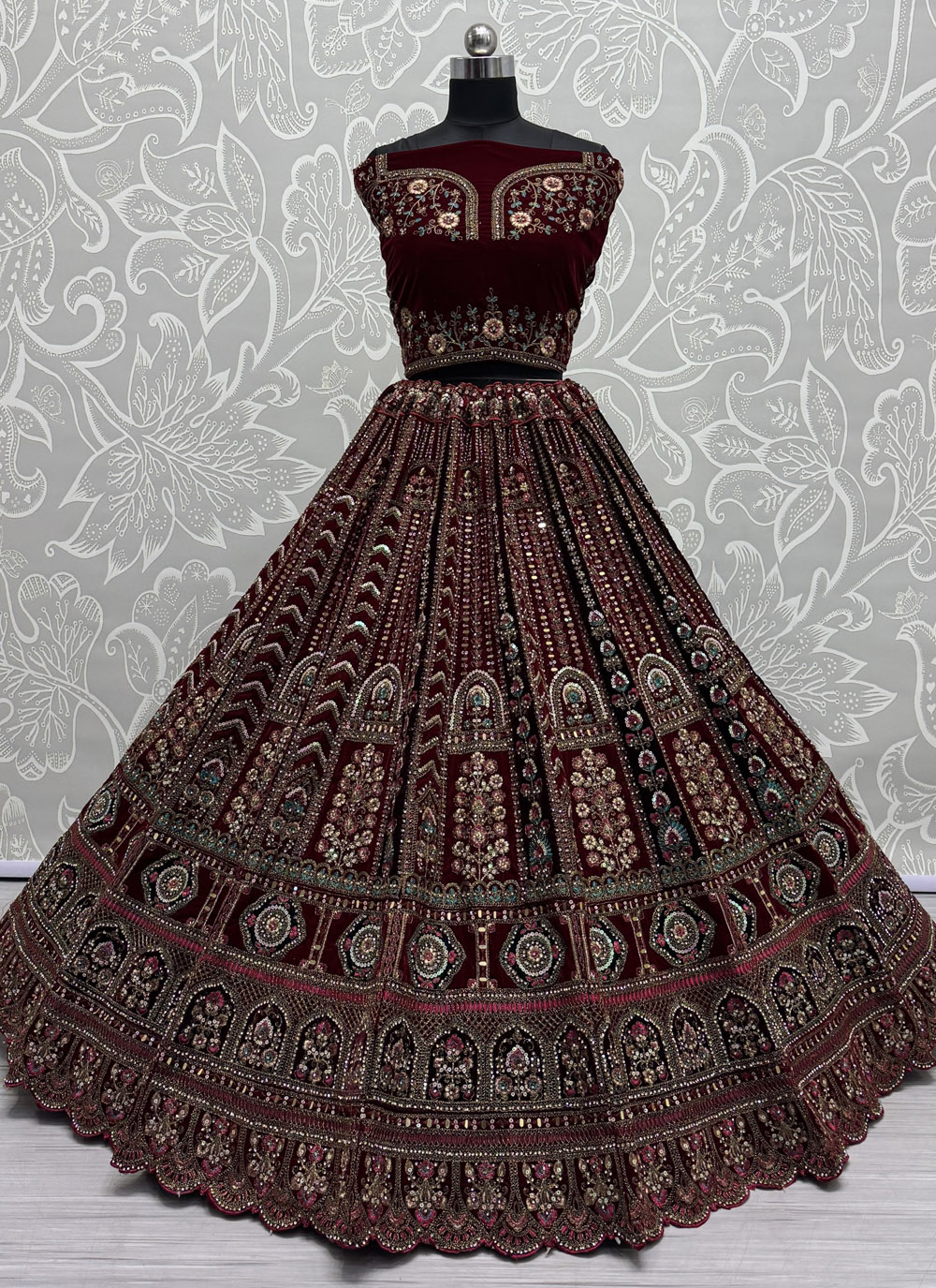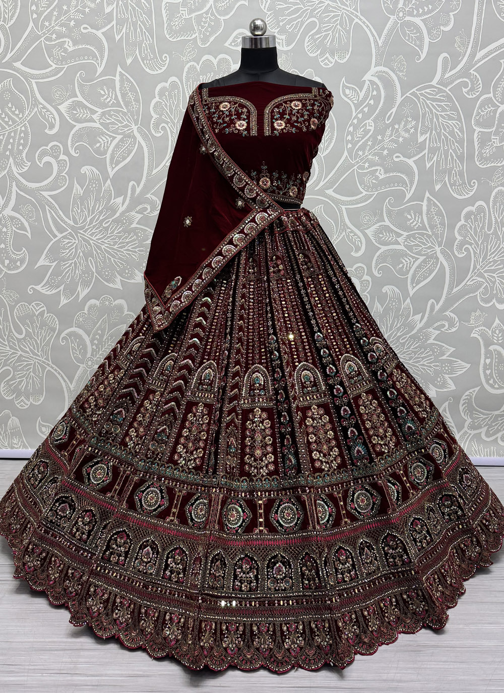 Make a breathtaking statement in this maroon velvet bridal lehenga choli embellished with multi-thread motifs, shimmering sequins, and fine diamond work. The combination of heritage artistry and contemporary allure transforms this ensemble into an unforgettable piece worthy of your most treasured moments. Comes with matching choli and dupatta.