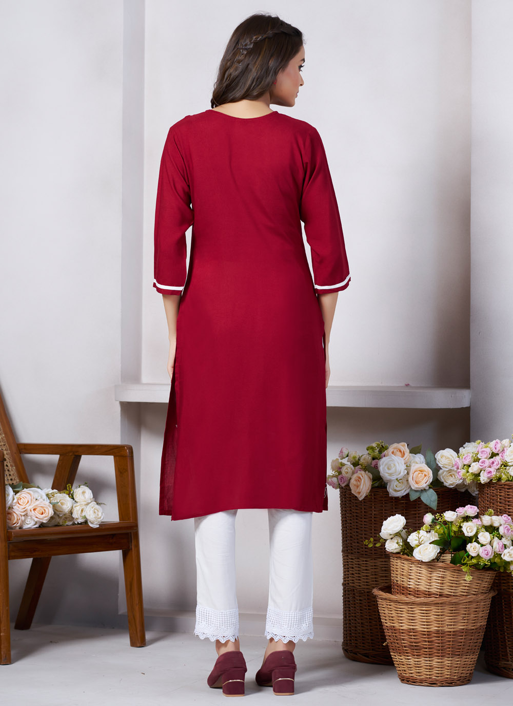 Elevate your everyday wardrobe with this Maroon Casual Kurti made from soft viscose rayon. Featuring tasteful embroidery and a relaxed fit, this kurti is a perfect blend of comfort and elegance.