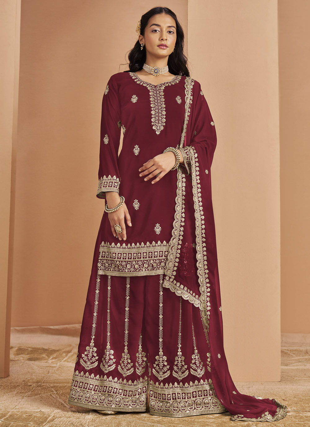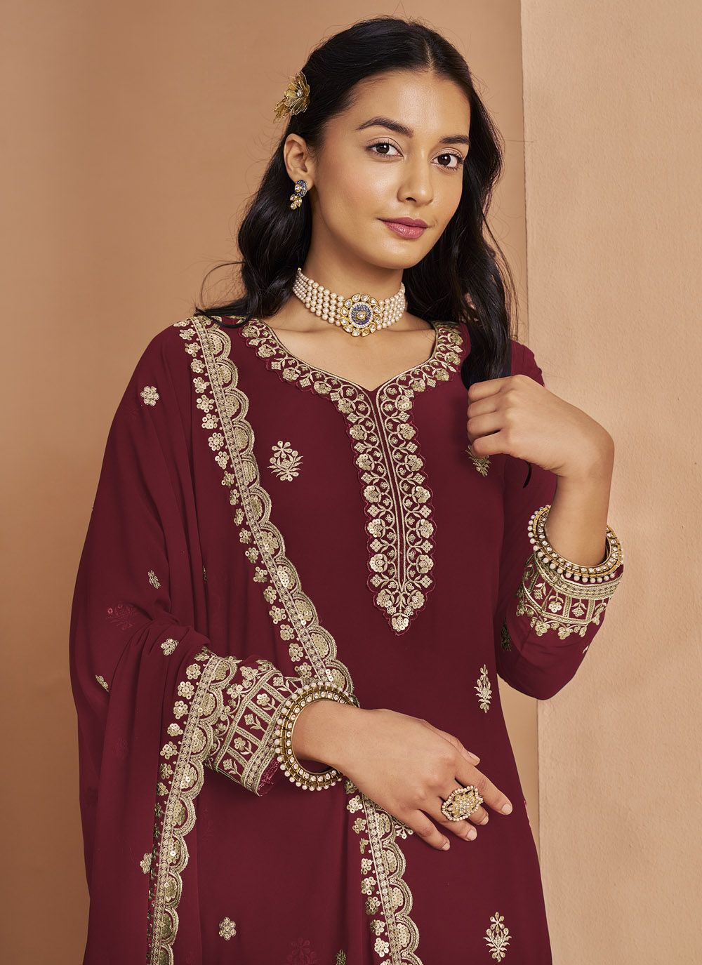 This designer maroon salwar suit features delicate zari work that enhances its timeless appeal. Crafted from premium faux georgette, it offers a soft drape and a graceful silhouette, ideal for weddings, receptions and festive occasions. Comes with matching bottom and dupatta.