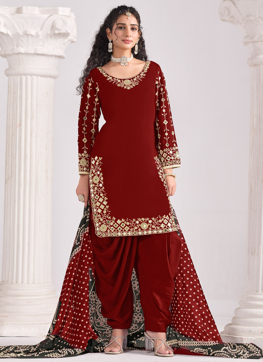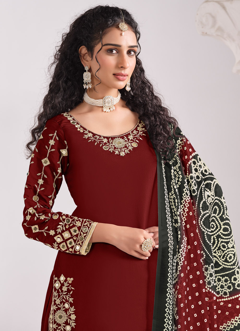 Radiate elegance in this maroon silk salwar kameez, finely embroidered with shimmering mirror accents and delicate zari work. A graceful outfit for festive wear. Comes with matching bottom and dupatta.