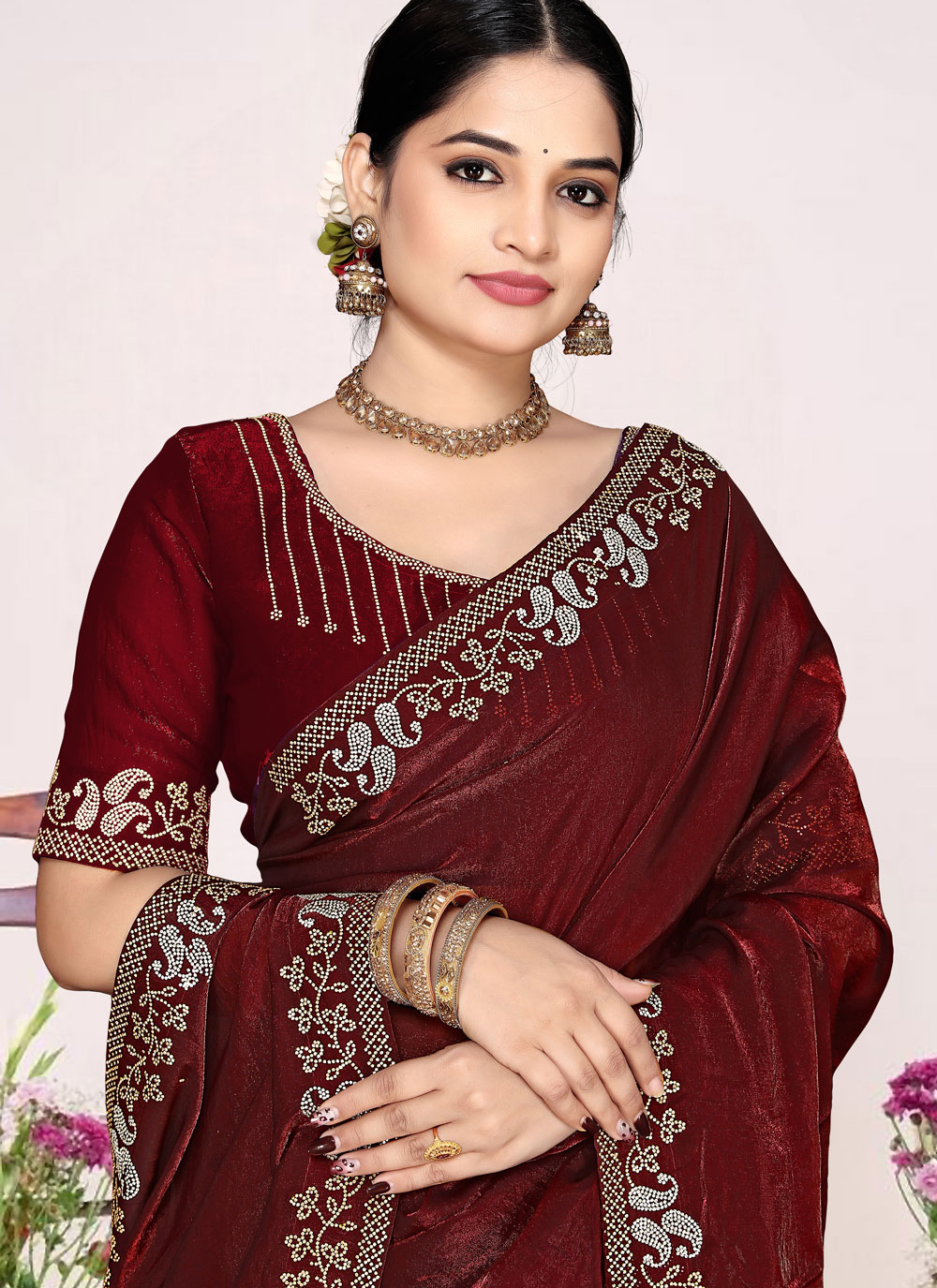 This Maroon Classic Saree in Satin Silk highlights refined craftsmanship through detailed zarkan accents that complement the rich fabric. Comes with matching blouse.