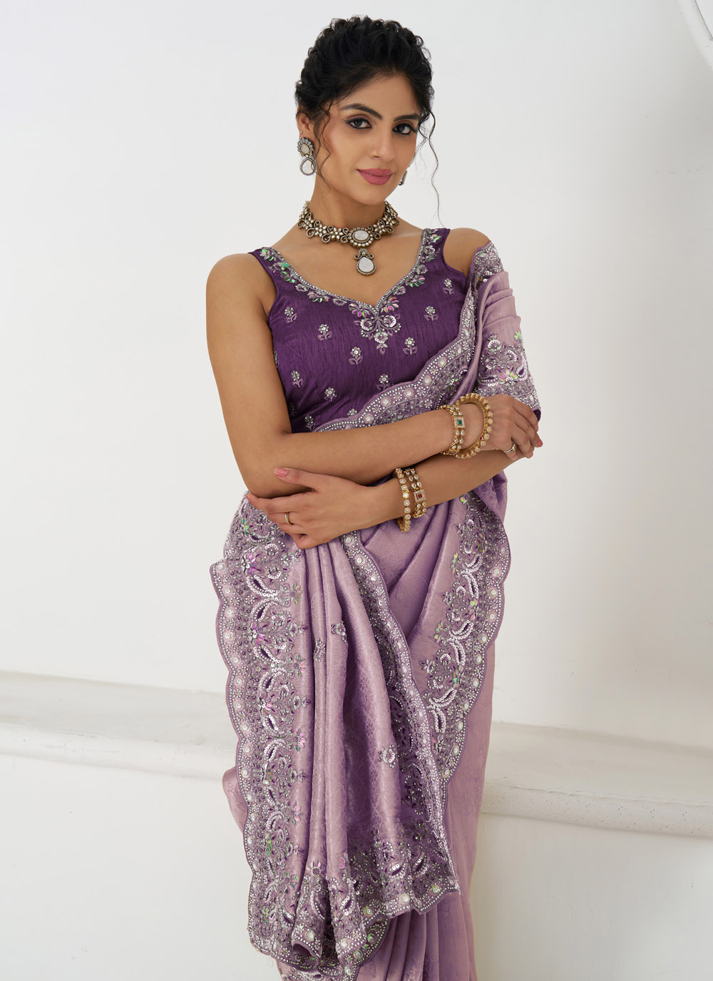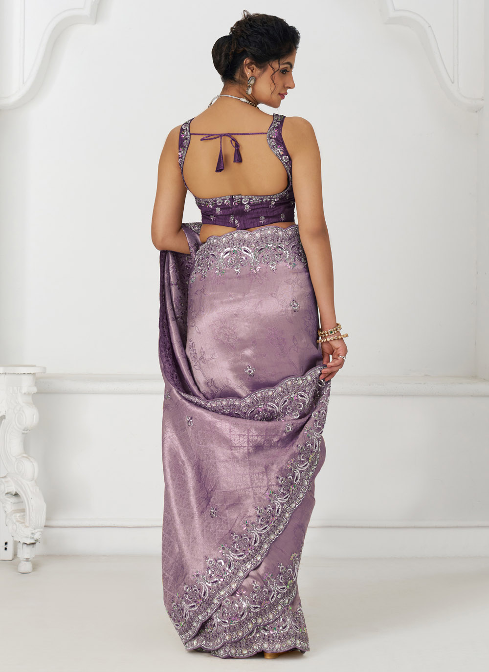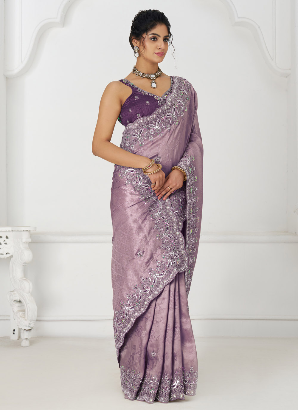 Grace your special occasions with this exquisite Mauve Dola Viscose Saree, beautifully adorned with sequins, zari, stone, and beads embroidery. Its elegant color, paired with intricate craftsmanship, makes it a timeless piece ideal for weddings and grand celebrations. Comes with matching blouse.