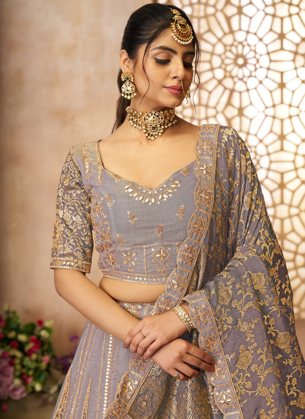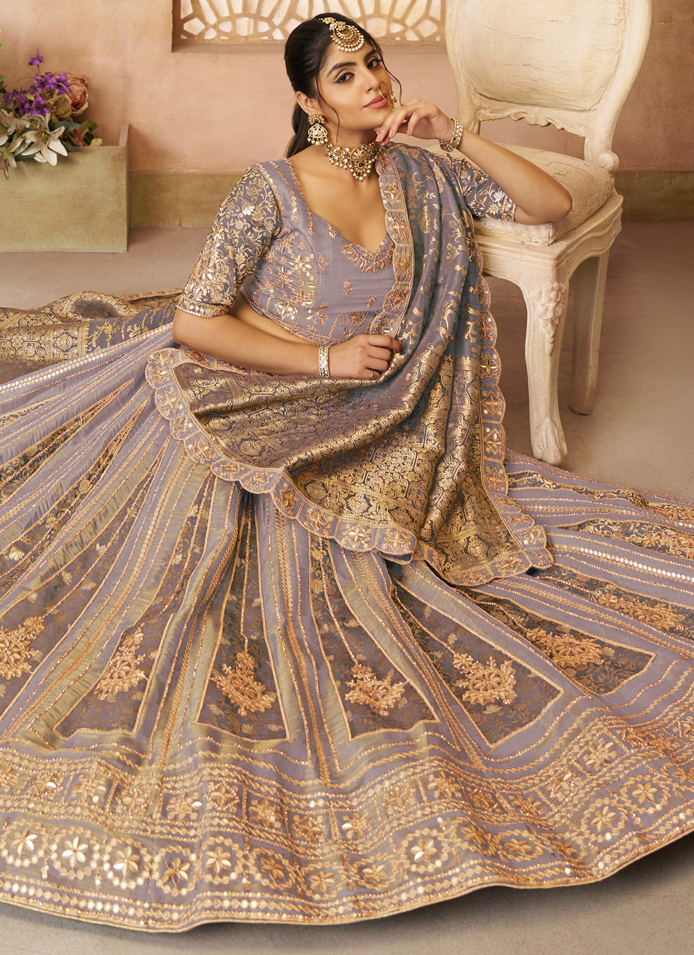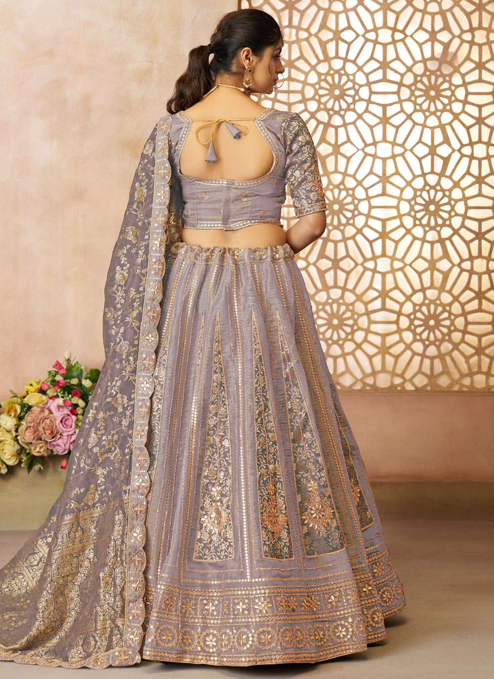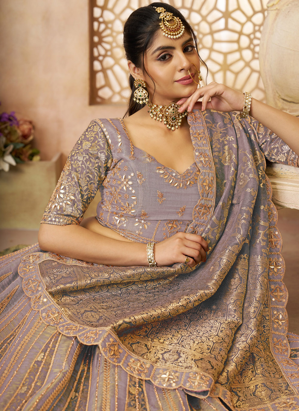 Step into the spotlight with this stunning Mauve Tissue Net Lehenga Choli, intricately detailed with shimmering sequins, radiant stones, and fine zari embroidery. Banarasi patchwork adds a regal finish, making it a perfect ensemble for sangeet, mehendi, or any festive celebration. Comes with matching choli and dupatta.