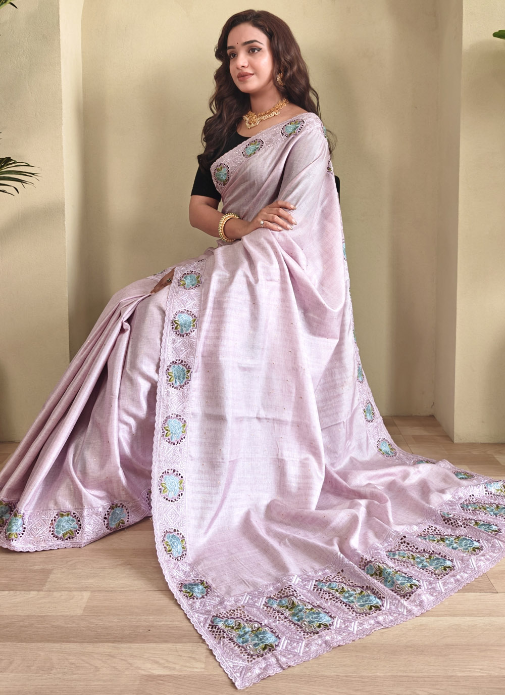 Crafted in fine Tussar silk, this embroidered mauve saree is a true symbol of refined beauty. Its muted tone and soft drape make it a versatile choice for festive evenings and formal gatherings alike. Comes with matching blouse.