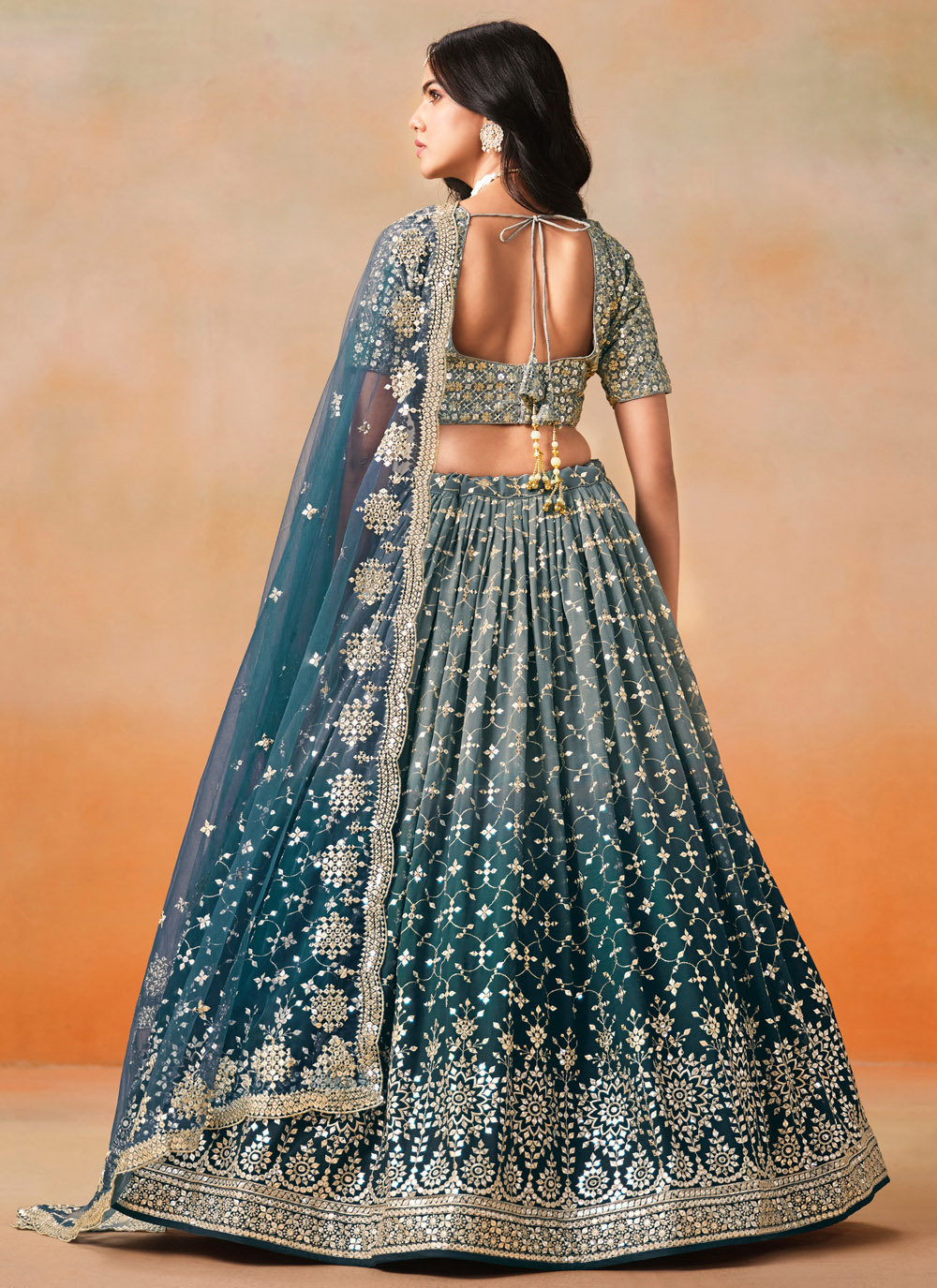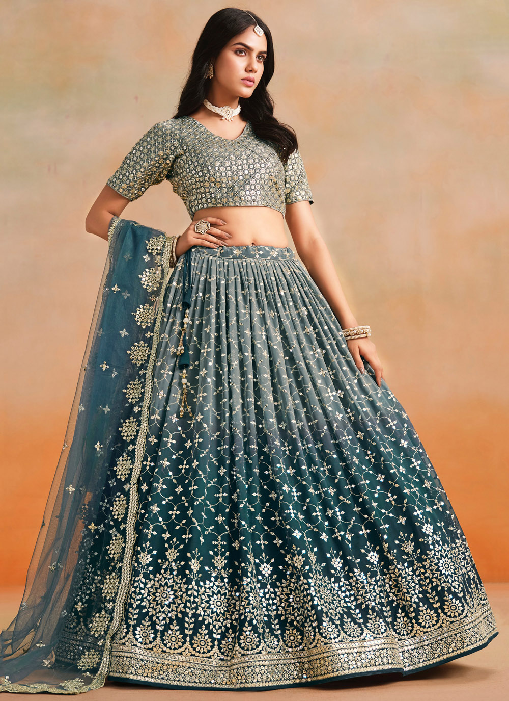 This morpeach lehenga choli blends soft georgette fabric with intricate zari and sequin work to create a dreamy festive look. Its subtle shimmer and feminine silhouette make it ideal for bridesmaids, wedding guests or any grand celebration. Comes with matching choli and dupatta.
