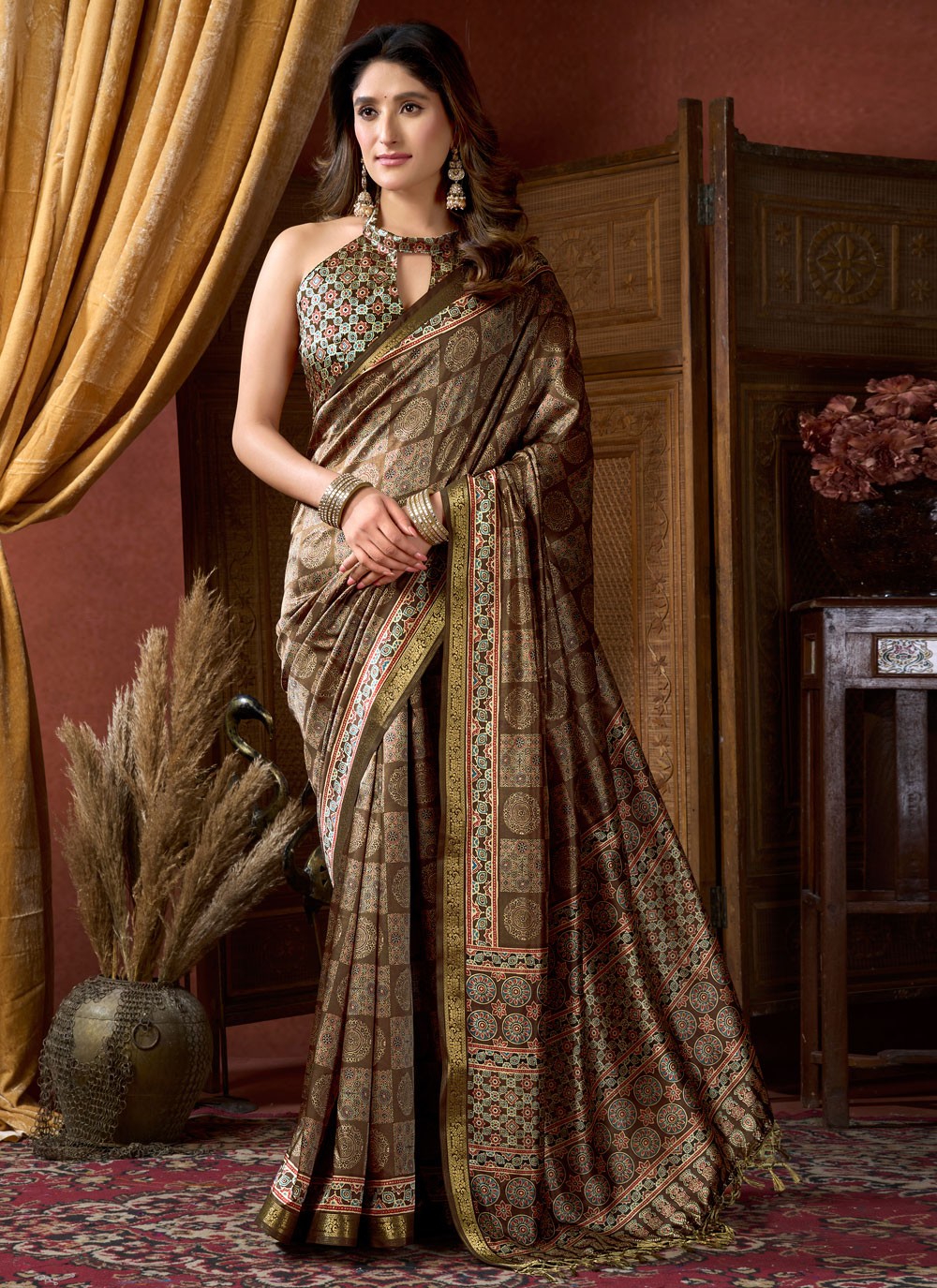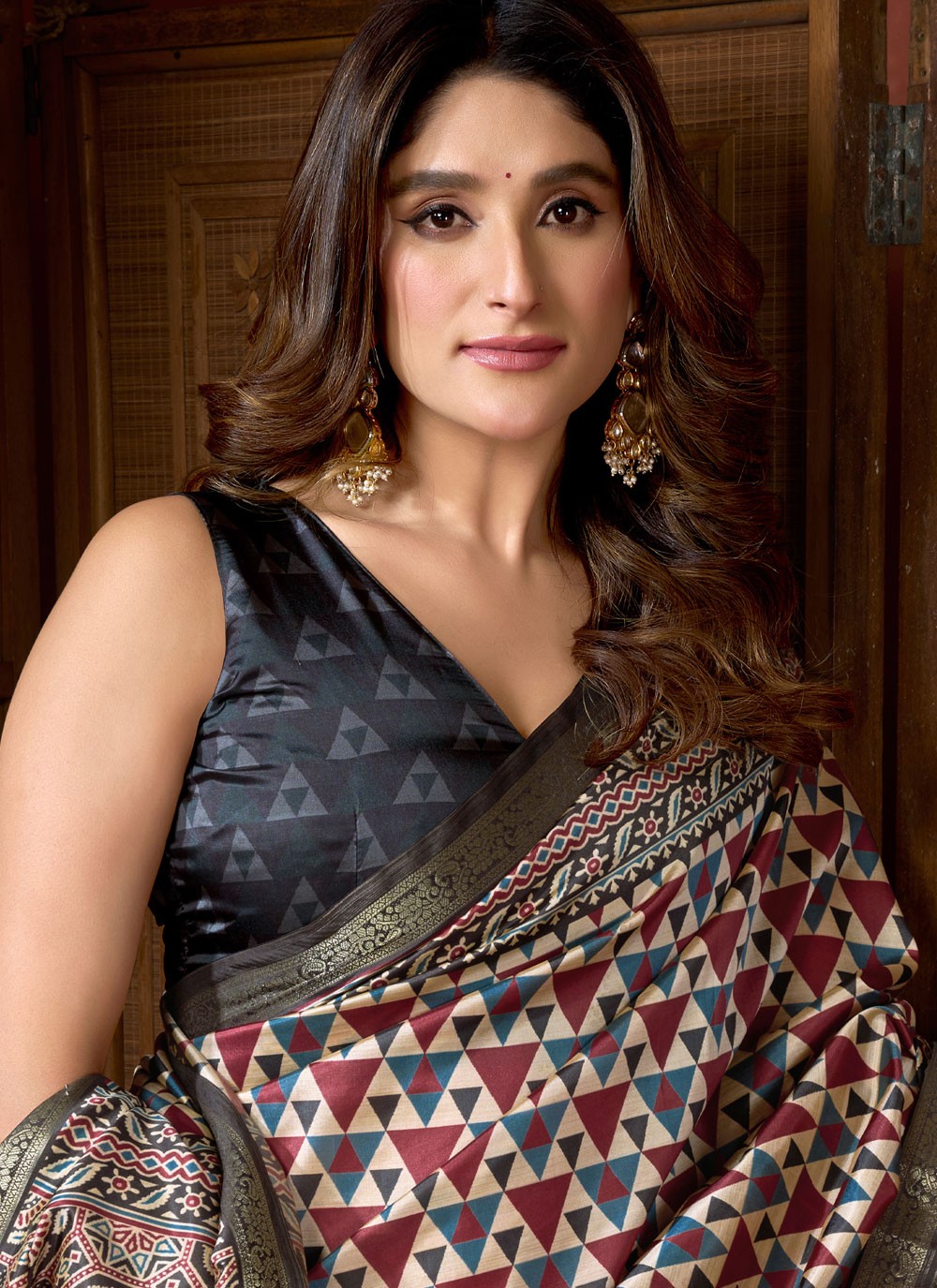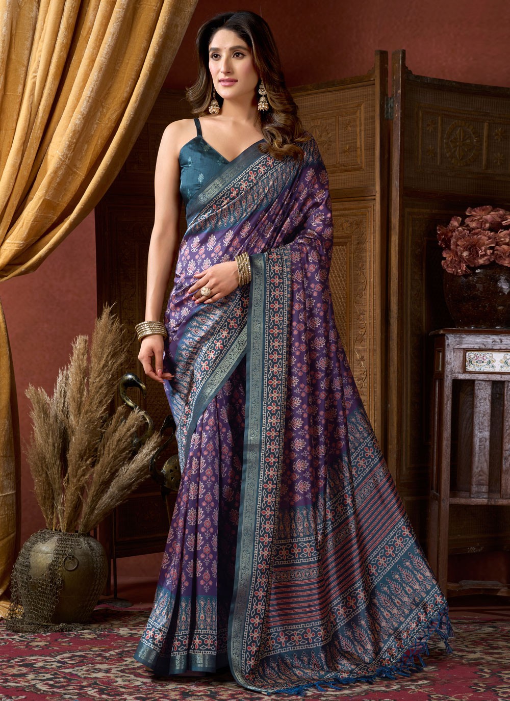 This multi color silk saree features vibrant digital prints beautifully blended with classic jacquard weaving. The rich mix of hues and traditional patterns creates an elegant drape, perfect for festive occasions and cultural celebrations. Comes with matching blouse.