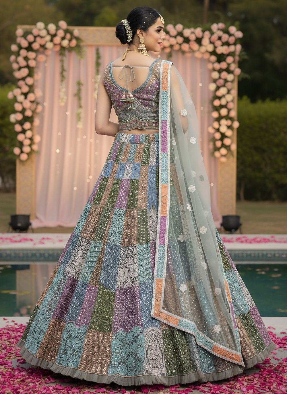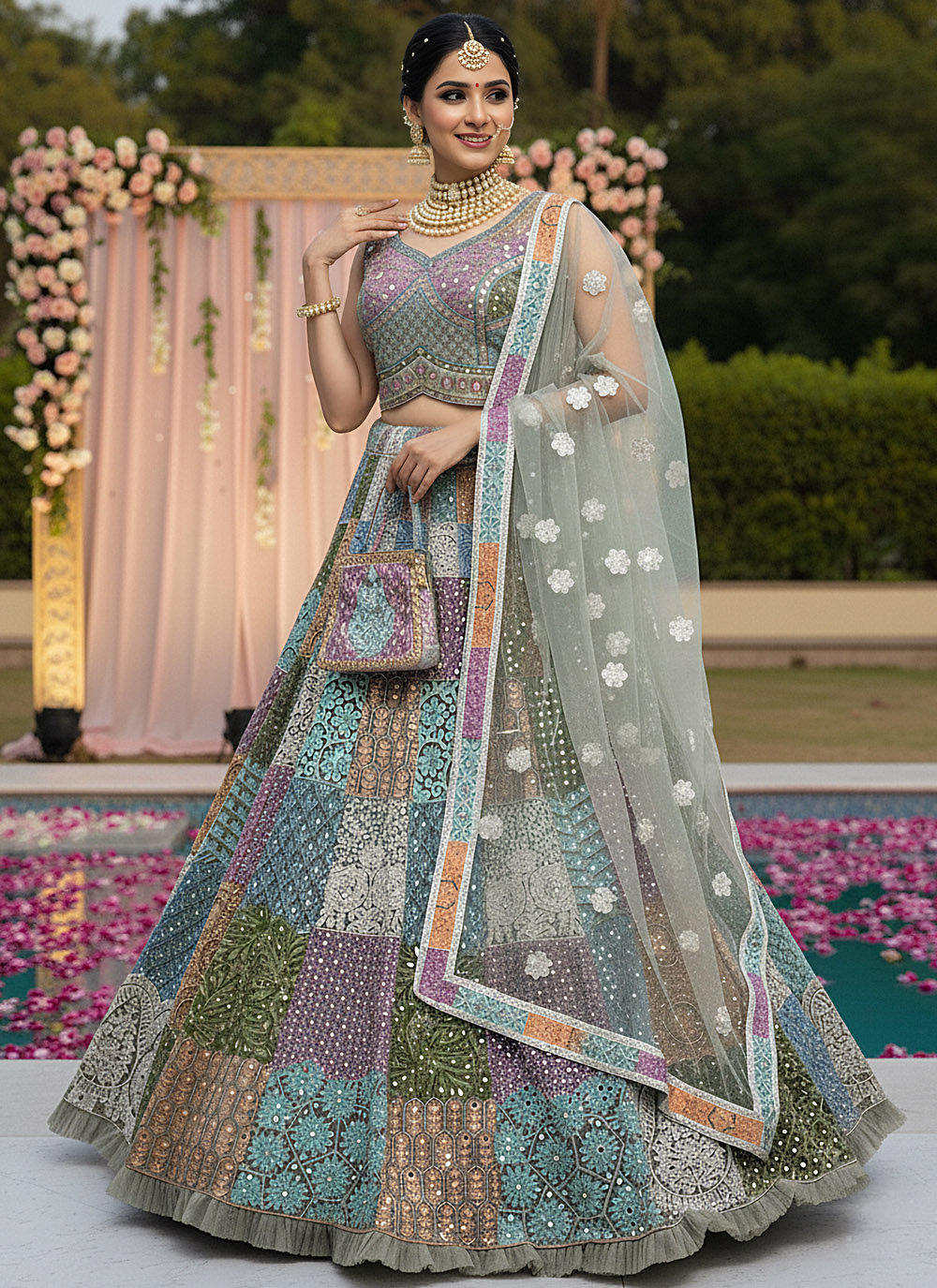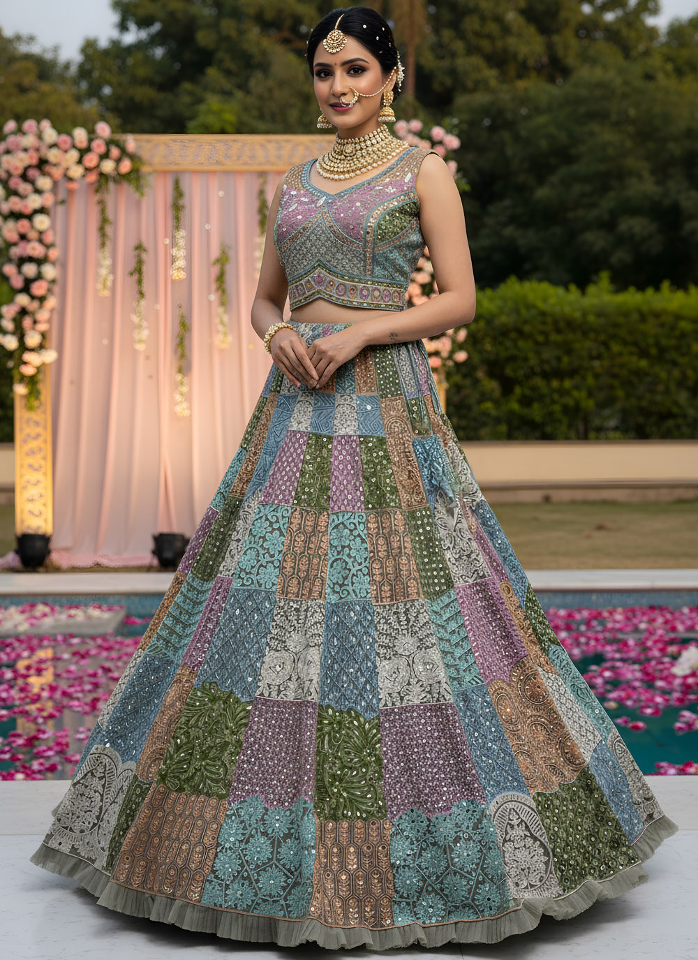 Celebrate in radiant style with this multi-colour net lehenga choli that showcases dazzling mirror embroidery and shimmering diamond detailing. Its multi-thread and dori handwork create an elegant tapestry of patterns, making the lehenga perfect for Wedding and Ceremonial functions. Comes with matching choli and dupatta.