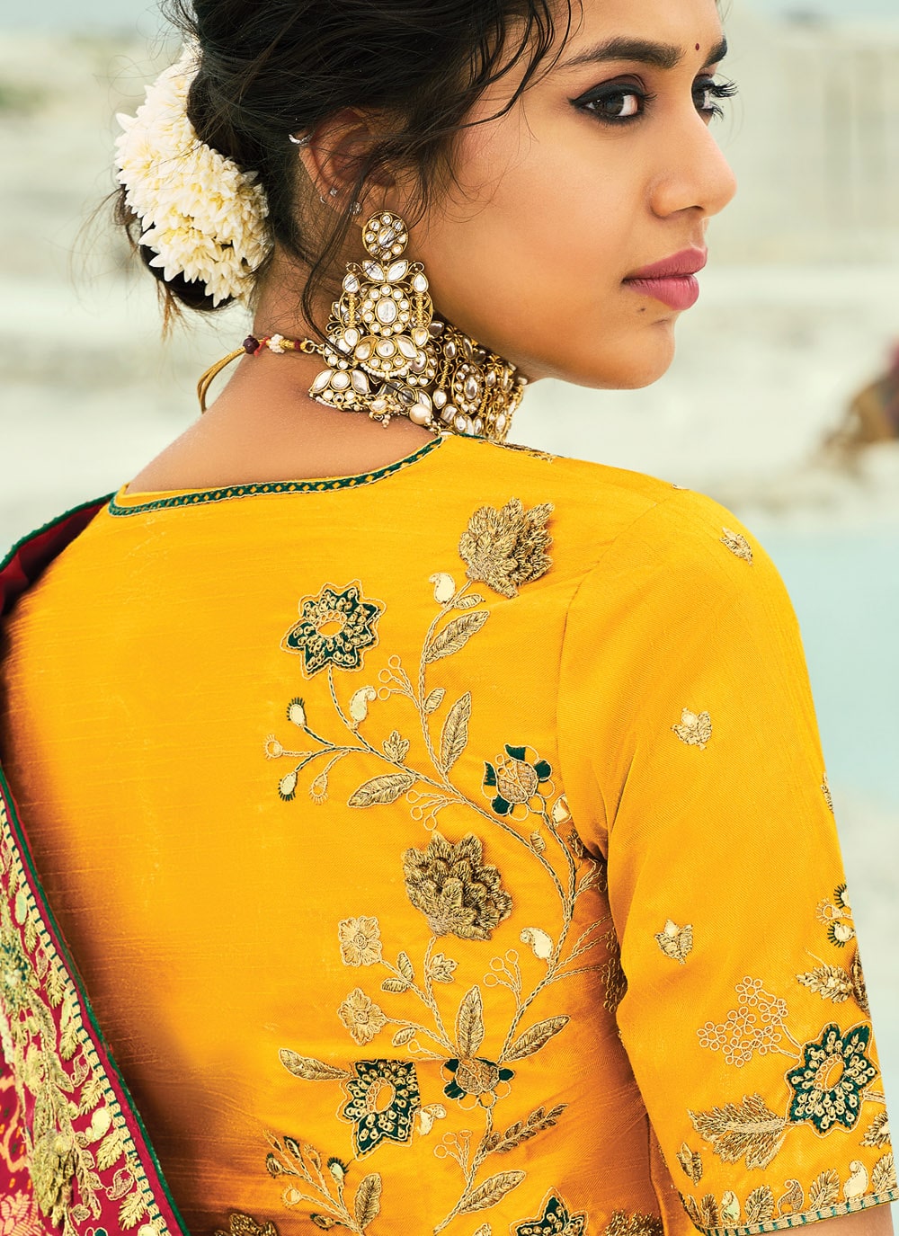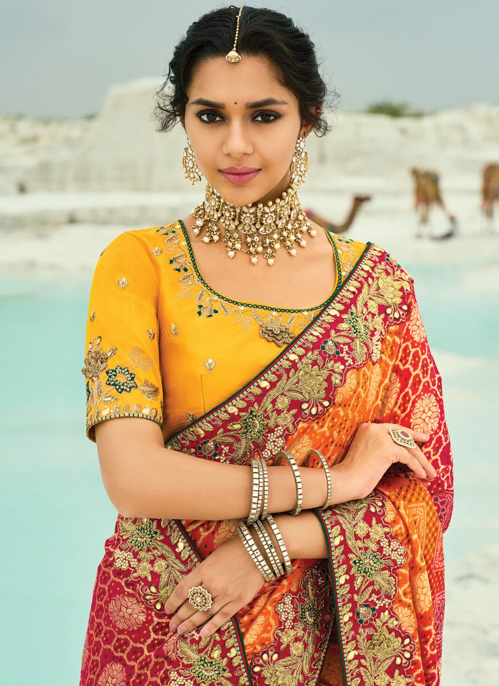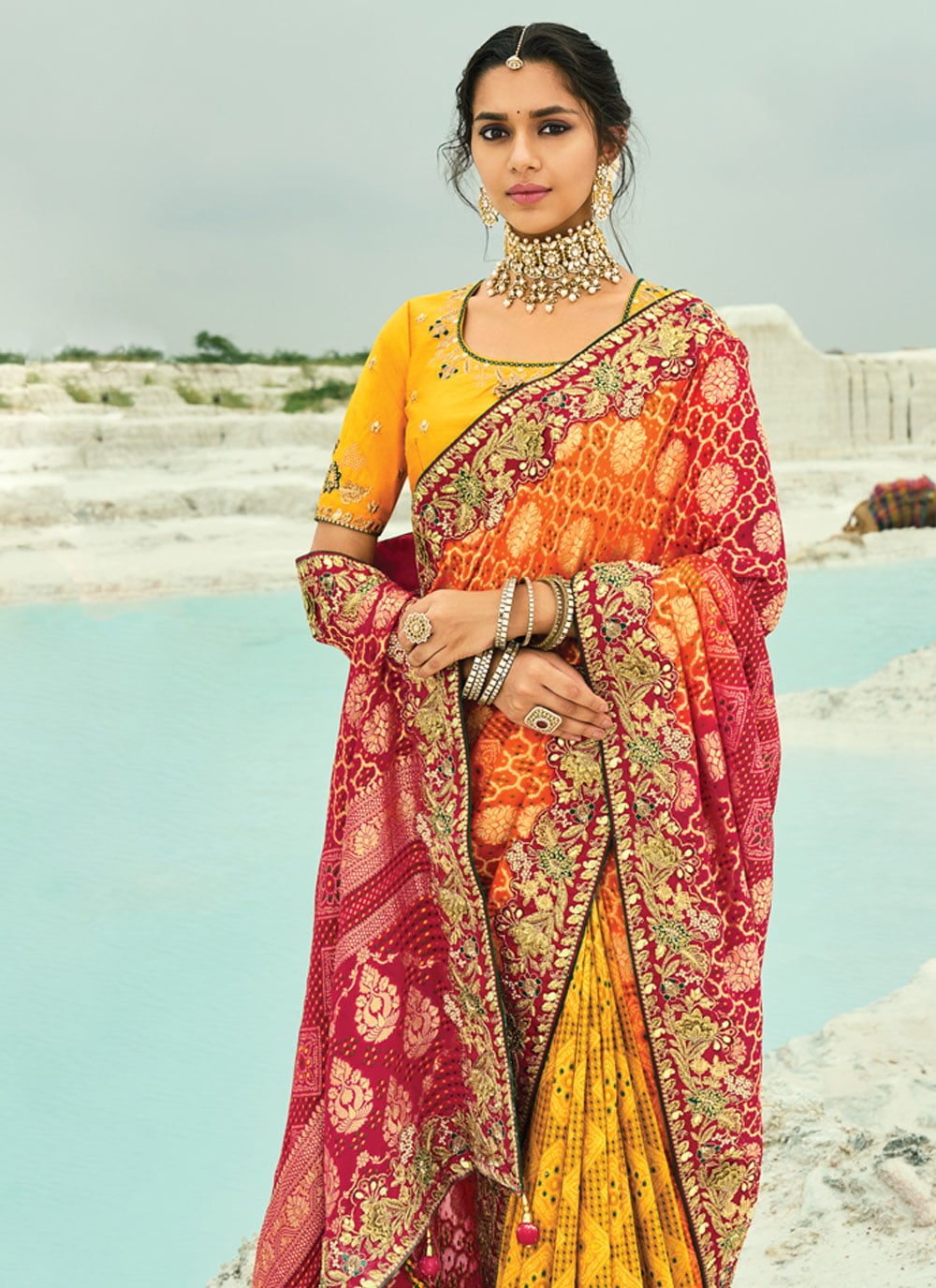 This multi-color Bandhej saree crafted from pure georgette exudes festive vibrance. Delicate zari embroidery paired with moti and cutdana embellishments highlights its artistic charm, making it a graceful addition to any wardrobe. Comes with matching blouse.
