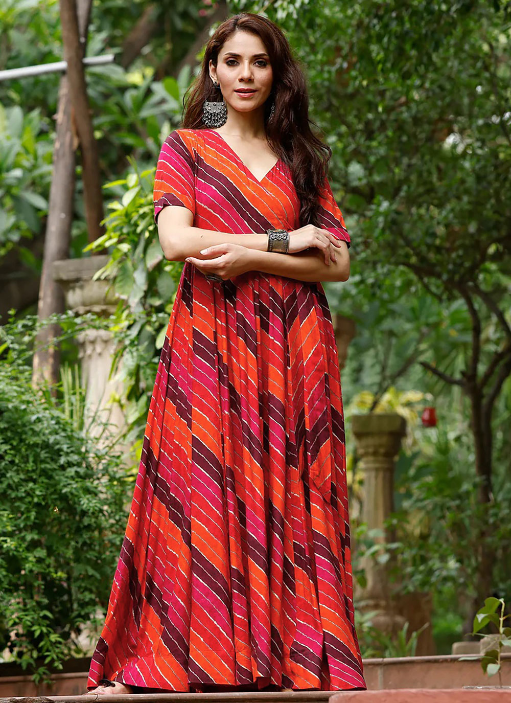 Stand out at your next party in this beautiful multi-color rayon digital print gown. Its vibrant patterns add flair, while the long silhouette and matching dupatta create a chic and stylish outfit that’s ready to wear.