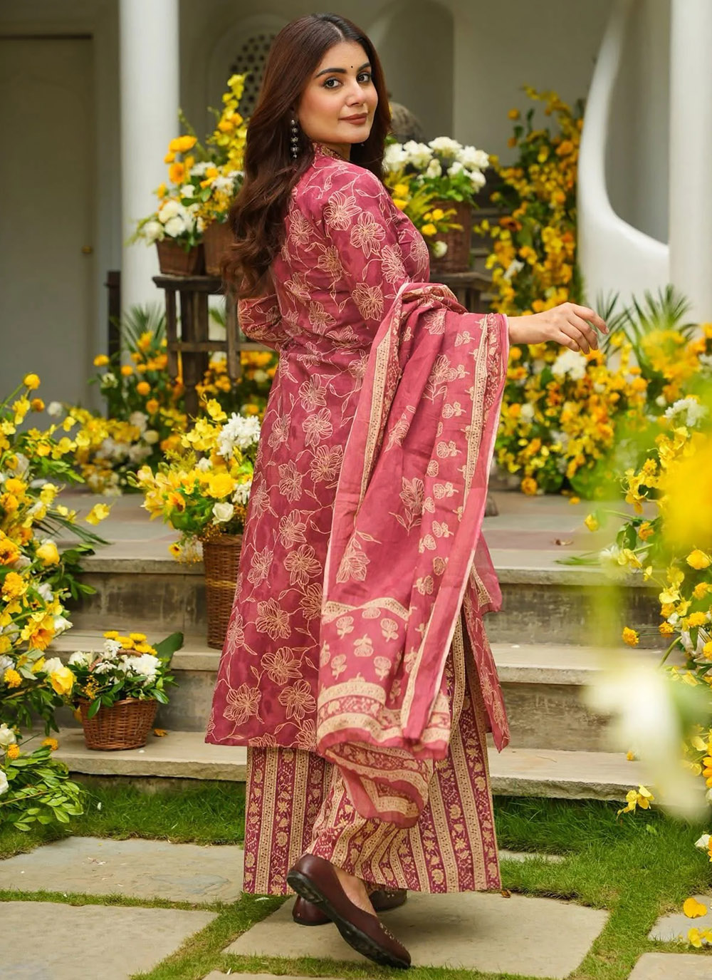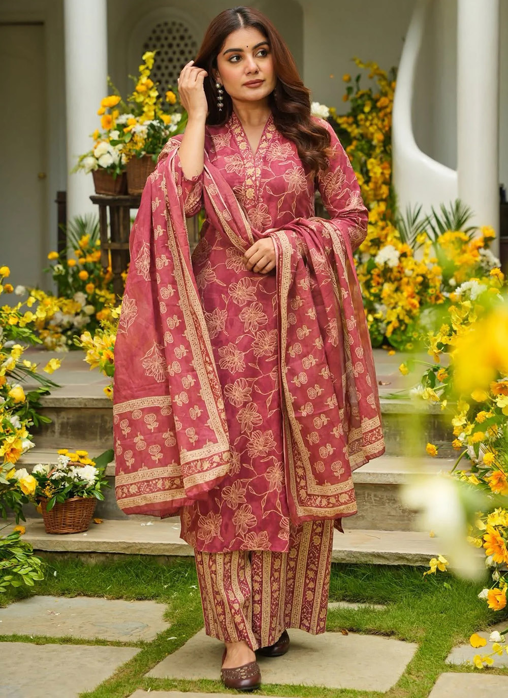Stay effortlessly stylish with this readymade maroon muslin salwar suit crafted for everyday elegance. The printed detailing enhances the look, while the soft fabric keeps you cool and comfortable. Comes with matching bottom and dupatta.