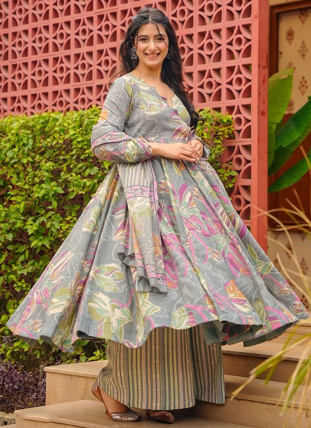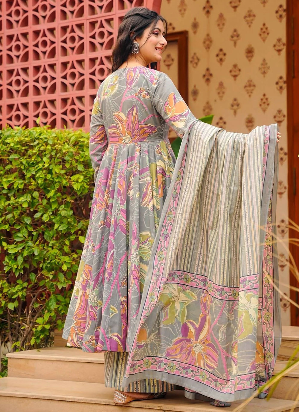 The Muslin Digital Printed Trendy Readymade Salwar Kameez in Grey offers a perfect mix of comfort and modern ethnic style. Crafted from soft muslin fabric, this readymade suit ensures a lightweight and breathable feel for all-day wear. Comes with matching bottom and dupatta.