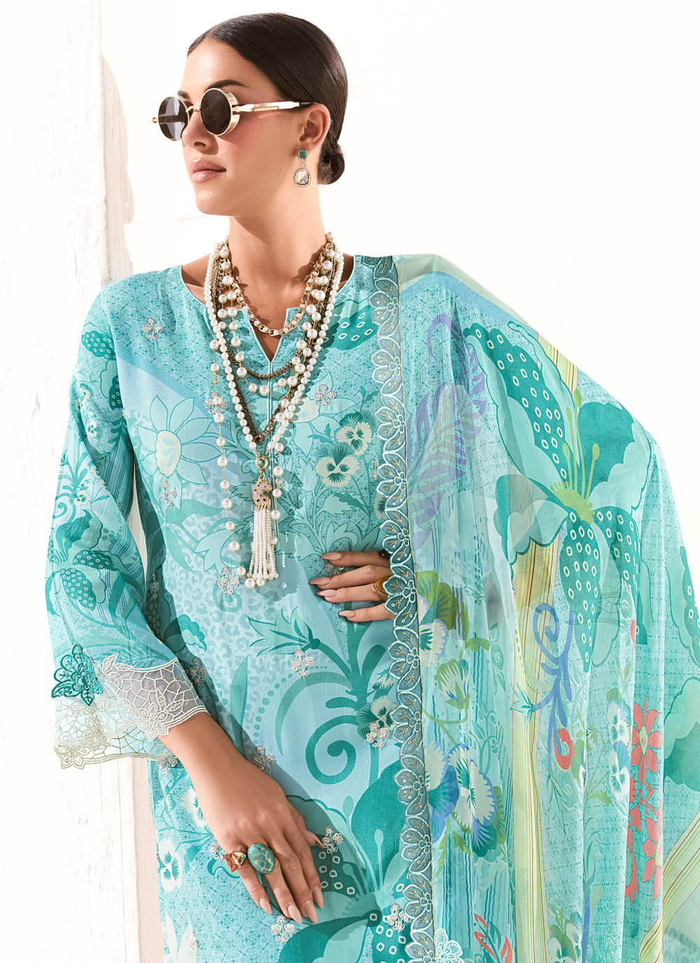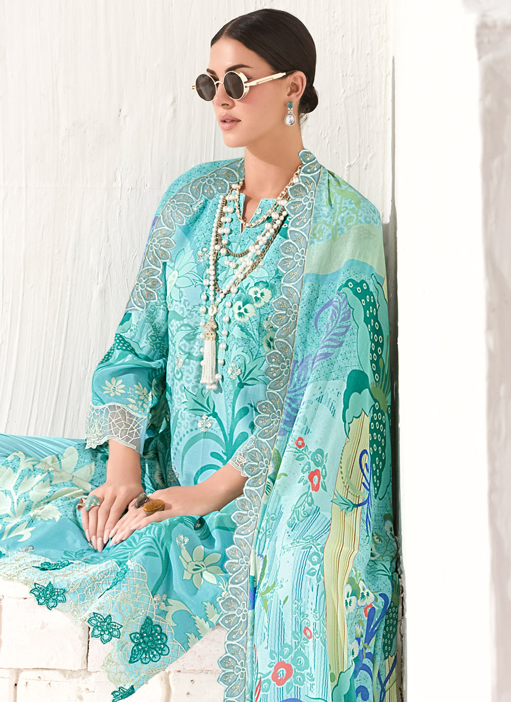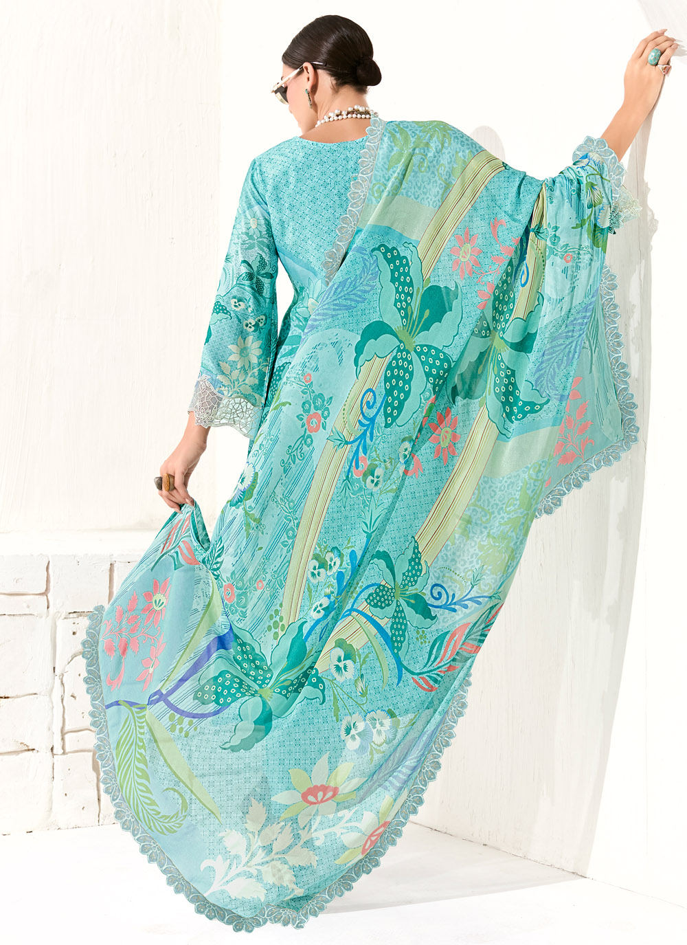 A perfect harmony of tradition and trend, this muslin salwar suit in aqua blue showcases intricate resham thread embroidery and mesmerizing digital patterns, accentuated with patch border detailing. Comes with matching bottom and dupatta.