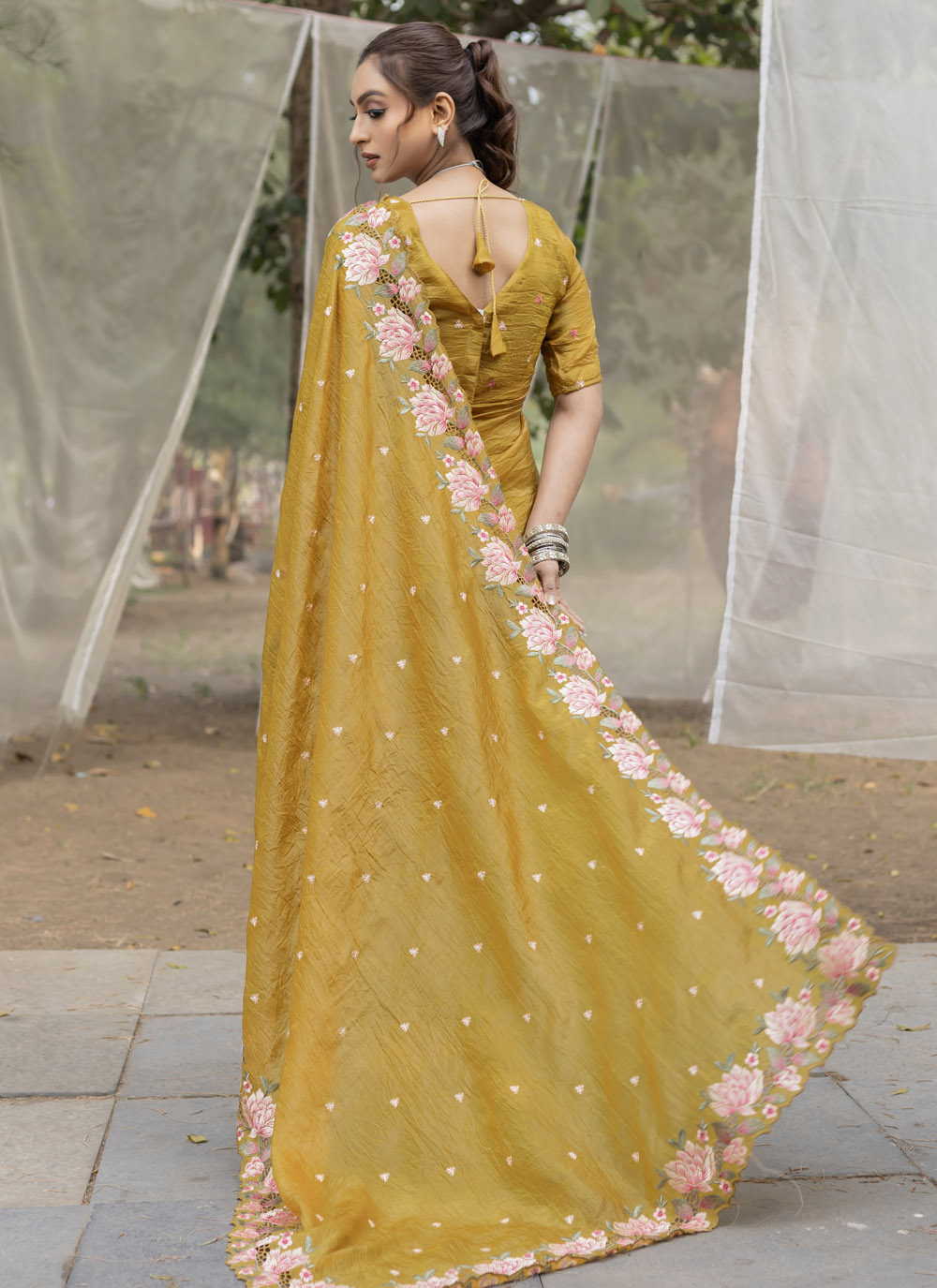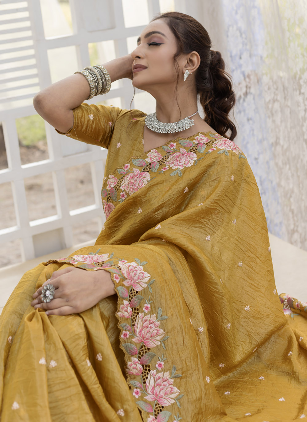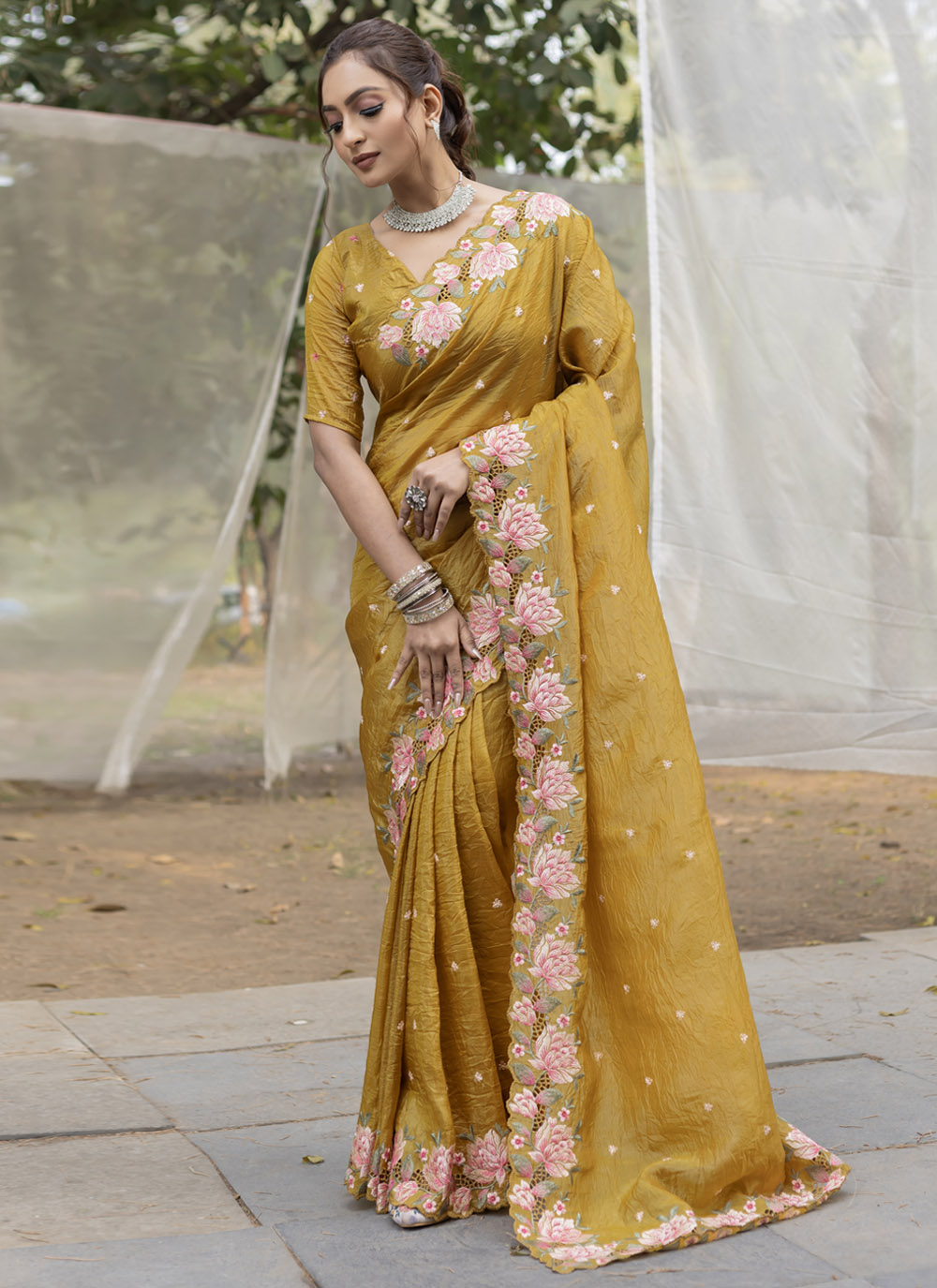 Embrace a touch of royalty with this Mustard Crush Silk Saree, meticulously crafted with intricate cutwork embroidery. Its smooth silk texture and designer appeal make it a perfect ceremonial wear for weddings, festive occasions, and grand celebrations.