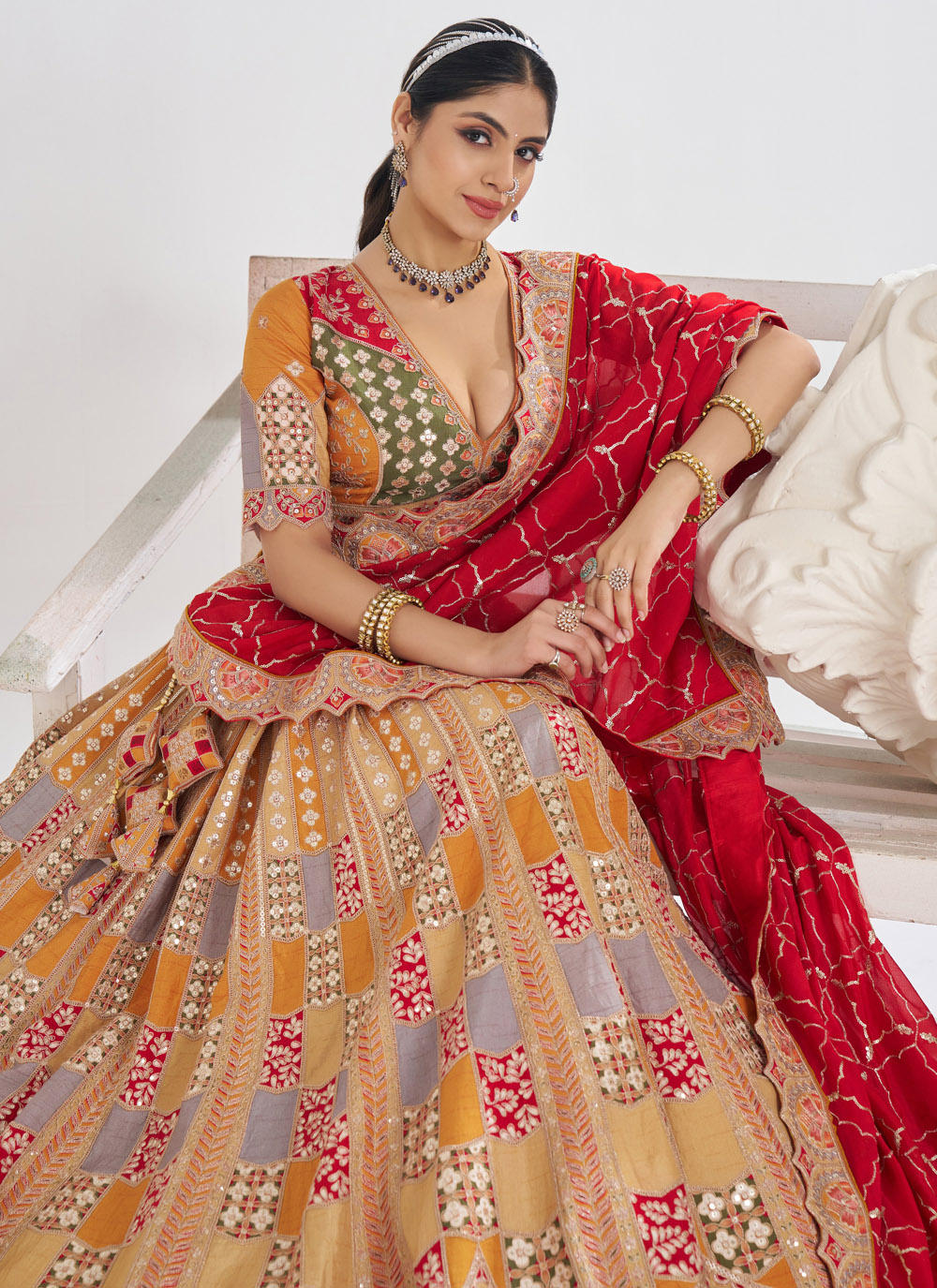 Celebrate your wedding in style with this exquisite mustard lehenga choli, designed in premium Dola silk and enhanced with shimmering sequin detailing. A perfect choice for brides who love contemporary color palettes with ethnic flair. Comes with matching choli and dupatta.