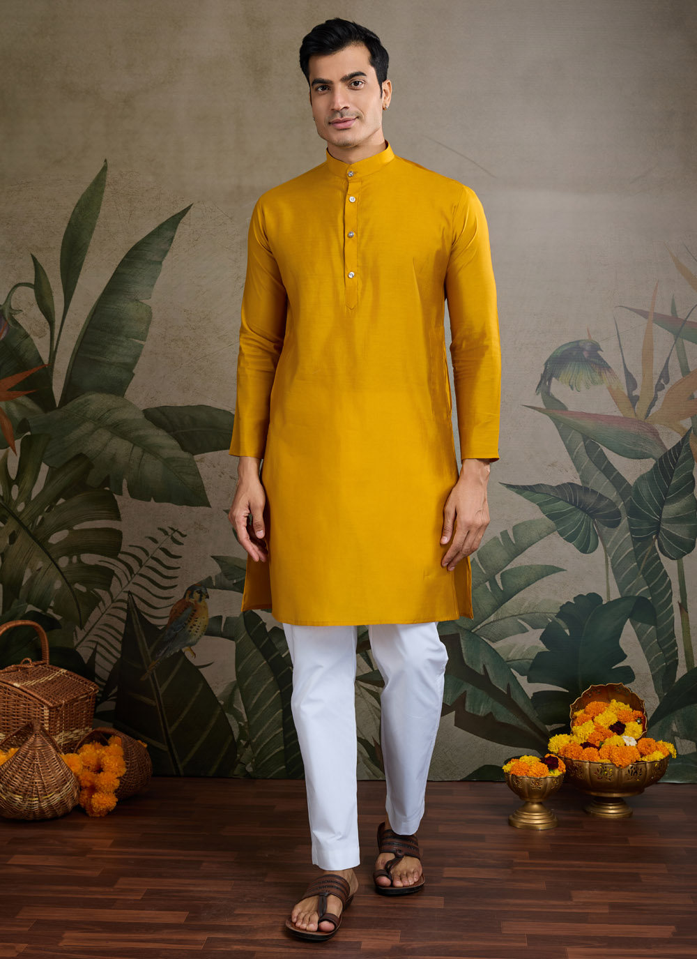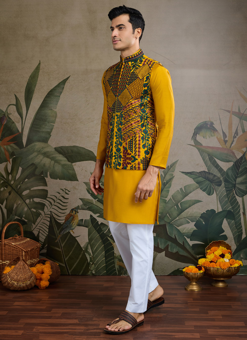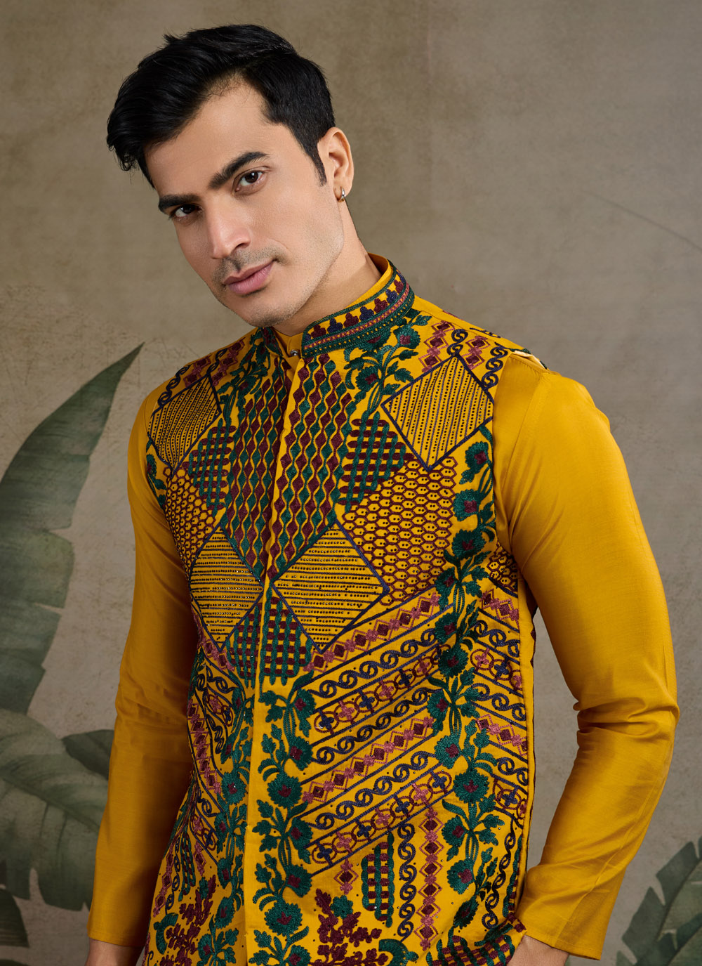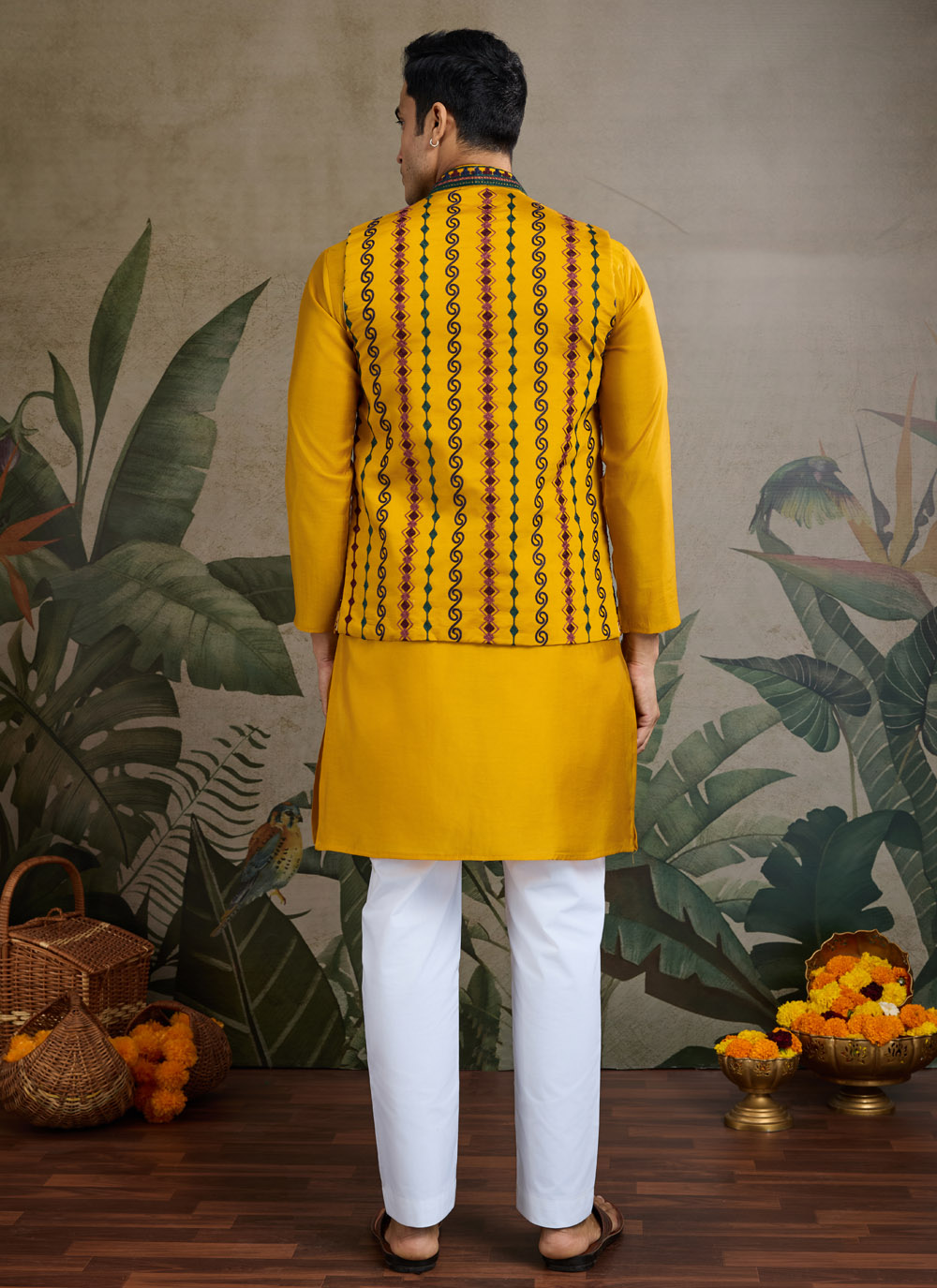 Step into elegance with this Mustard Silk Kurta Pajama Set, adorned with intricate thread embroidery and a stylish jacket. The rich silk fabric offers a luxurious feel, making it an ideal choice for receptions, engagements, and festive gatherings. Pair it with traditional footwear to complete your ethnic look.