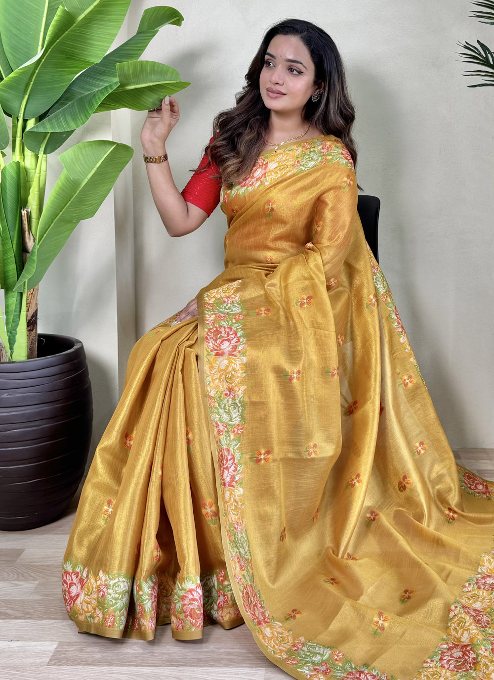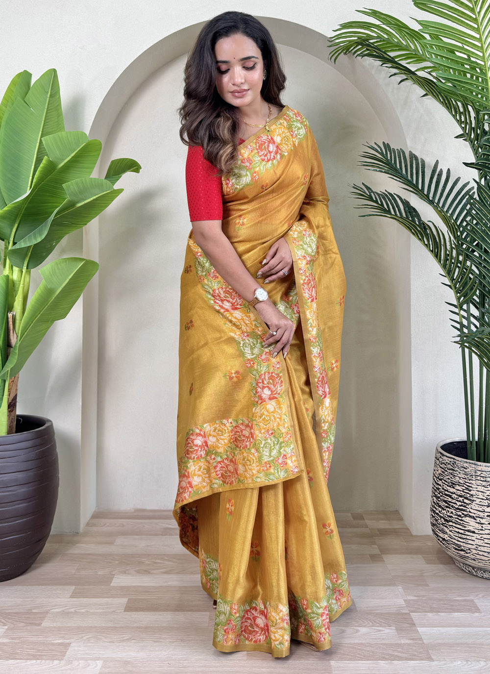 This Mustard Traditional Saree, woven with care in tissue silk and jacquard patterns, glows with ethnic charm. Whether you're attending a wedding or celebrating a festival, it adds warmth and cultural richness to your look. Comes with matching blouse.