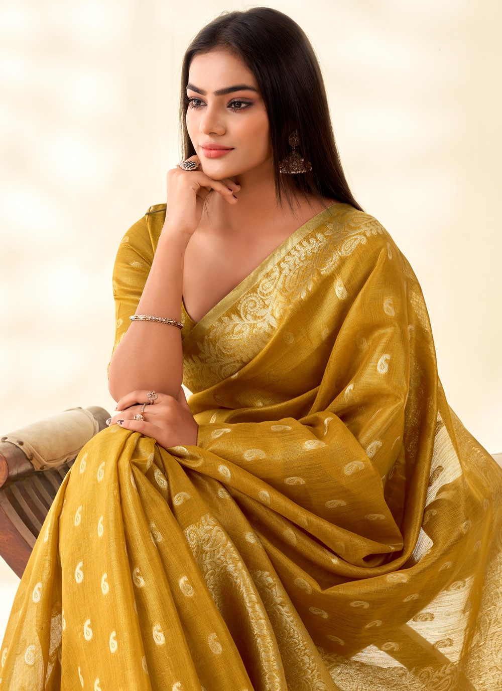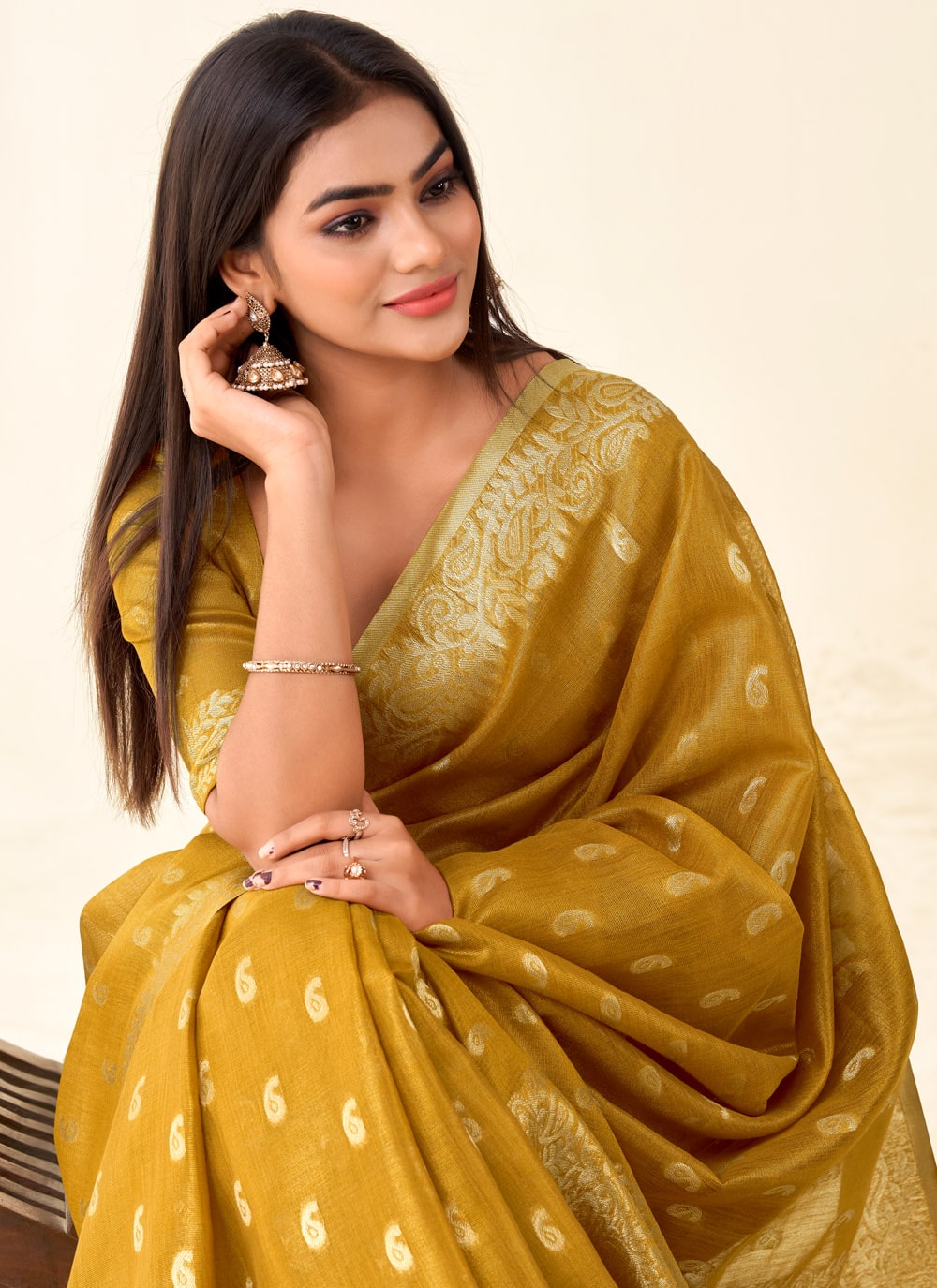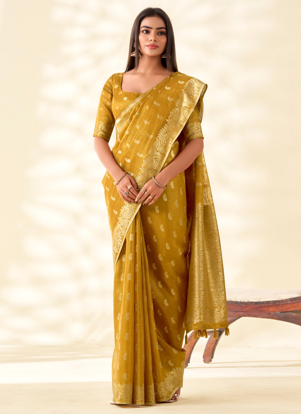 Crafted to perfection, this mustard-hued tissue silk saree features classic zari weaving that radiates ethnic elegance. Its lightweight yet grand appeal makes it suitable for those who wish to stay stylish while embracing traditional roots. Comes with matching blouse.