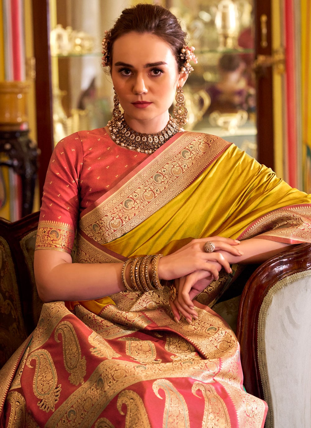 Make a statement with this designer mustard silk saree, adorned with intricate weaving craftsmanship. Ideal for ceremonial occasions, it blends vibrant color with timeless ethnic appeal. Comes with matching blouse.