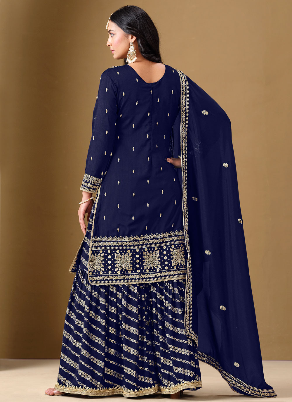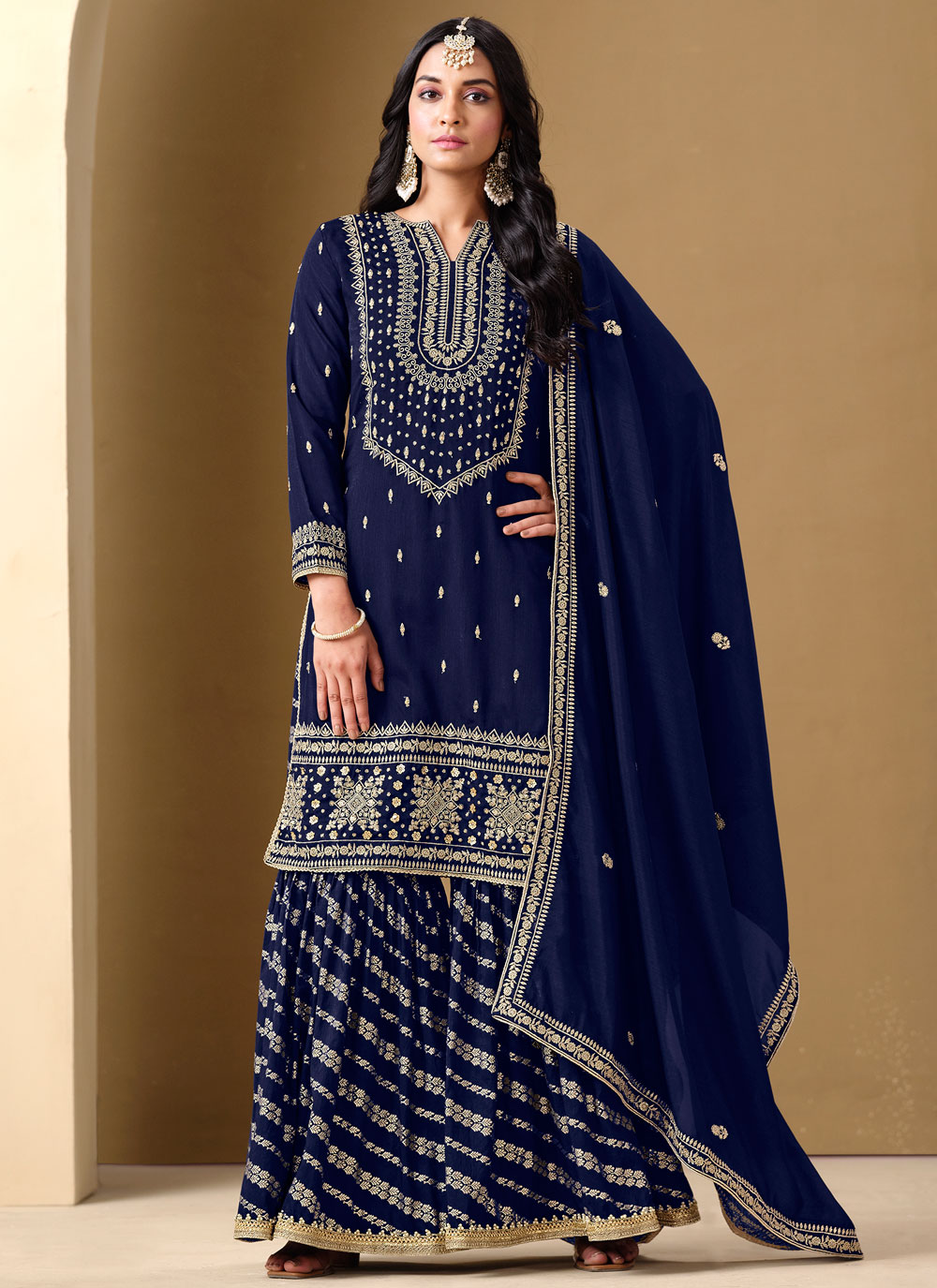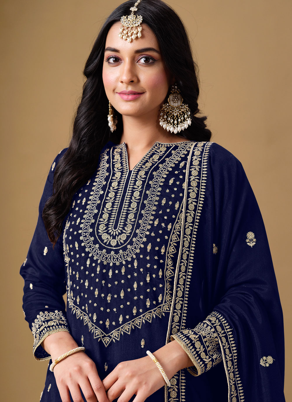 Add a touch of elegance to your wardrobe with this Navy Blue Art Silk Salwar Kameez. Beautifully adorned with intricate embroidery, sequins, and zari work, it comes with a matching bottom and dupatta for a complete, sophisticated look. Perfect for parties, receptions, or any formal event.