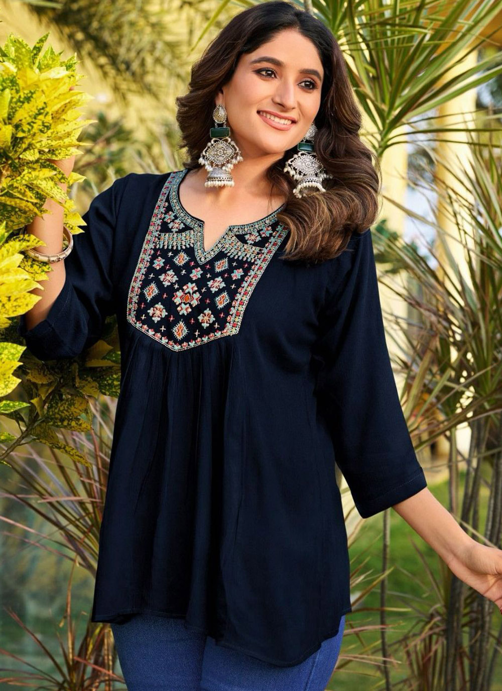 Make a statement with this Navy Blue Rayon Embroidered Kurti, tailored for elegance and ease. The soft and breathable rayon fabric, combined with detailed embroidery, makes this outfit ideal for parties, office events, and family gatherings. Pair it with palazzos or leggings for a flawless ethnic look.