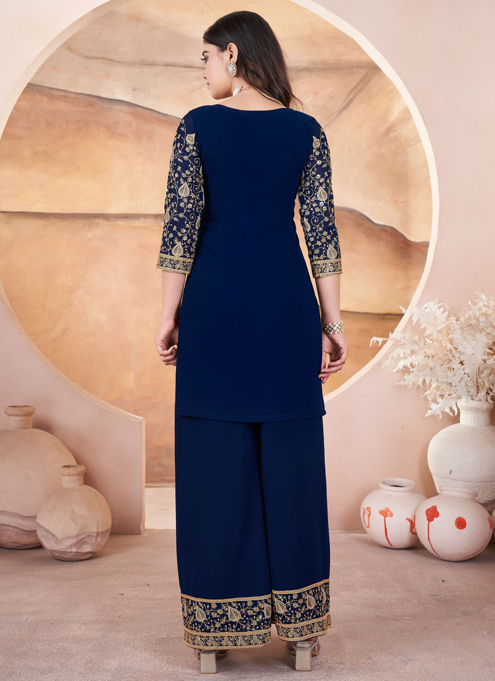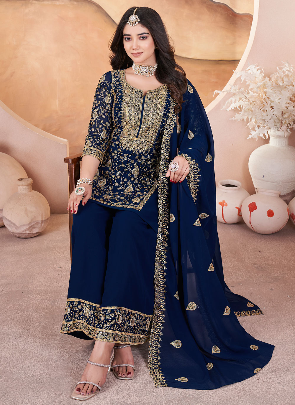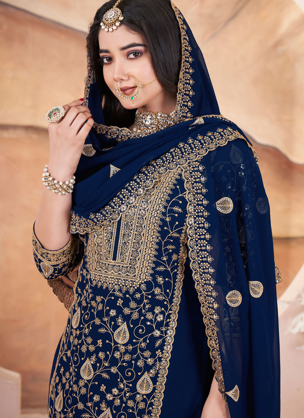 This Navy Blue Georgette Embroidered Readymade Suit comes with a matching bottom and dupatta. Featuring intricate embroidery on soft georgette fabric, it offers elegance and comfort, making it perfect for festive occasions and special events.