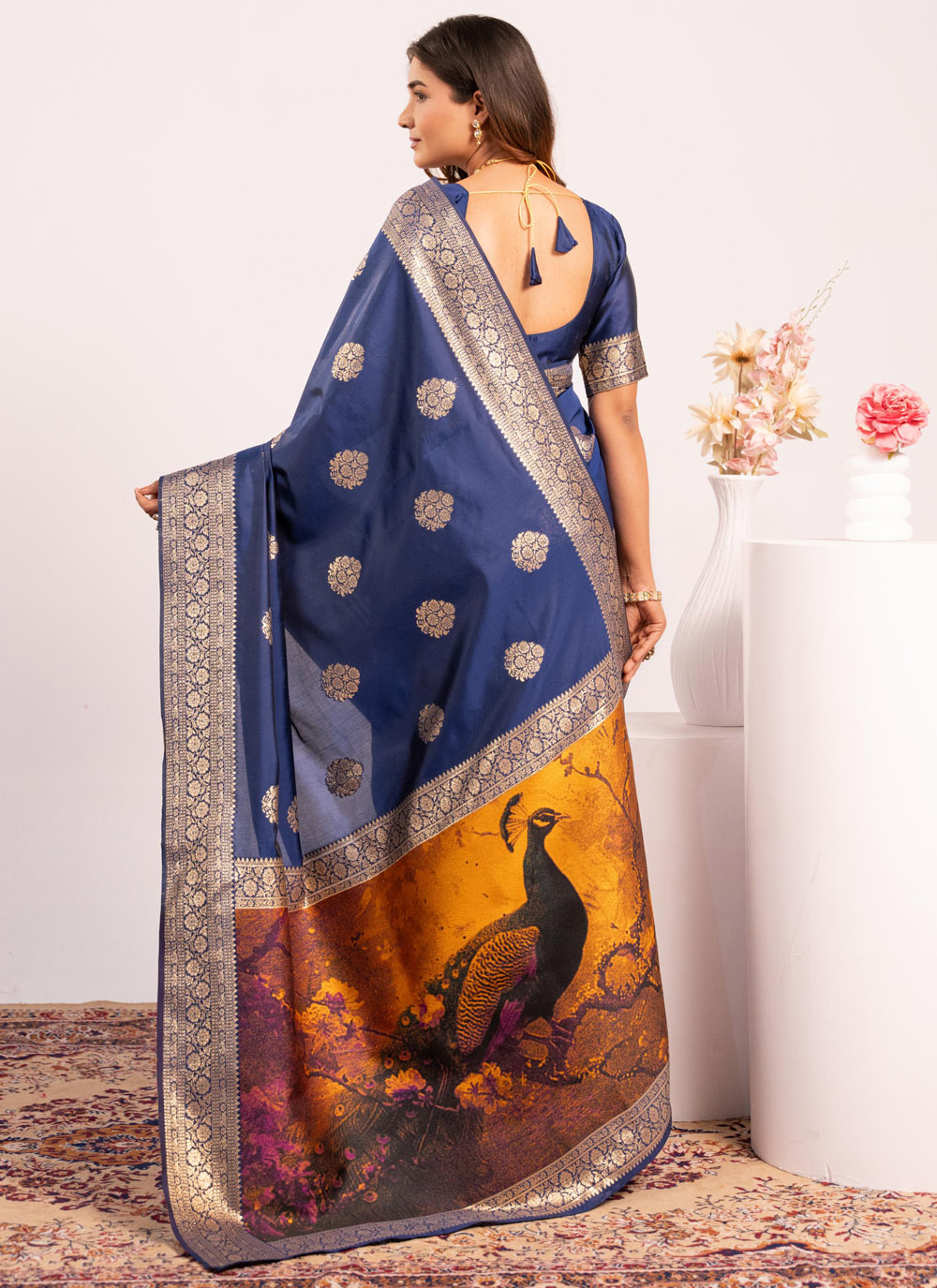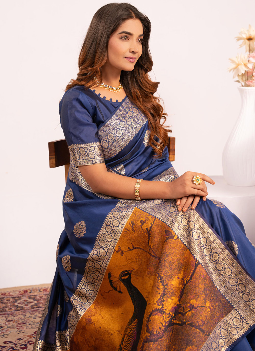 This trendy Banarasi silk saree in navy blue reflects a perfect balance of tradition and contemporary elegance. The resham and zari work enhances its graceful charm, creating a standout outfit for festive and ceremonial occasions. Comes with matching blouse.