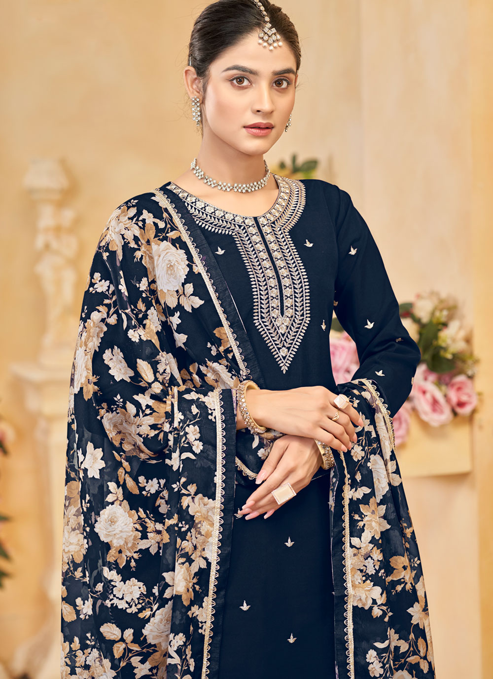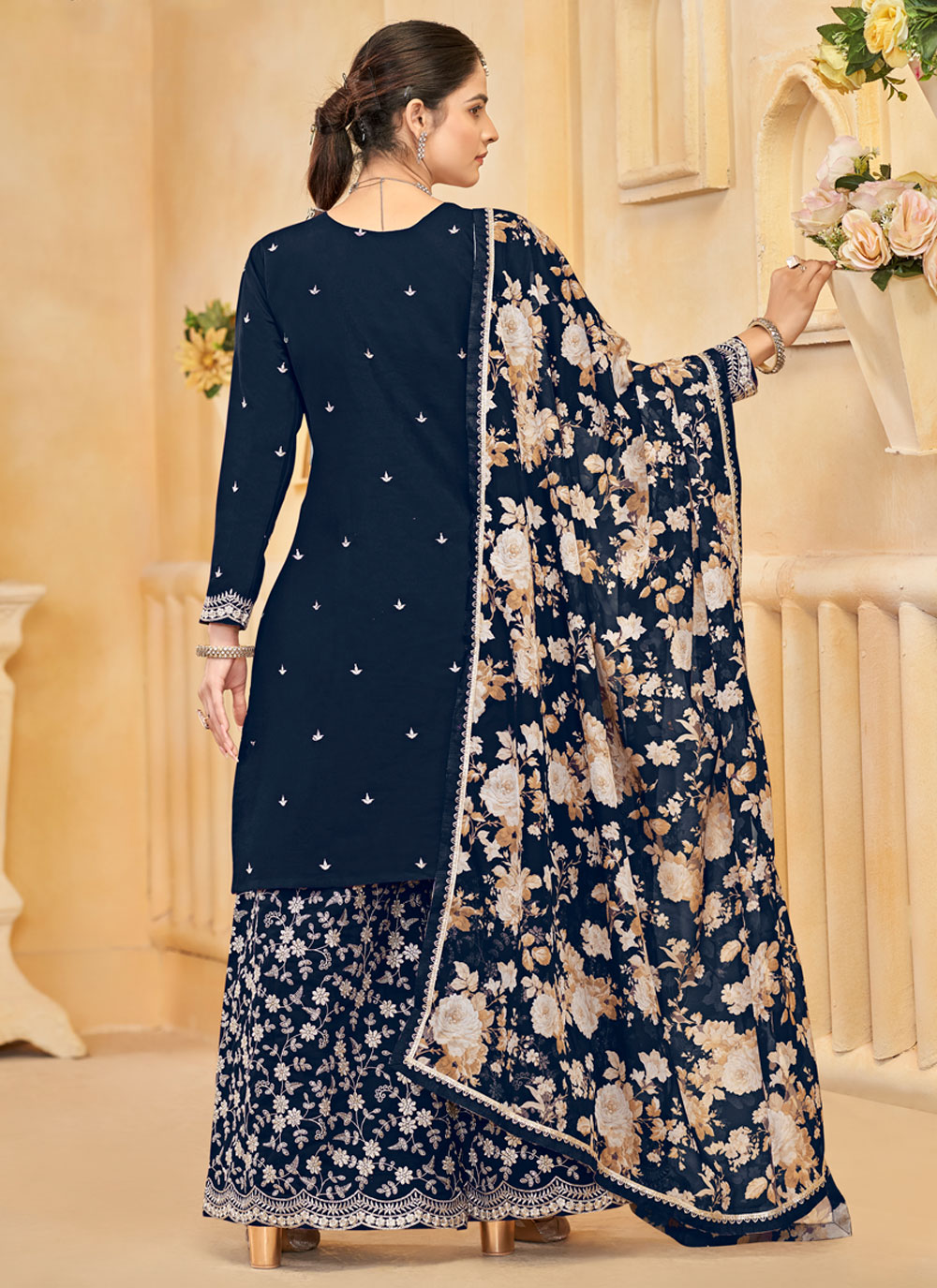 The Navy Blue Silk Embroidered Palazzo Salwar Kameez exudes elegance and charm. Featuring intricate embroidery, this stunning outfit comes complete with a matching bottom and dupatta, making it an ideal choice for special occasions and festive events.