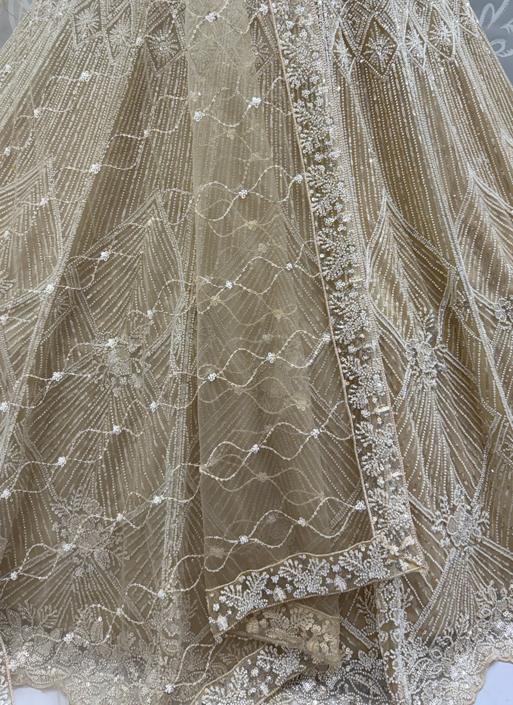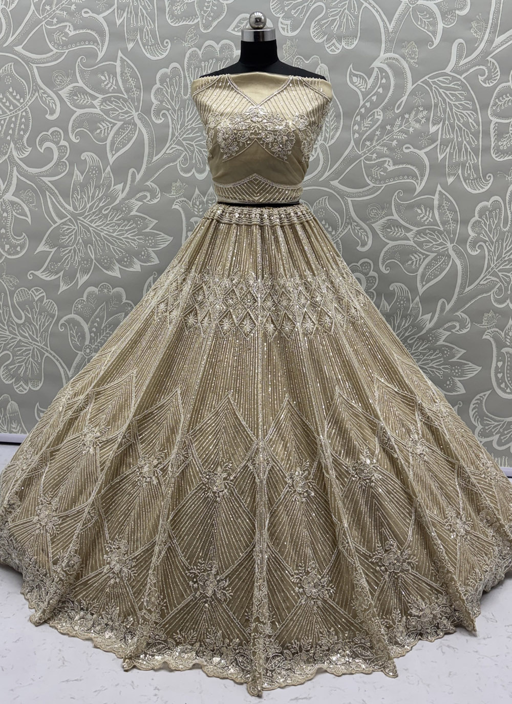 Celebrate in royal style with this Net Dori Sequins Embroidered Lehenga Choli in gold colour. The handcrafted embroidery and shimmering accents add depth and elegance to the flowy net silhouette. Ideal for reception and celebrations. Comes with matching choli and dupatta.