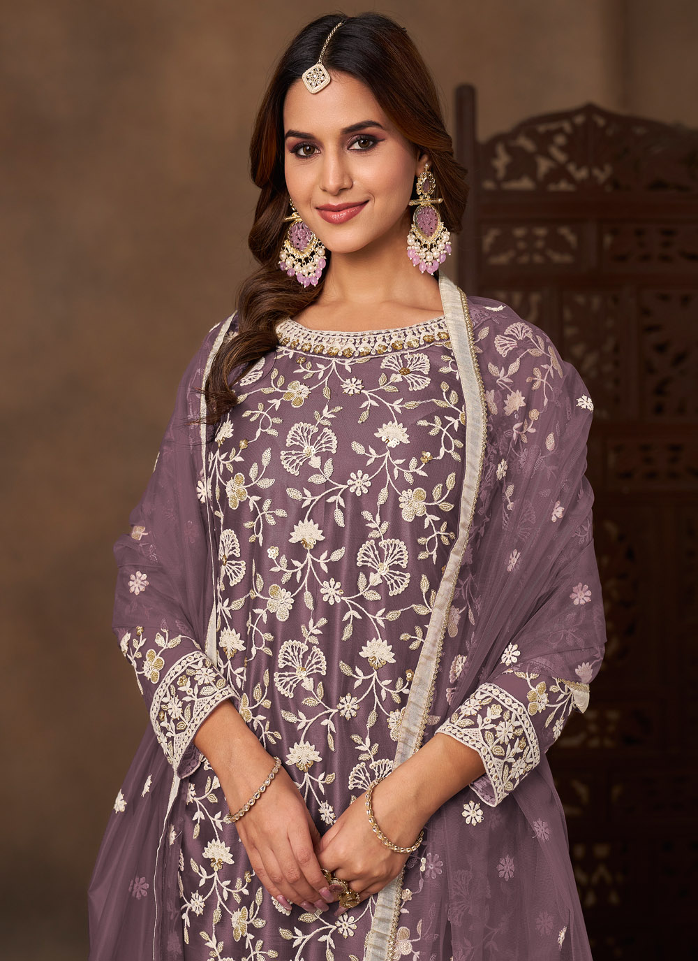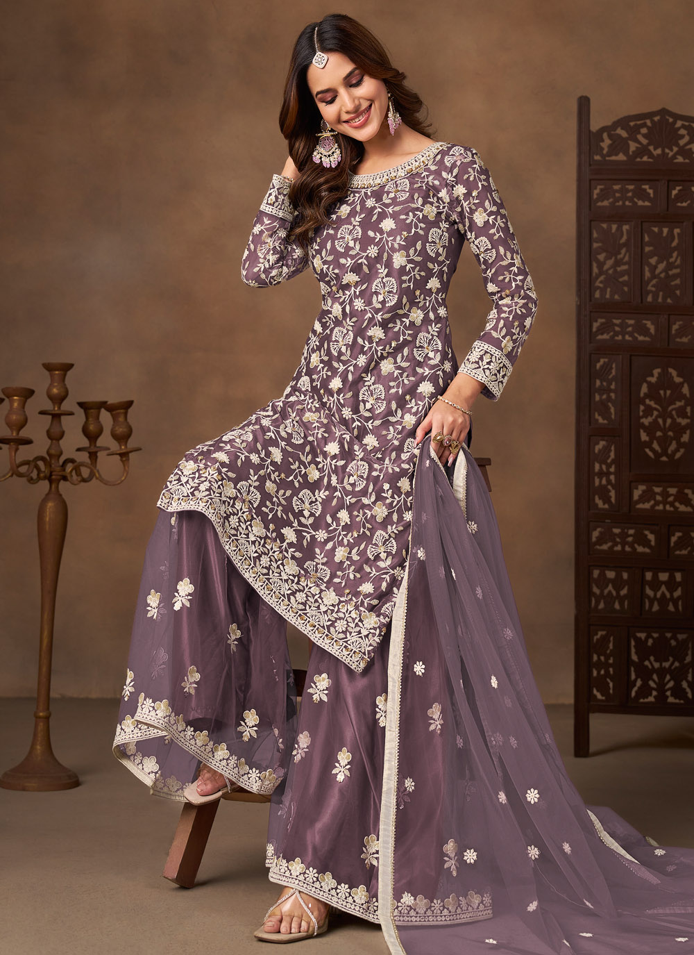 Designed for women who love wearable festive fashion, this lavender embroidered palazzo suit presents a graceful combination of net fabric and thoughtful stitching. The embroidery captures attention with its neat finish while the colour keeps the look sophisticated. Comes with matching bottom and dupatta