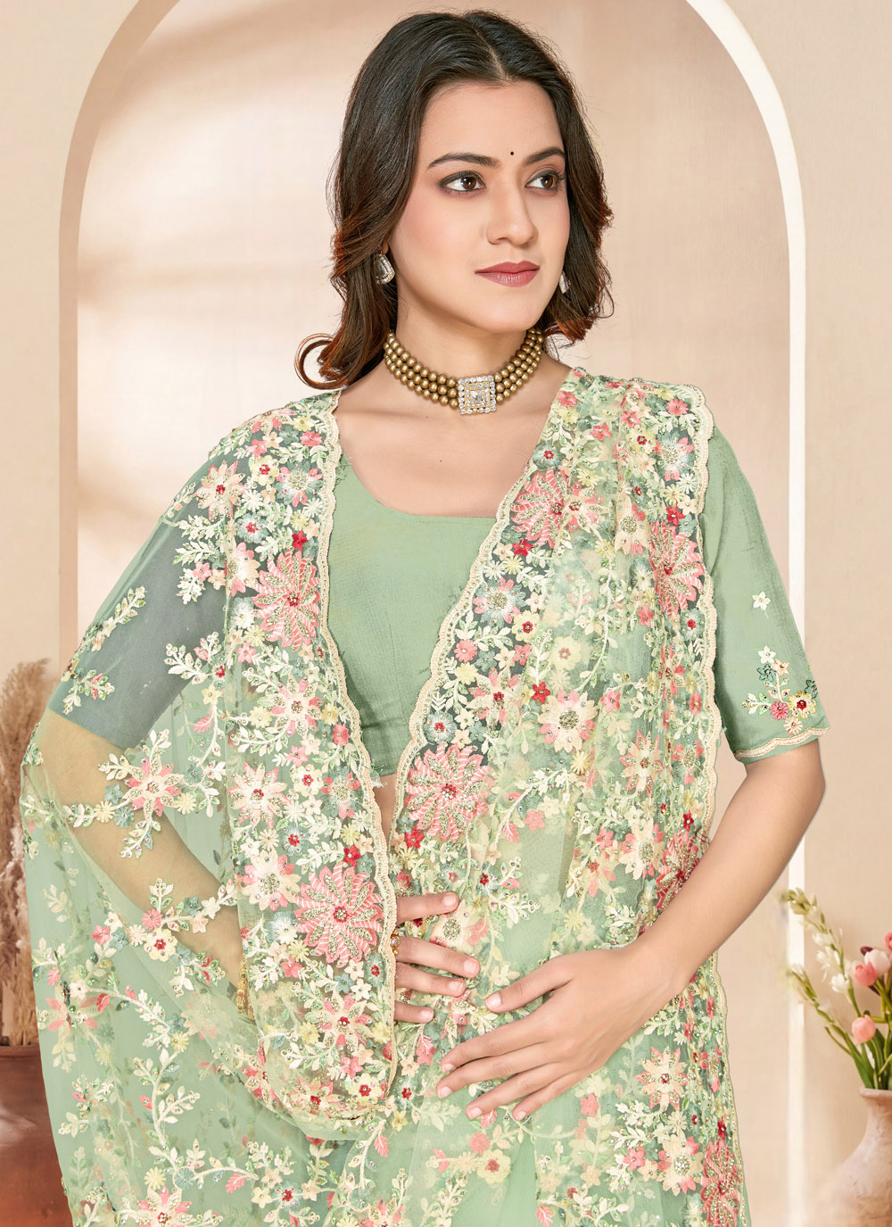 Enhance your ethnic elegance with this net green zarkan stone resham embroidered classic saree, crafted to deliver timeless beauty. The lightweight net fabric offers a graceful drape, while the rich resham embroidery adds depth and intricate detail. Comes with matching blouse.