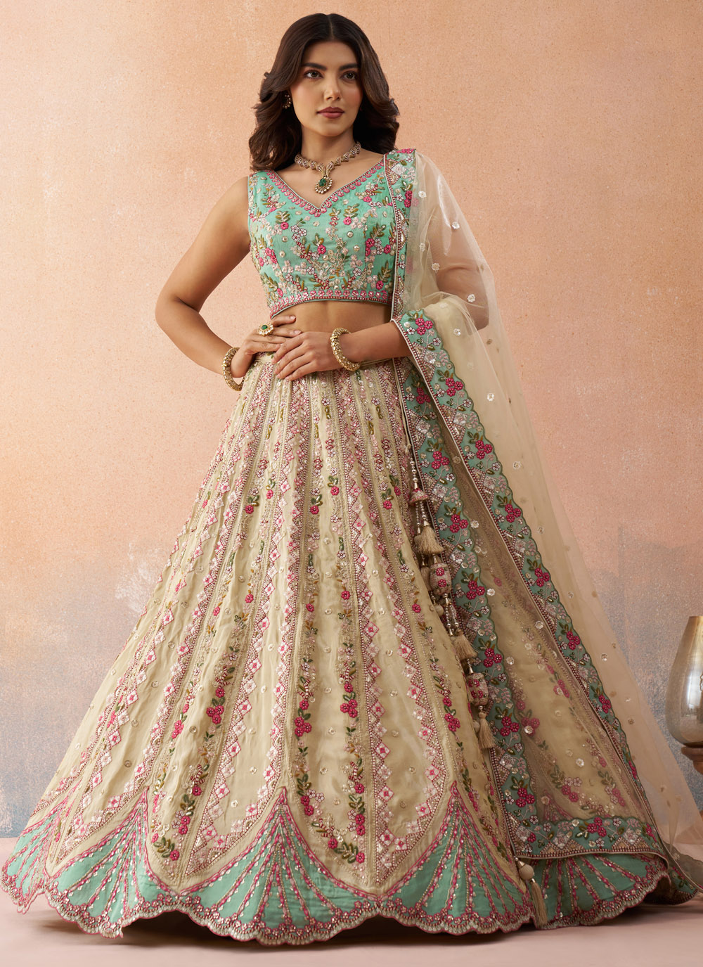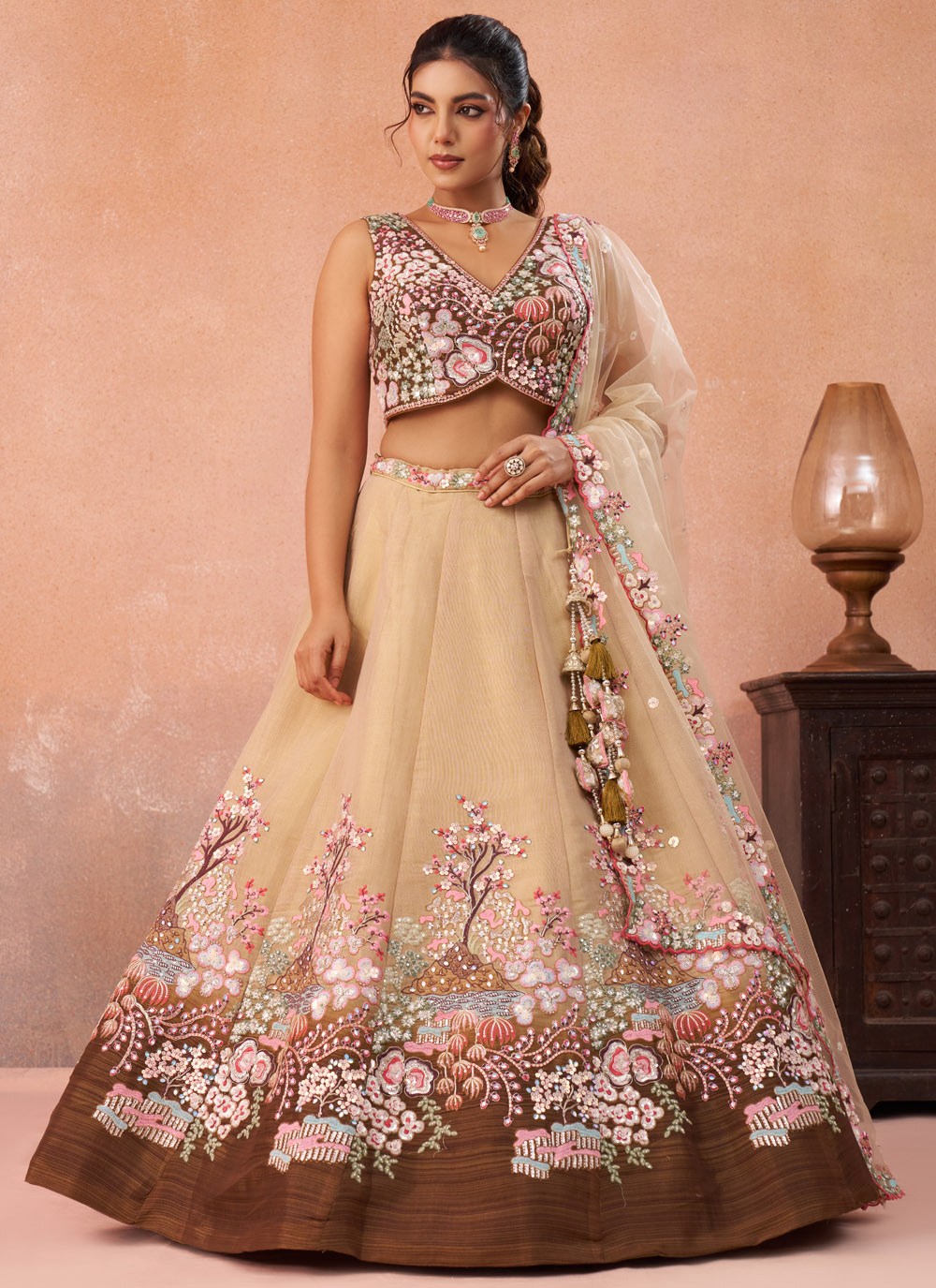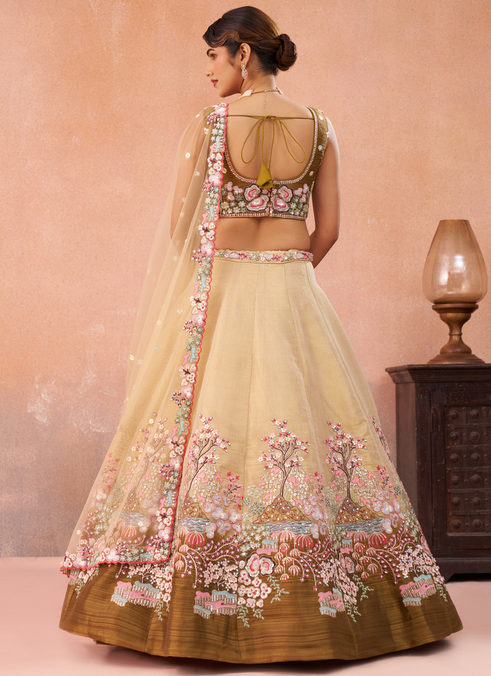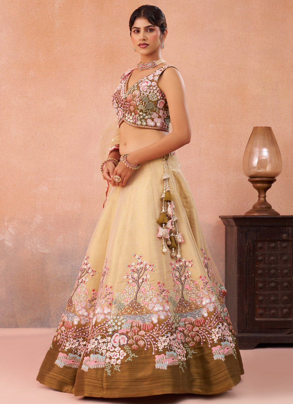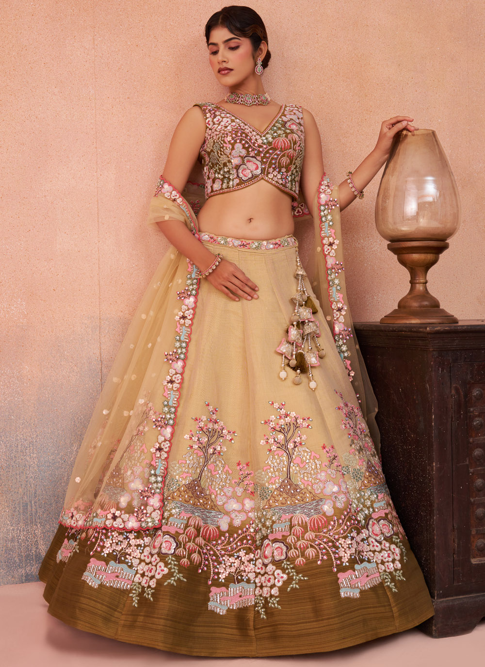 Bring vibrant elegance to your festive wardrobe with this Net Mustard Sequins Thread Embroidered Trendy Lehenga Choli. Designed with lightweight net fabric, the lehenga flows beautifully while showcasing intricate thread embroidery enhanced with shimmering sequins. Comes with matching choli and dupatta.