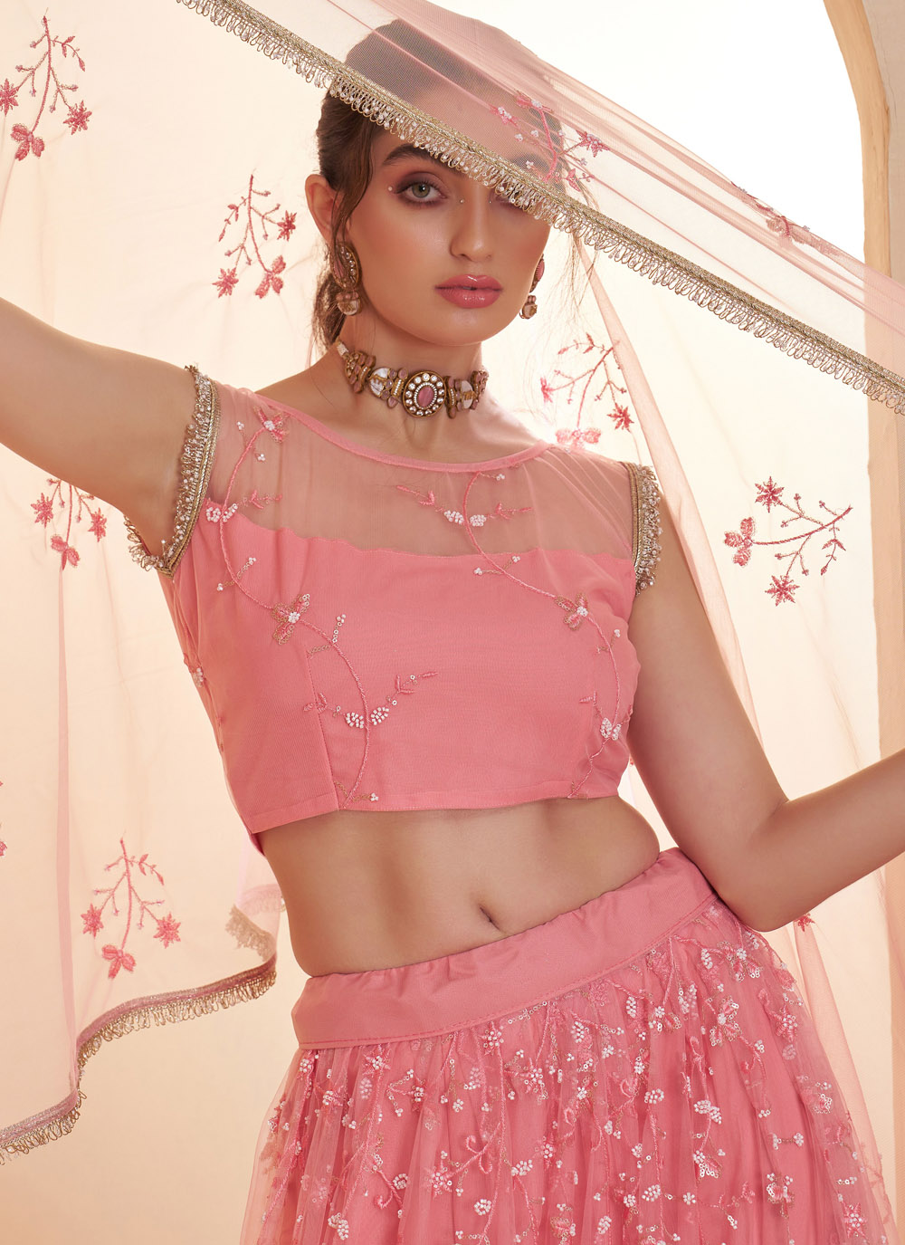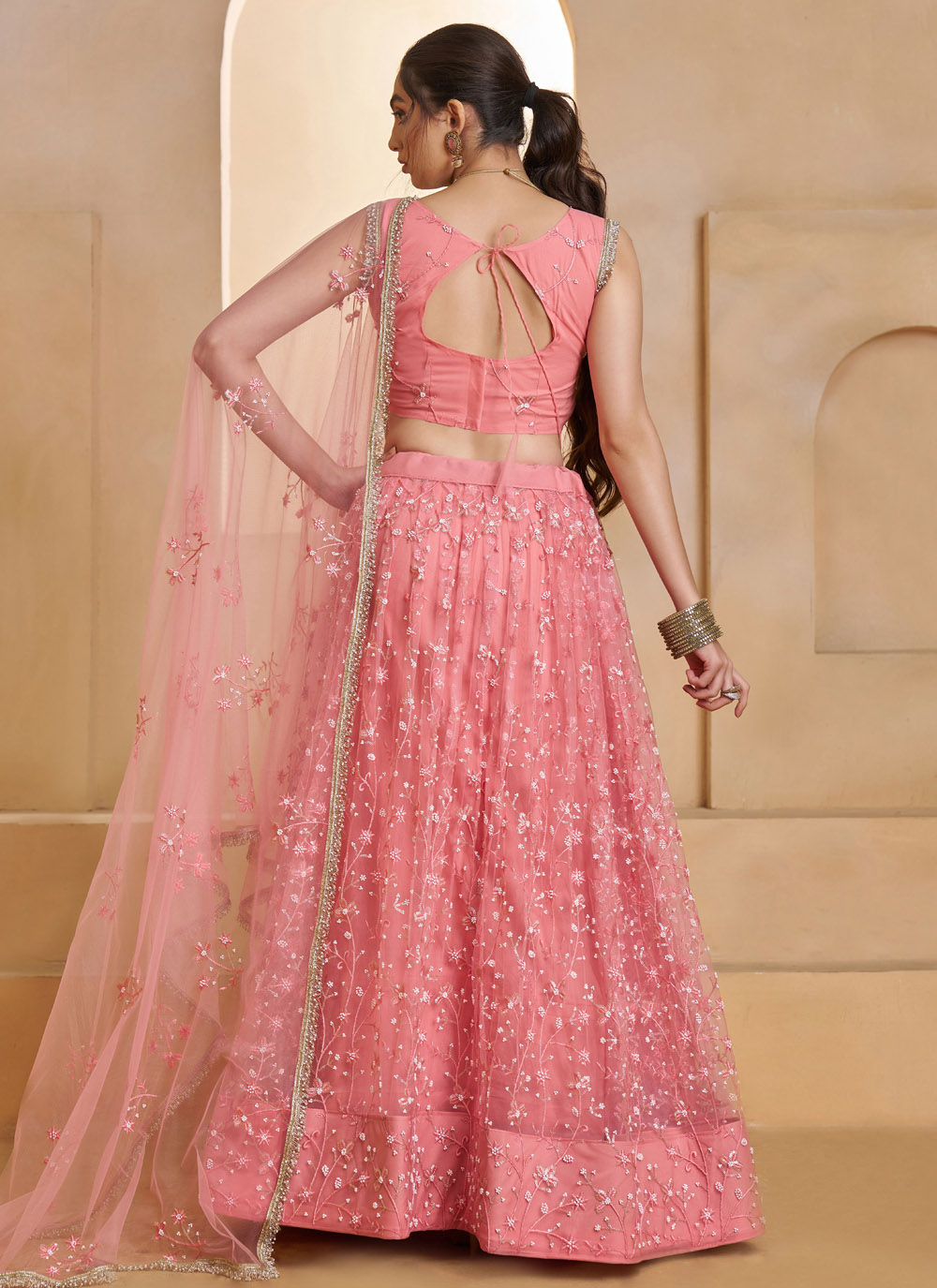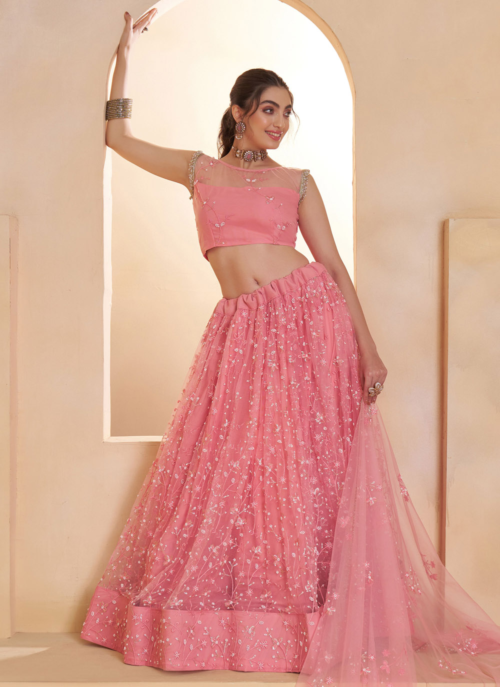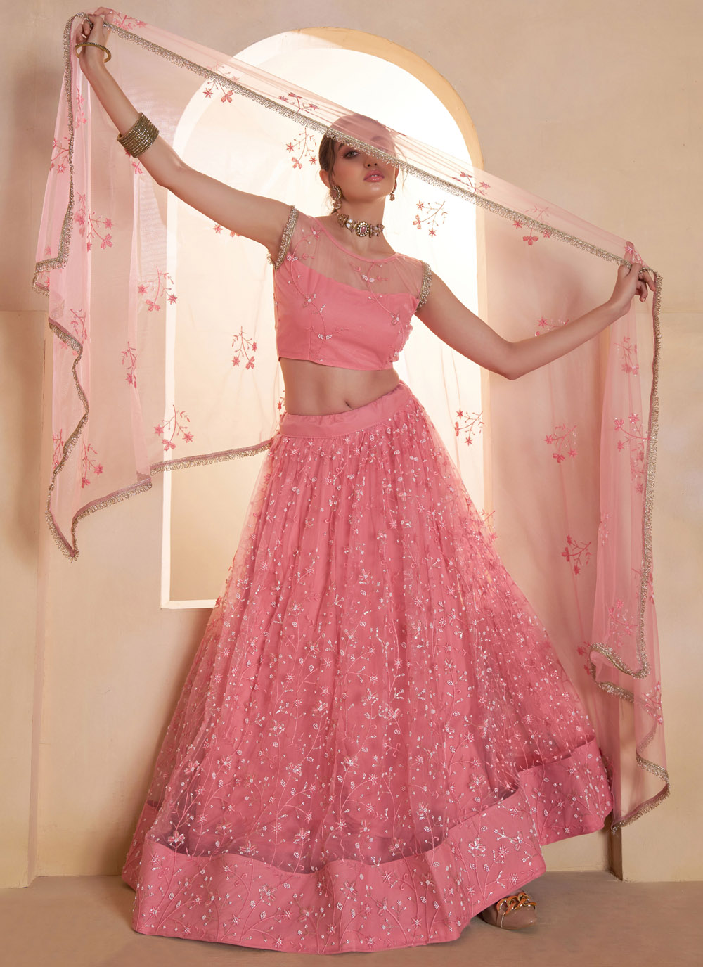 Add a touch of glamour to your celebration with the Net Pink Thread Sequins Embroidered Engagement Lehenga Choli. Crafted with lightweight net fabric, this lehenga choli offers a graceful flare and comfortable wear. Comes with matching choli and dupatta.