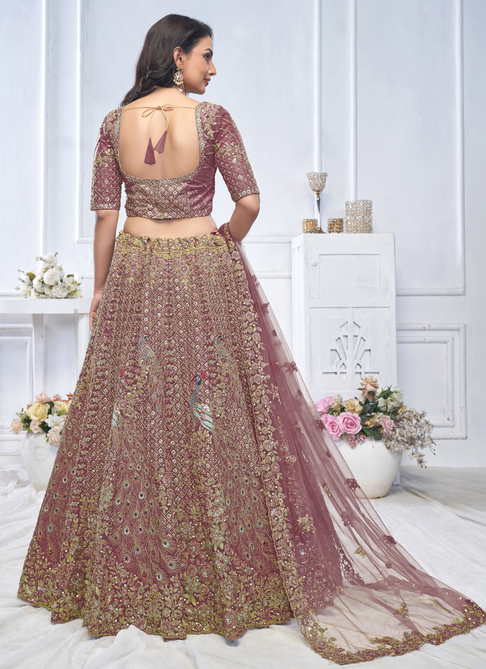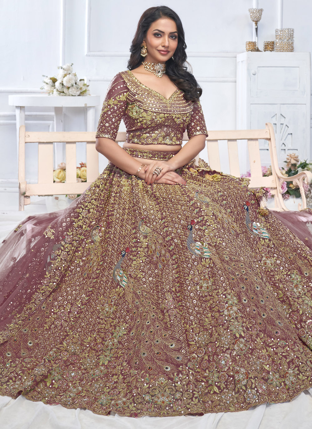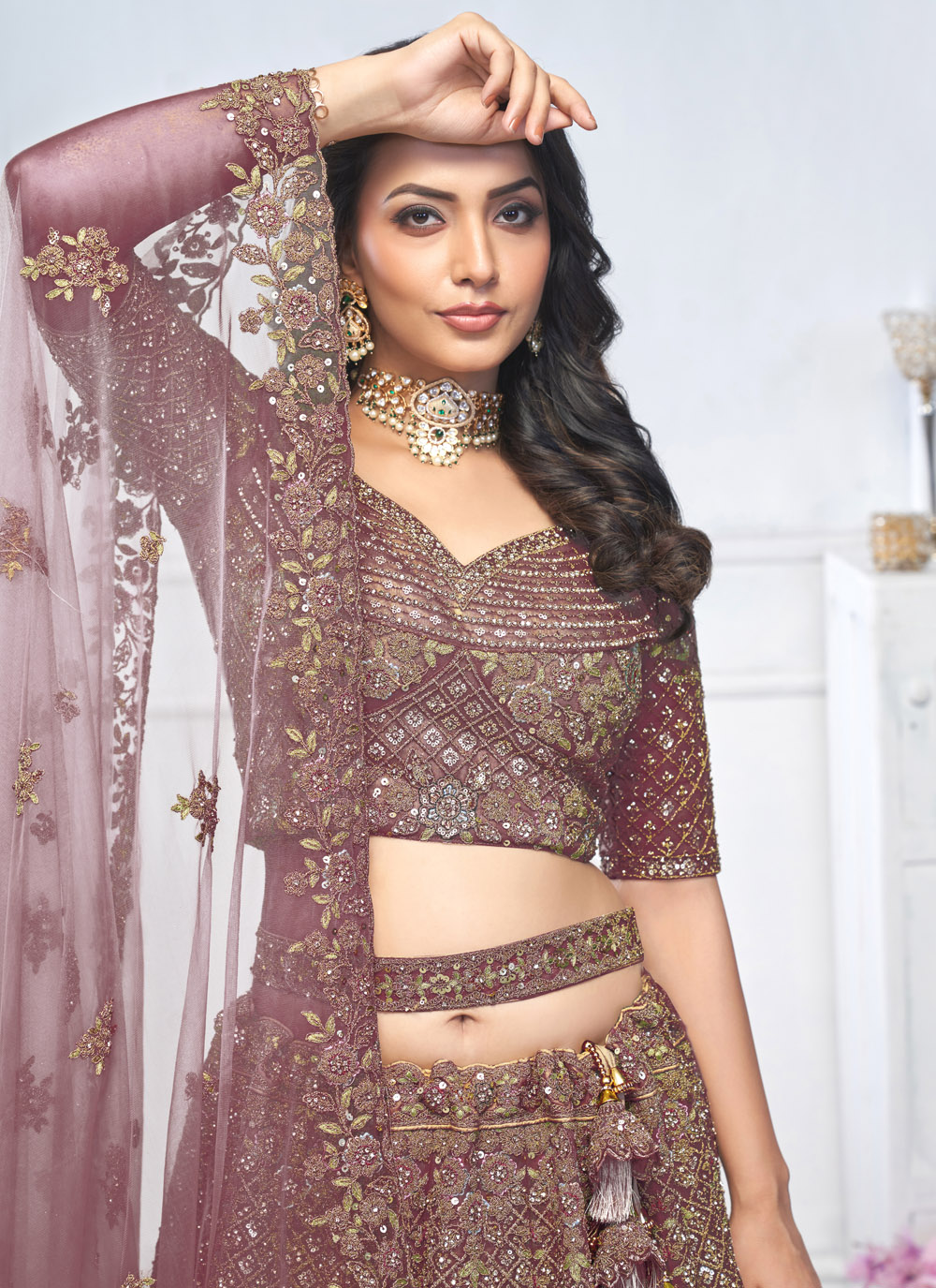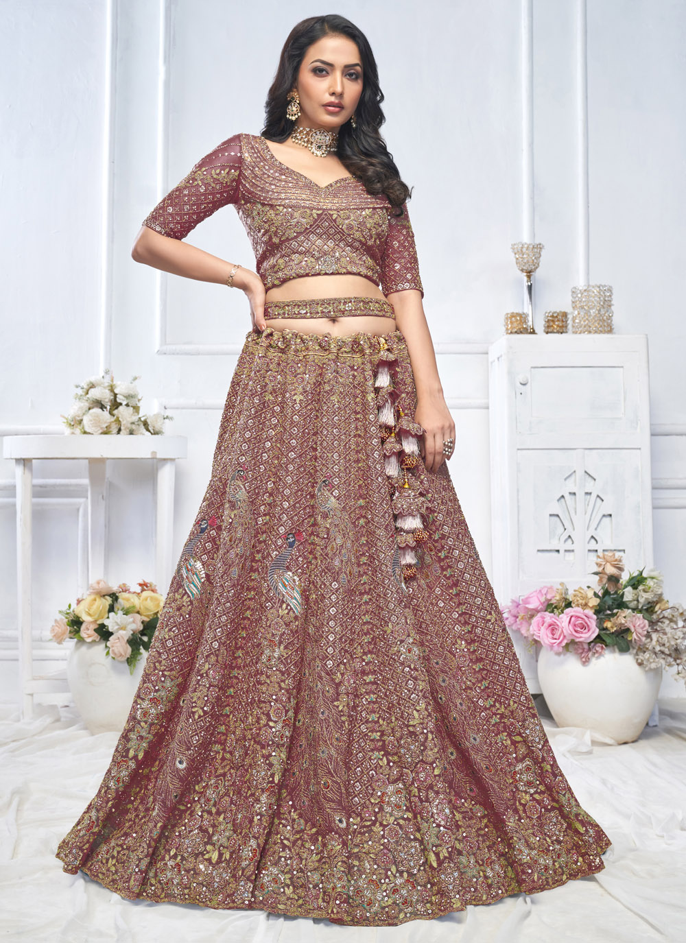 A fusion of tradition and contemporary elegance, this Net Purple Lehenga Choli is designed for women who love detailed craftsmanship. Featuring all-over sequins, delicate stone work, and intricate zari motifs, the A-line silhouette enhances movement and flow, making it an excellent choice for grand engagements, receptions, and gala events. Comes with matching choli and dupatta.