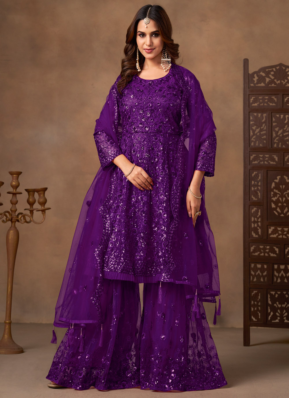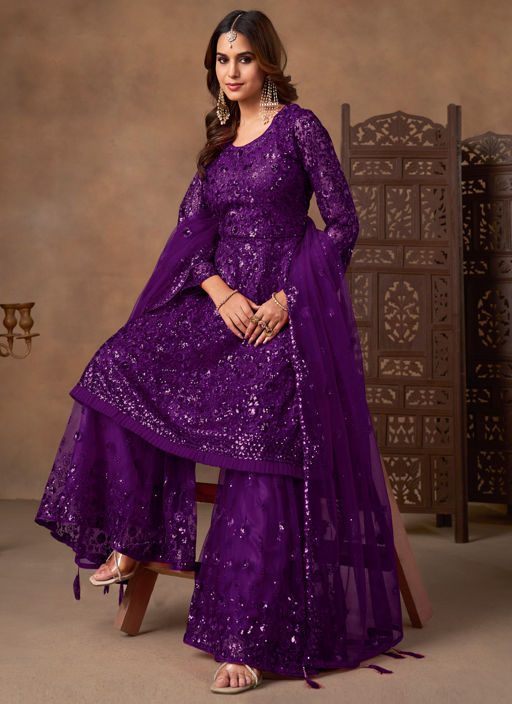 Enhance your festive wardrobe with this purple net salwar suit highlighted by detailed sequins embroidery. The palazzo bottom adds comfort and trendiness while maintaining a classy ethnic appeal. Comes with matching bottom and dupatta.