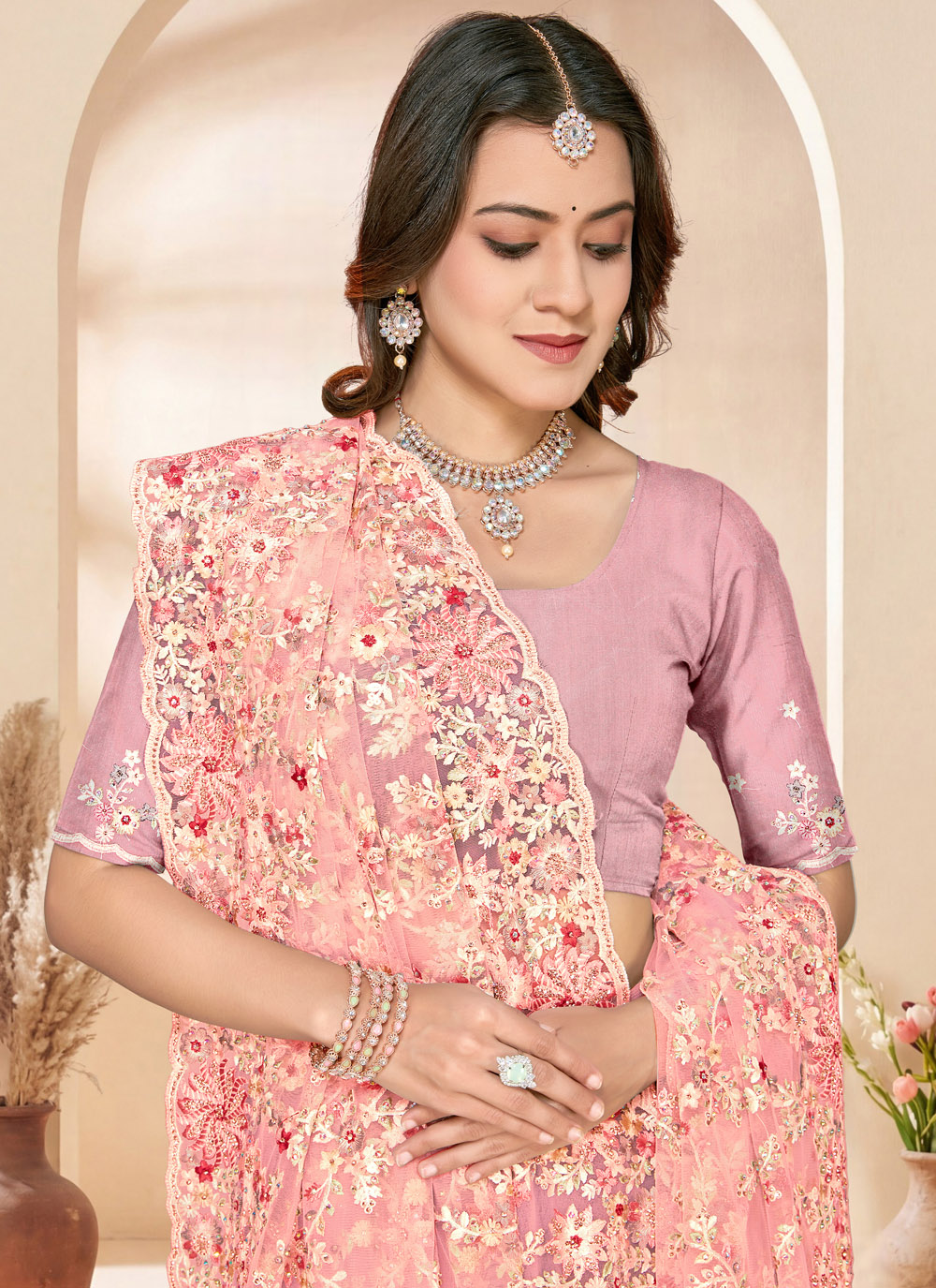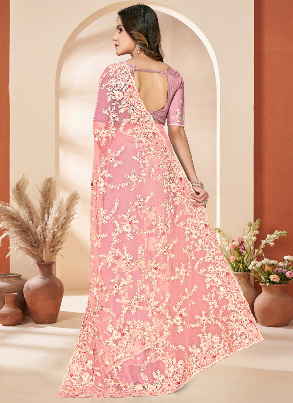 Crafted for women who appreciate modern ethnic fashion, this peach resham embroidered net saree offers a perfect balance of elegance and comfort. The beautiful embroidery and sparkling embellishments create a designer finish. Comes with matching blouse.