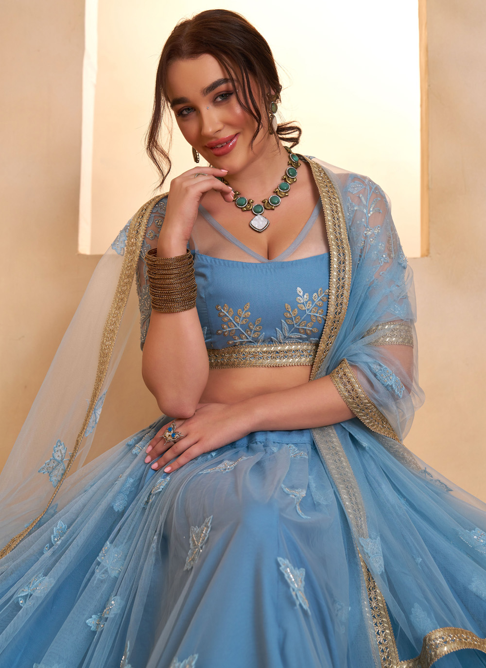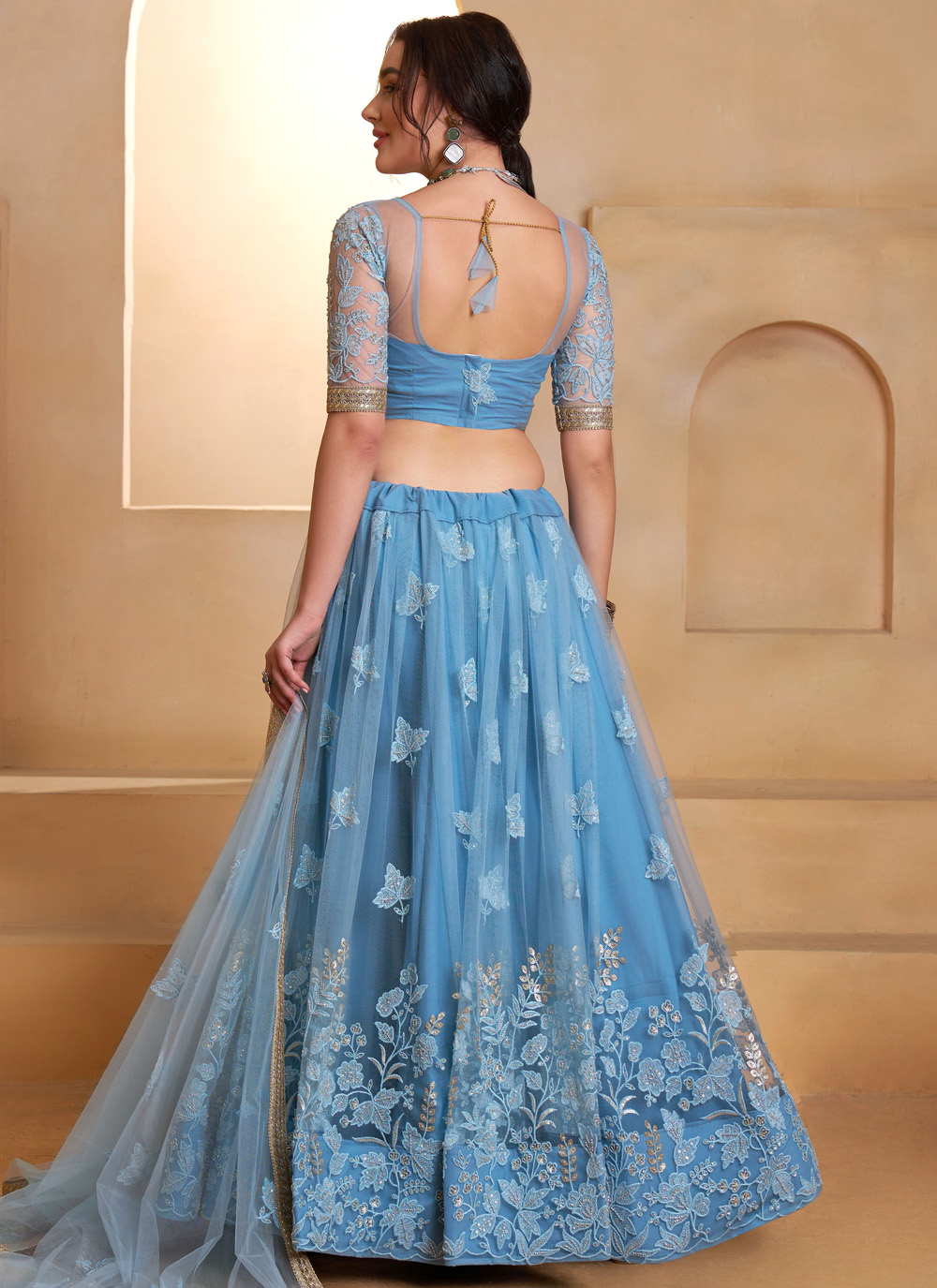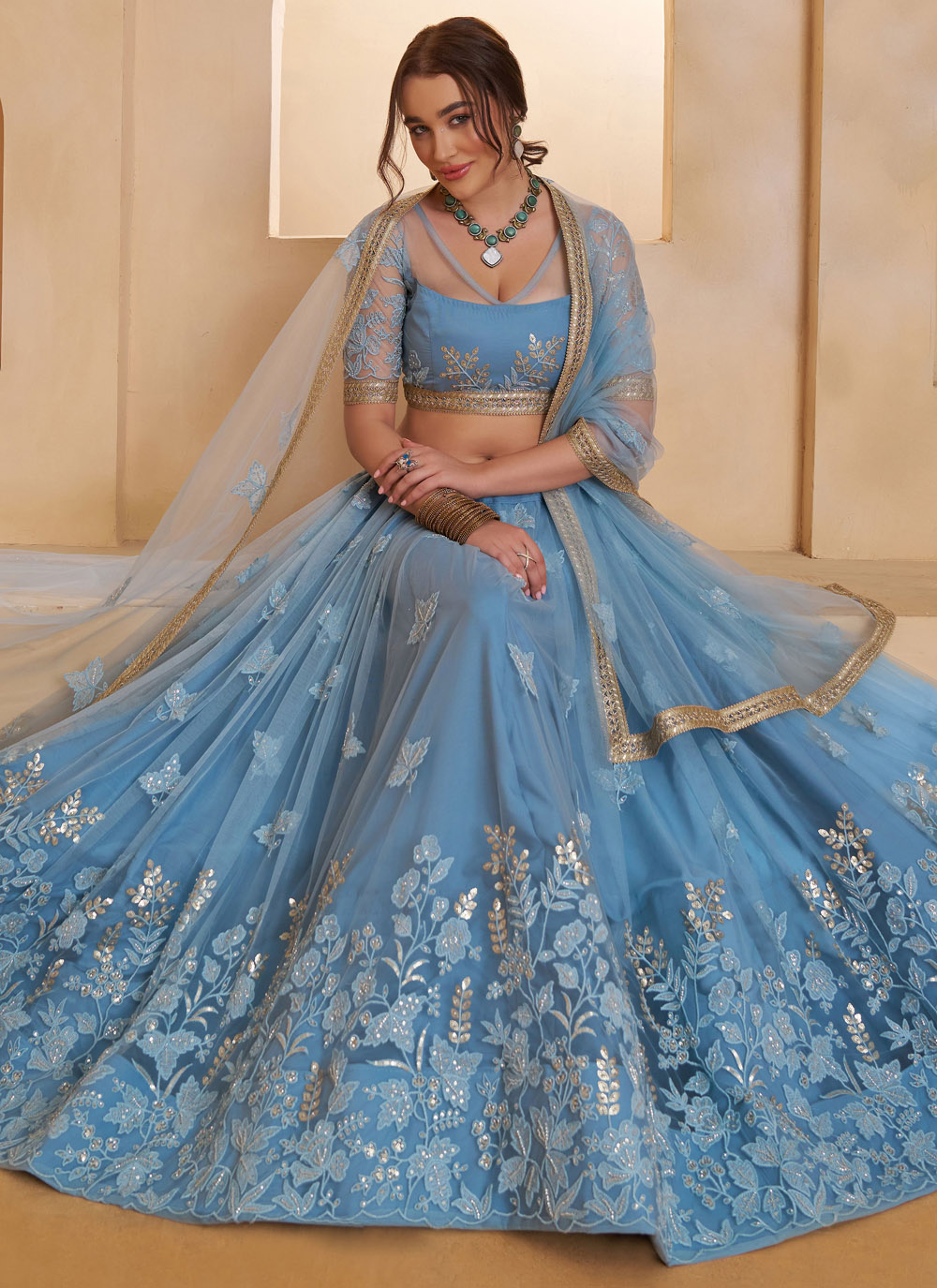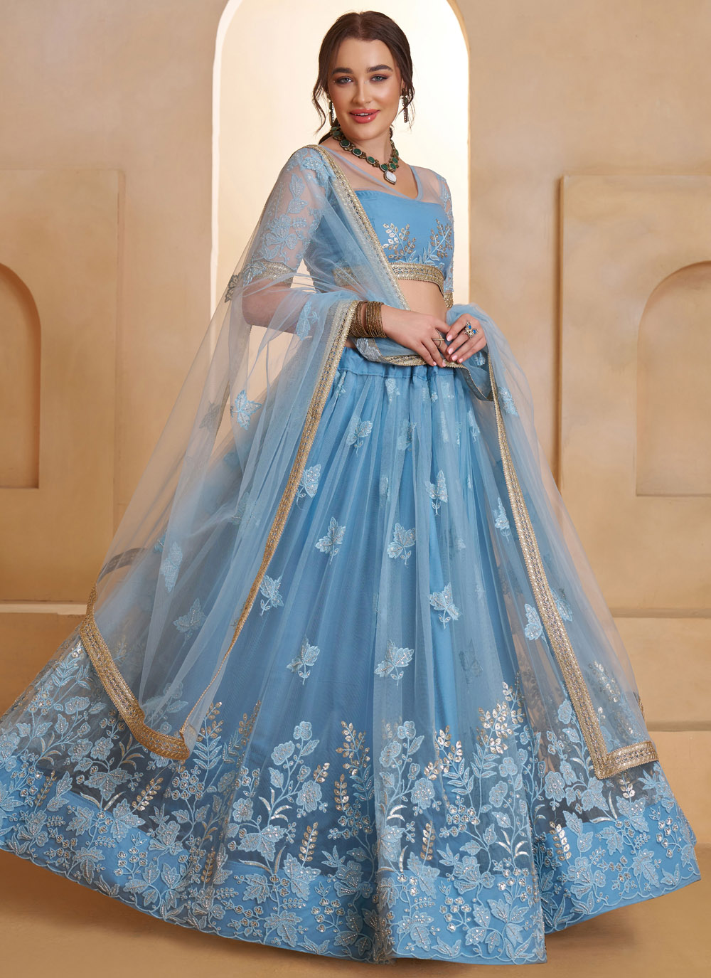 Add a modern ethnic charm to your collection with the Net Sequins Embroidered Aqua Blue Designer Lehenga Choli. The fine net fabric gives a soft and flowing look, while the carefully crafted sequins embroidery creates a designer finish. Comes with matching choli and dupatta.