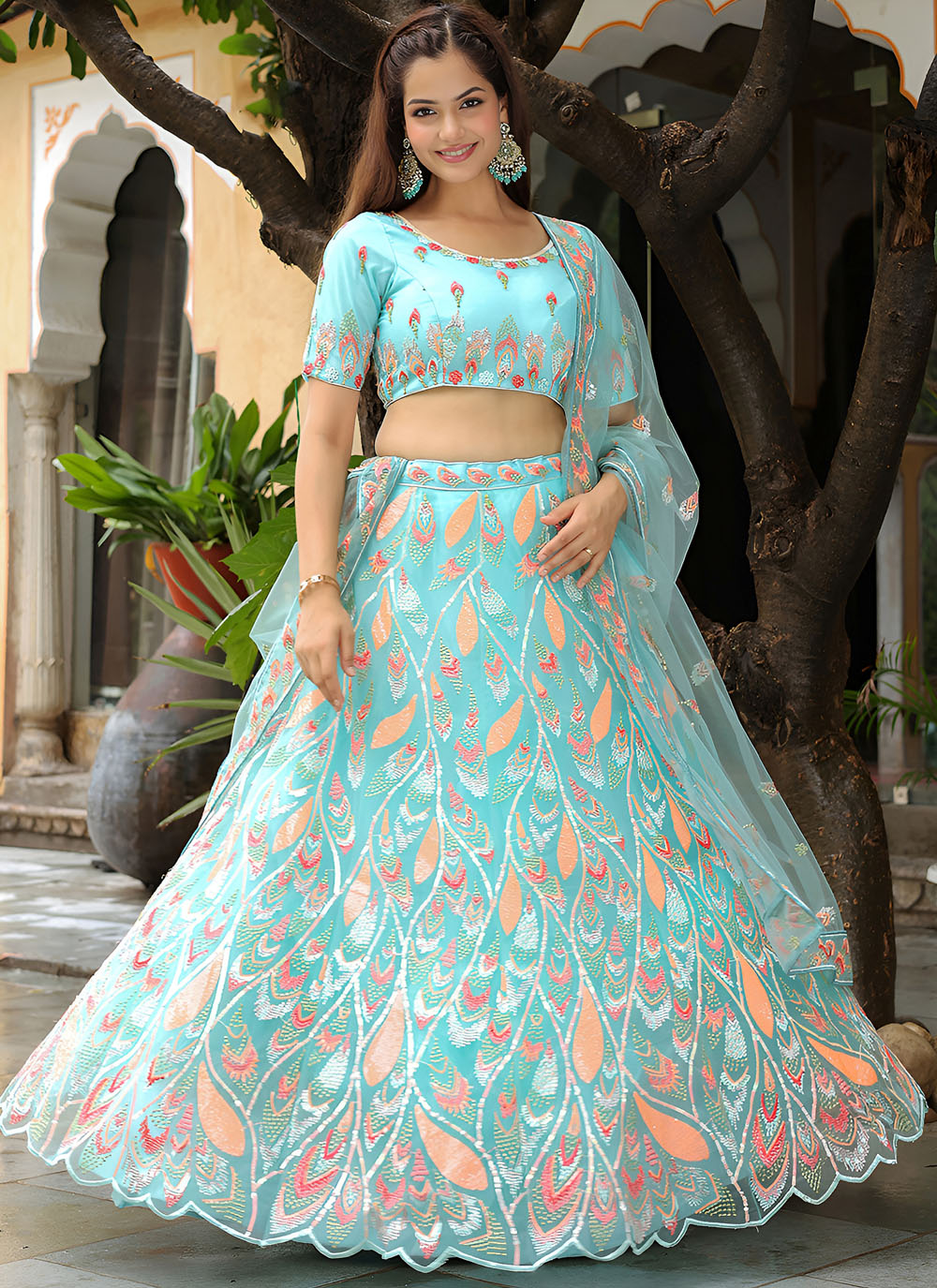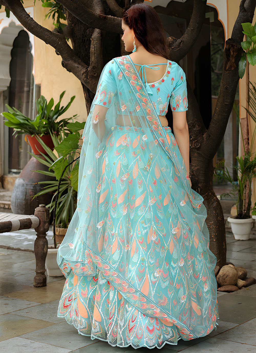 Celebrate in style with this stunning aqua blue lehenga choli, crafted from delicate net and adorned with detailed sequins embroidery. Designed especially for sangeets and pre-wedding festivities. Comes with matching choli and dupatta.