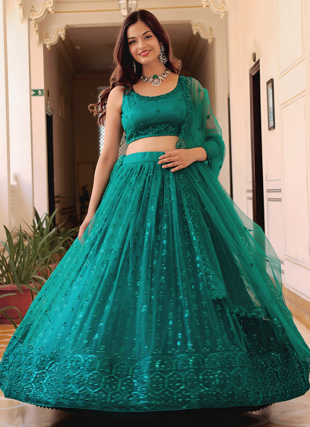 Step into sophistication with this Designer Net Lehenga Choli in Teal and Green, featuring detailed pearls, sequins, and thread work. Ideal for sangeet ceremonies, festive celebrations and traditional functions, it combines modern style with ethnic charm. Comes with matching choli and dupatta.