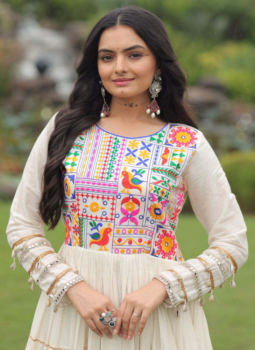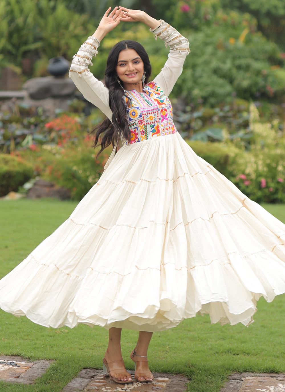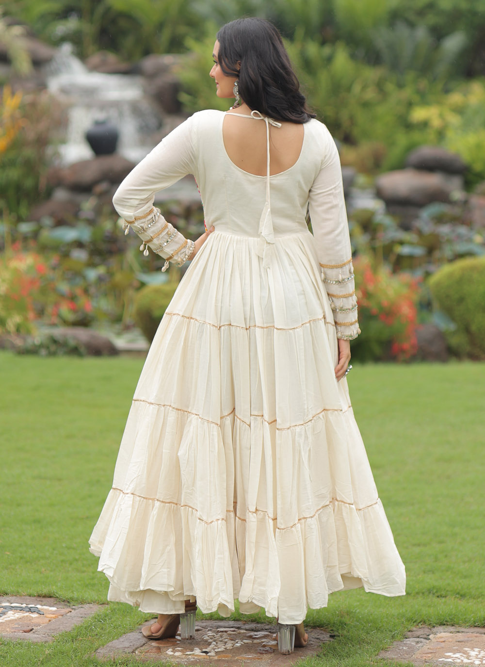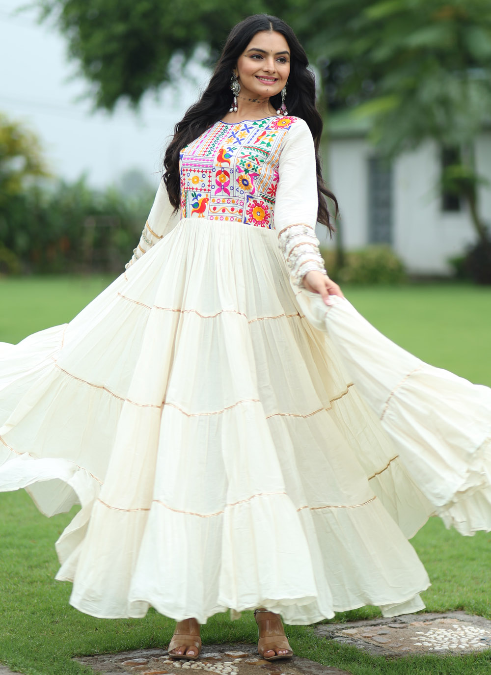 This elegant off-white readymade gown crafted in breathable cotton features fine thread embroidery across the yoke and flare. Comfortable yet stylish. it’s ideal for casual celebrations, family functions, or festivals.