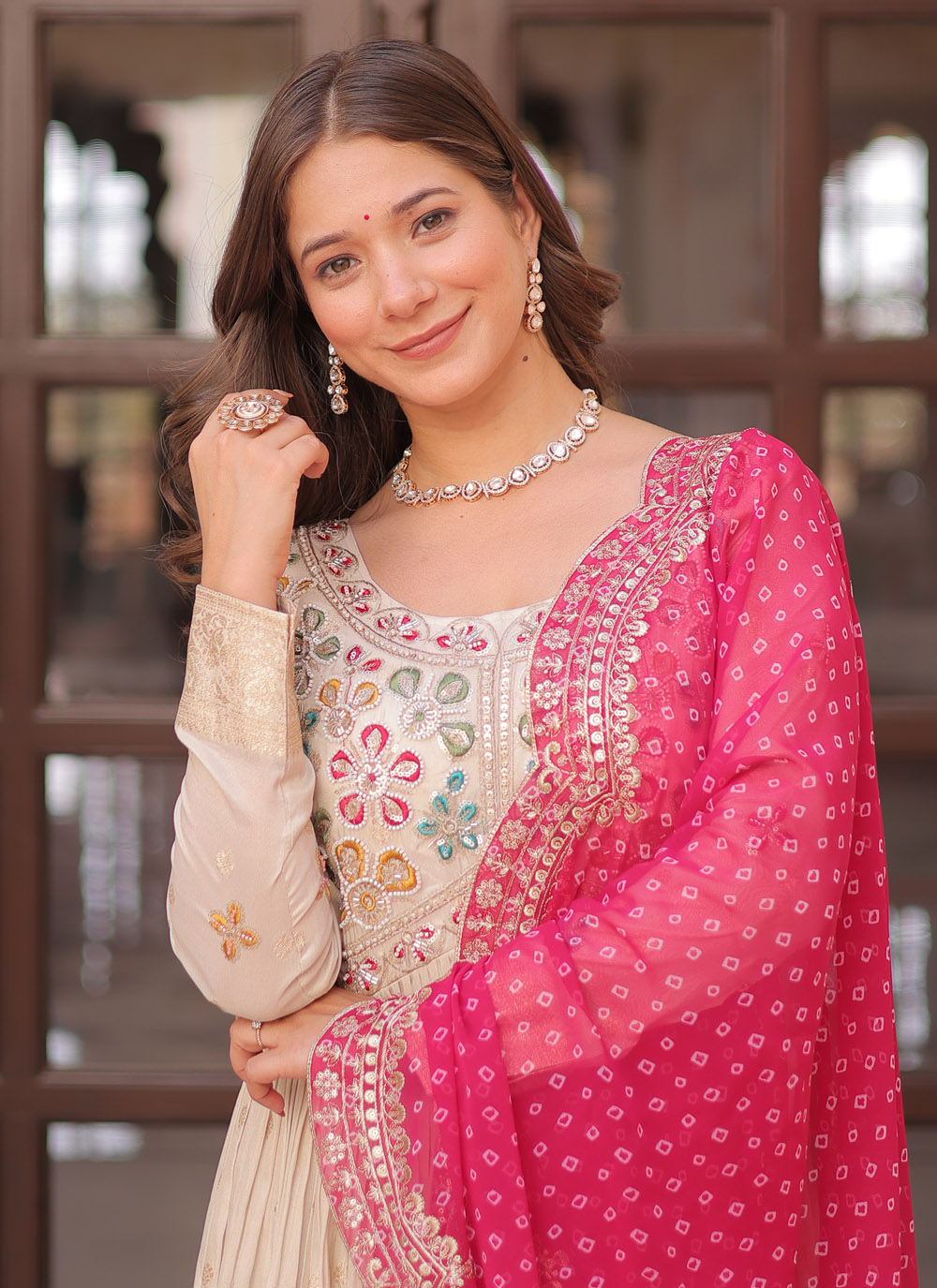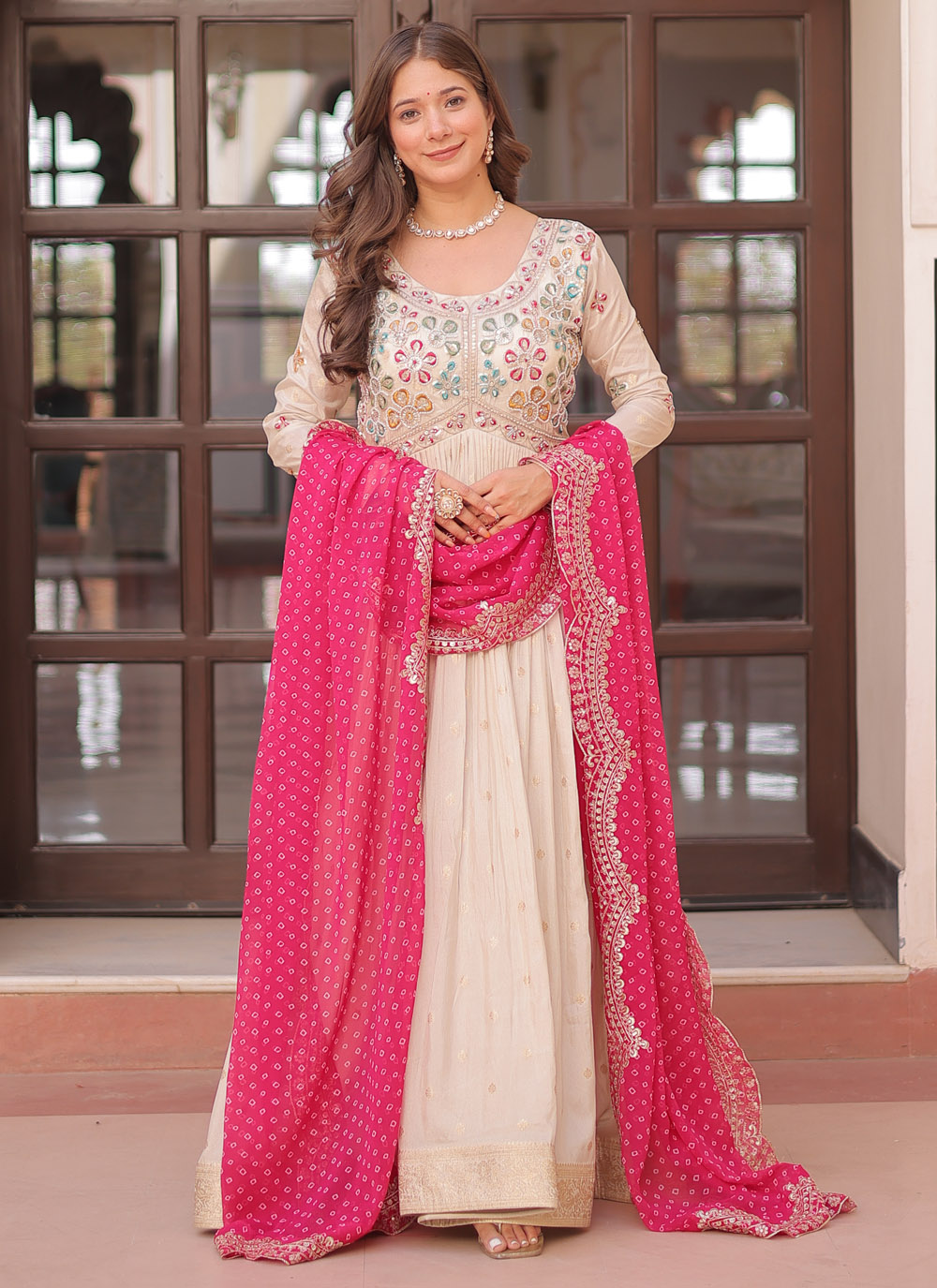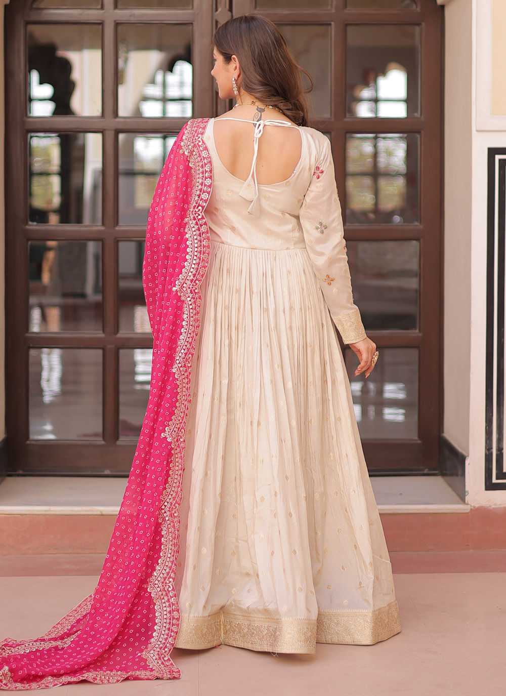 Crafted from elegant jacquard, this off-white embroidered gown showcases intricate beadwork and sequins that catch the light with every move. An ideal pick for engagement parties, evening receptions or contemporary festive events. Comes with matching dupatta.