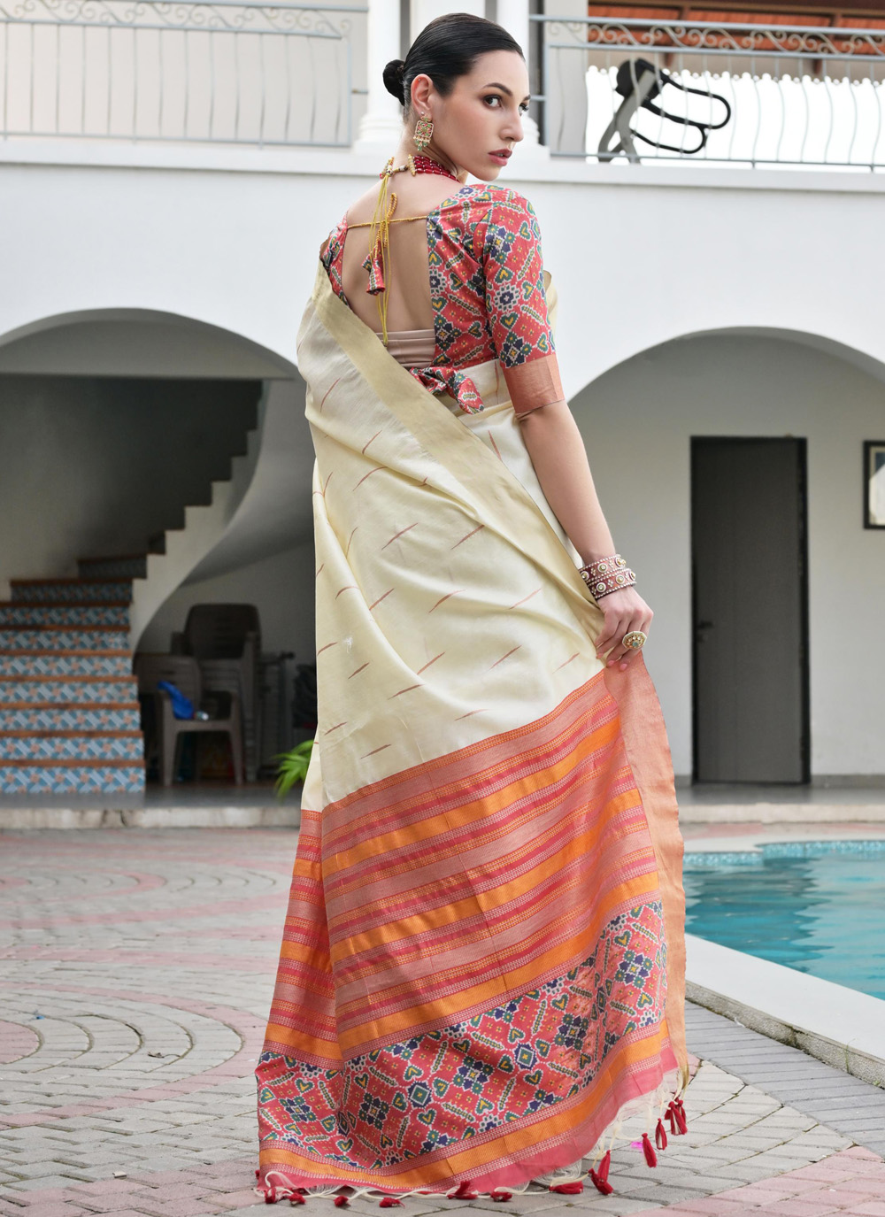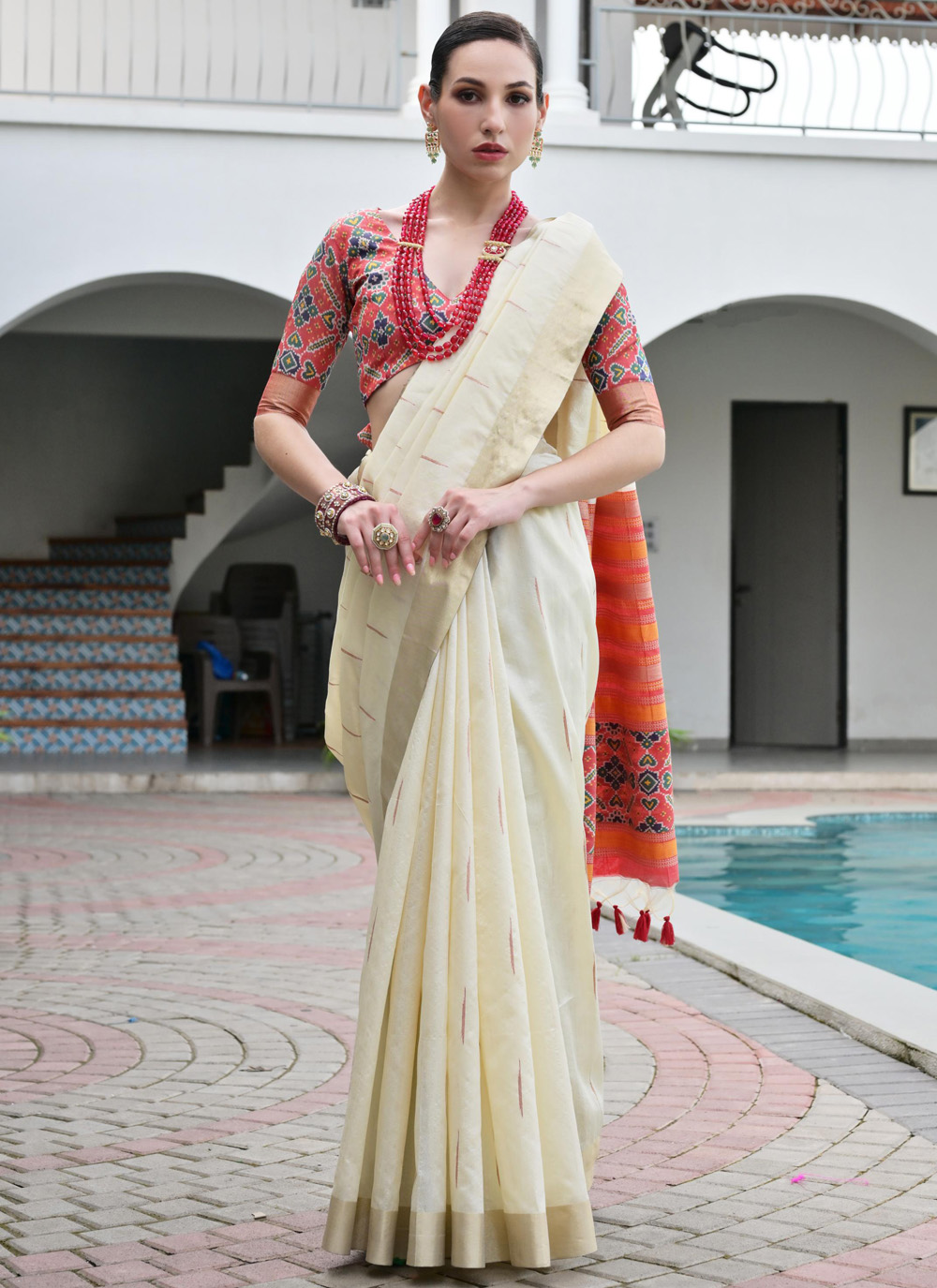 Crafted for festive styling, this off-white saree features refined zari work that highlights the natural texture of khadi silk. Its lightweight feel and trendy appeal make it perfect for festivals and celebrations. Comes with matching blouse.