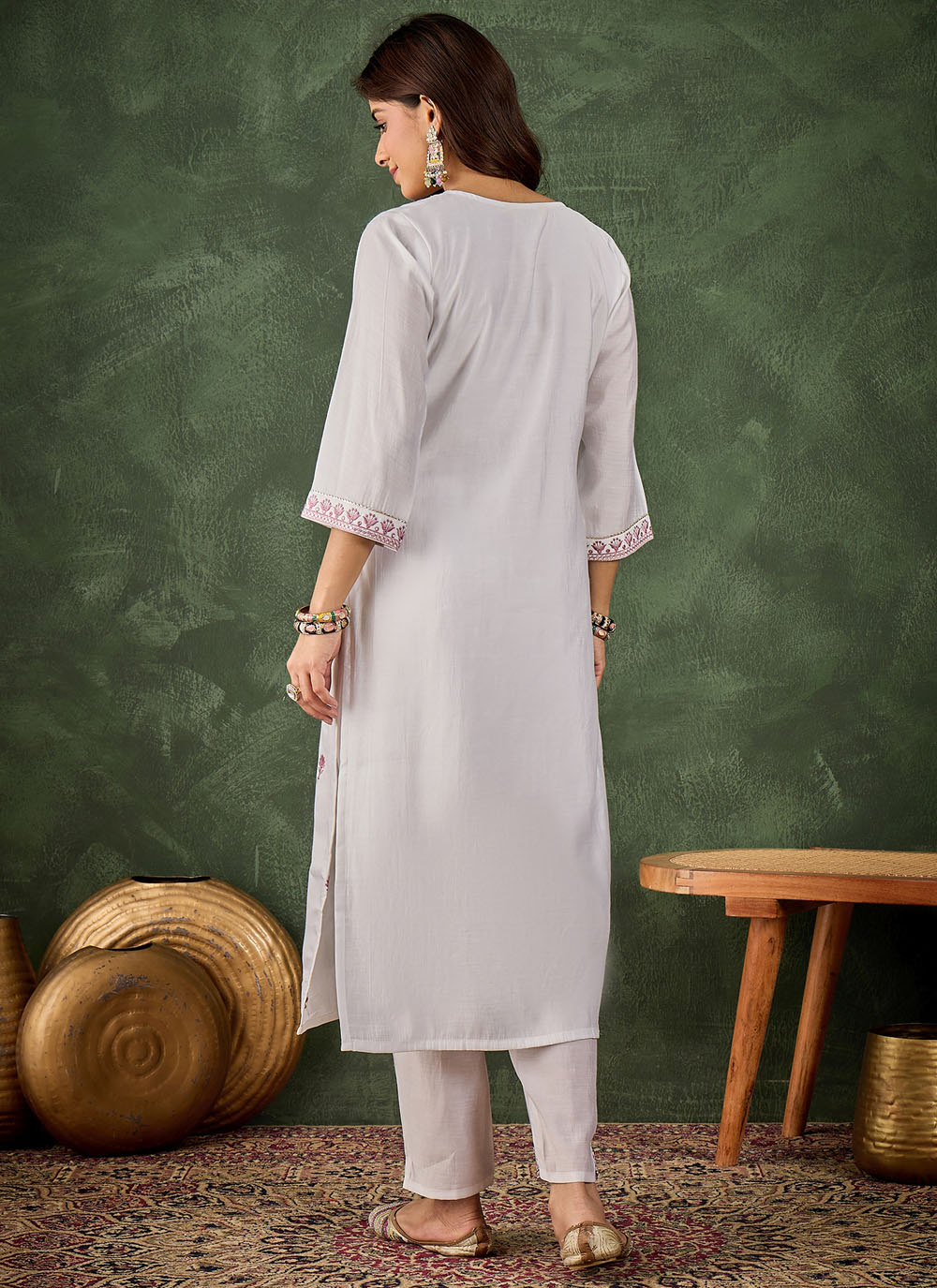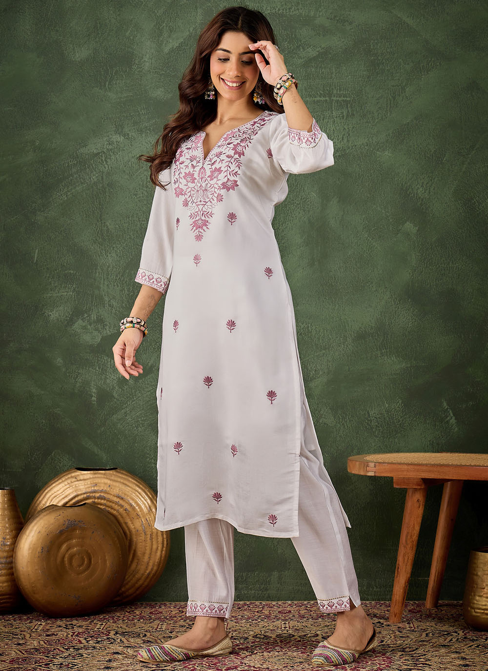 This Off White Silk Blend Embroidered Casual Kurti offers a perfect balance of elegance and comfort. The fine embroidery work complements the subtle off white tone, creating a refined and stylish appearance.