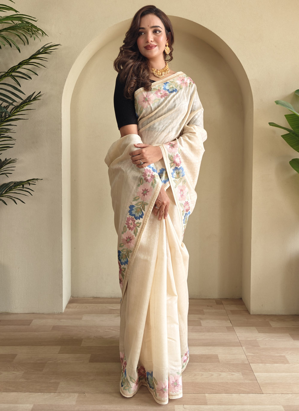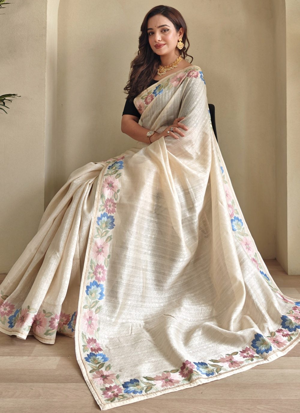 Step into understated luxury with this contemporary Tussar silk saree in soft off white. The refined thread embroidery on the borders adds a touch of timeless charm, making it a versatile choice for ceremonies, poojas and elegant gatherings. Comes with matching blouse.