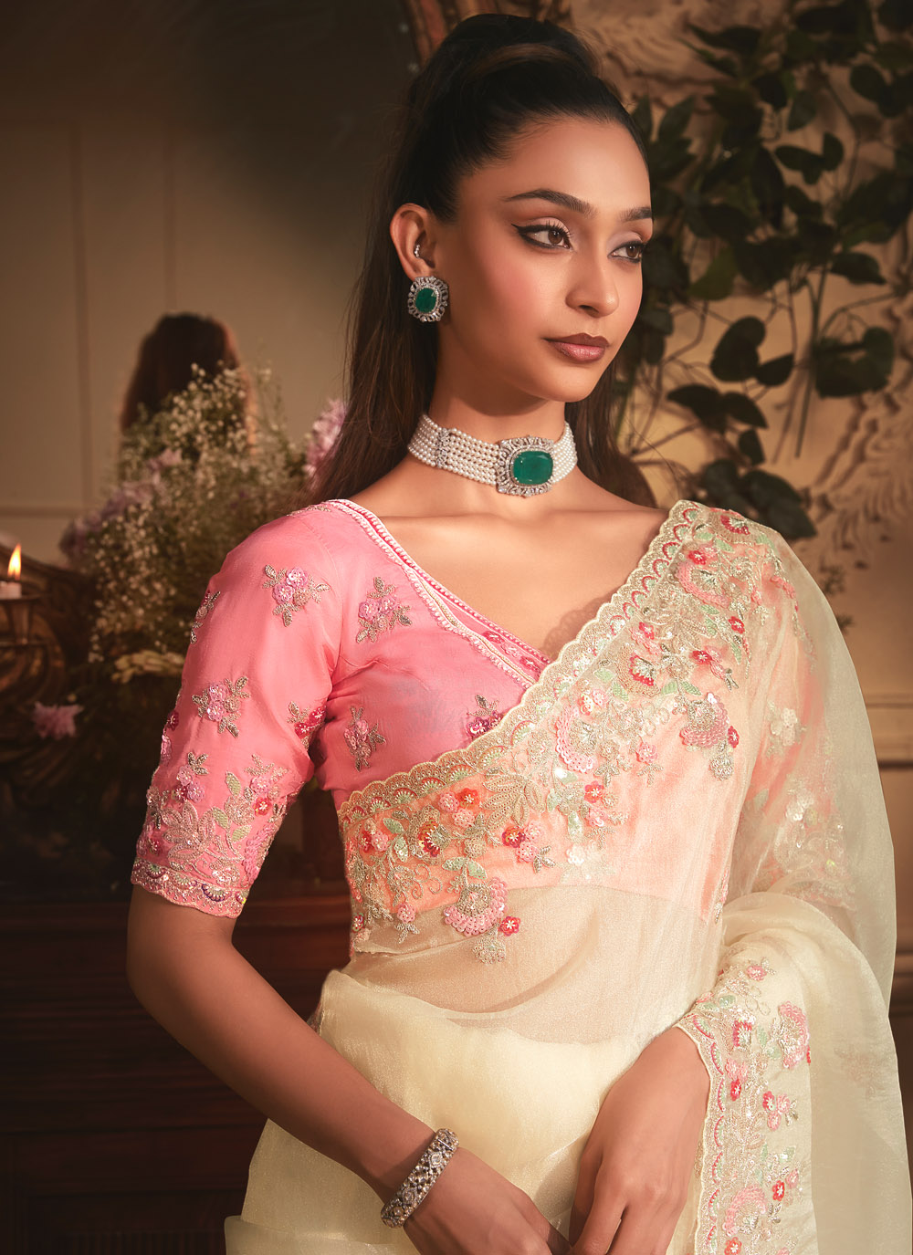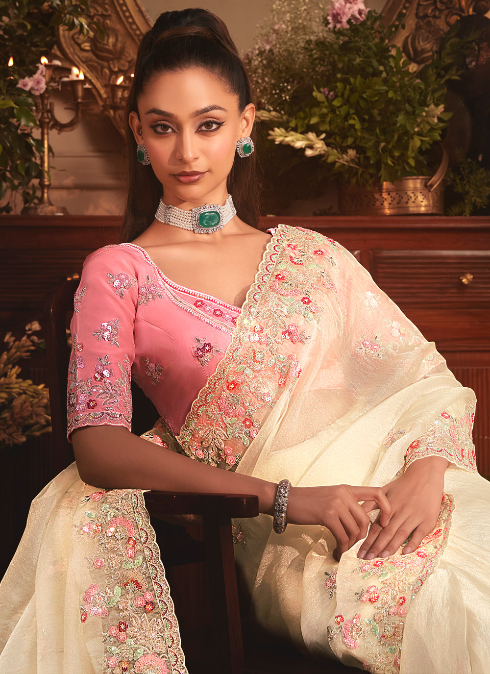 This Off White Tissue Organza Saree is styled with sequins and zari embroidery, finished with a delicate cut work border. Its soft drape and refined design make it a graceful option for receptions, wedding events and festive occasions. Comes with matching blouse.