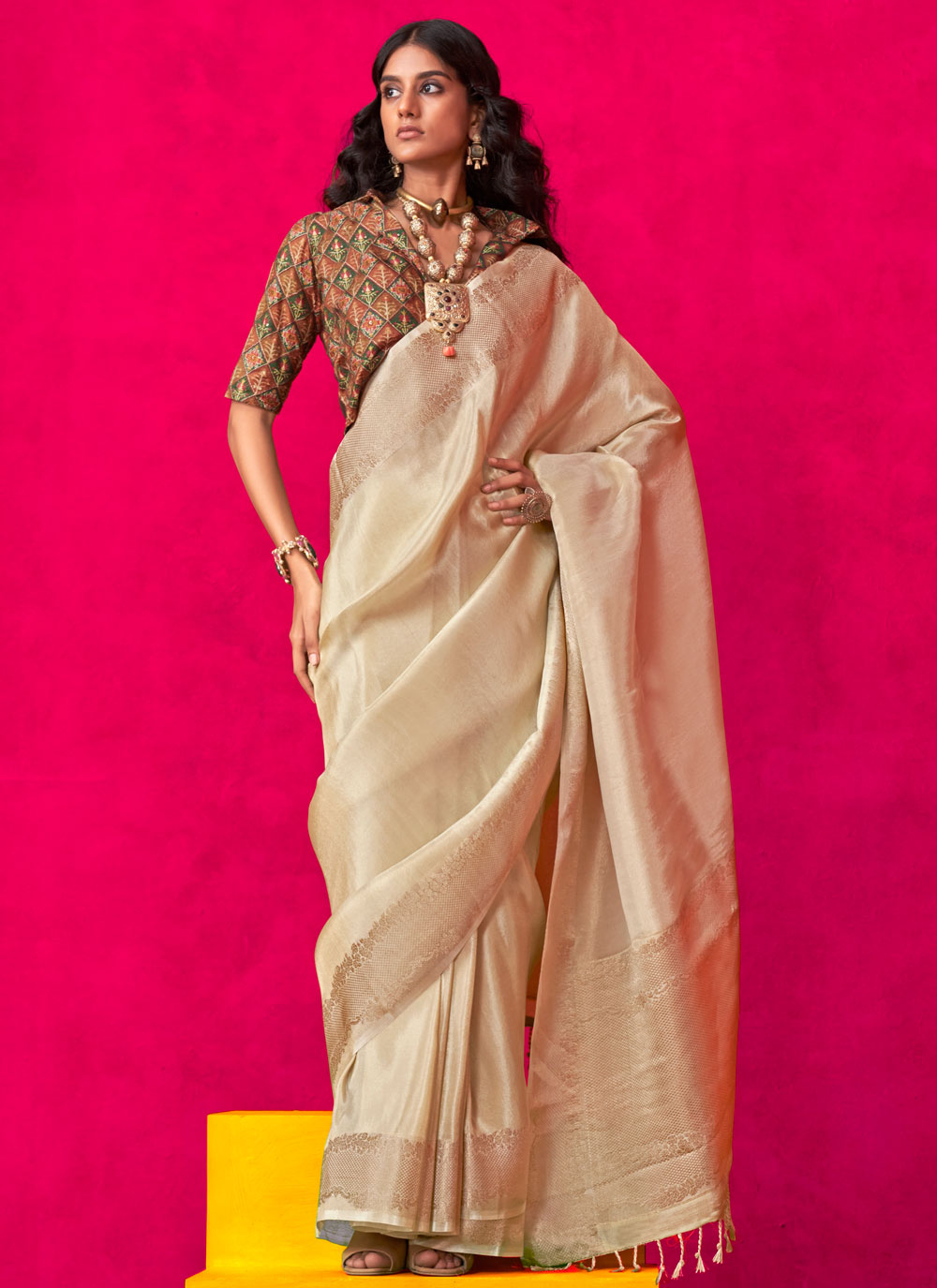 This Off White Traditional Viscose Weaving Zari Saree, with a matching blouse, features intricate zari weaving on soft off-white fabric. Ideal for weddings, festivals, or formal events, it offers elegance, comfort, and a graceful drape.