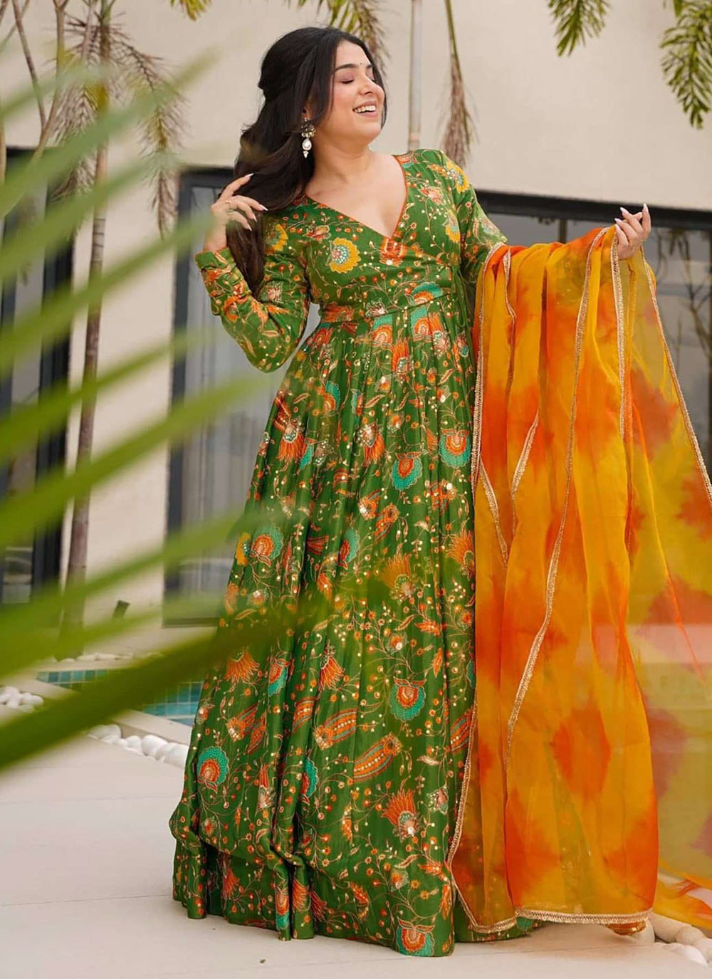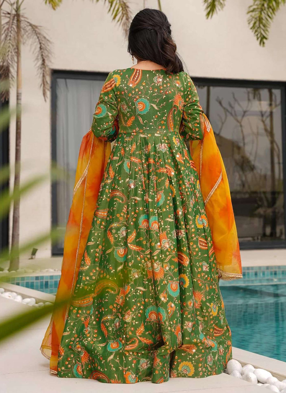 Celebrate your Mehandi ceremony in style with this olive green silk readymade gown, featuring elegant printed designs. The smooth fabric, flattering fit, and festive tone make it a perfect pick for pre-wedding functions and joyful occasions. Comes with matching dupatta.