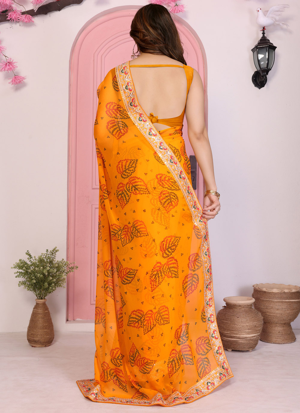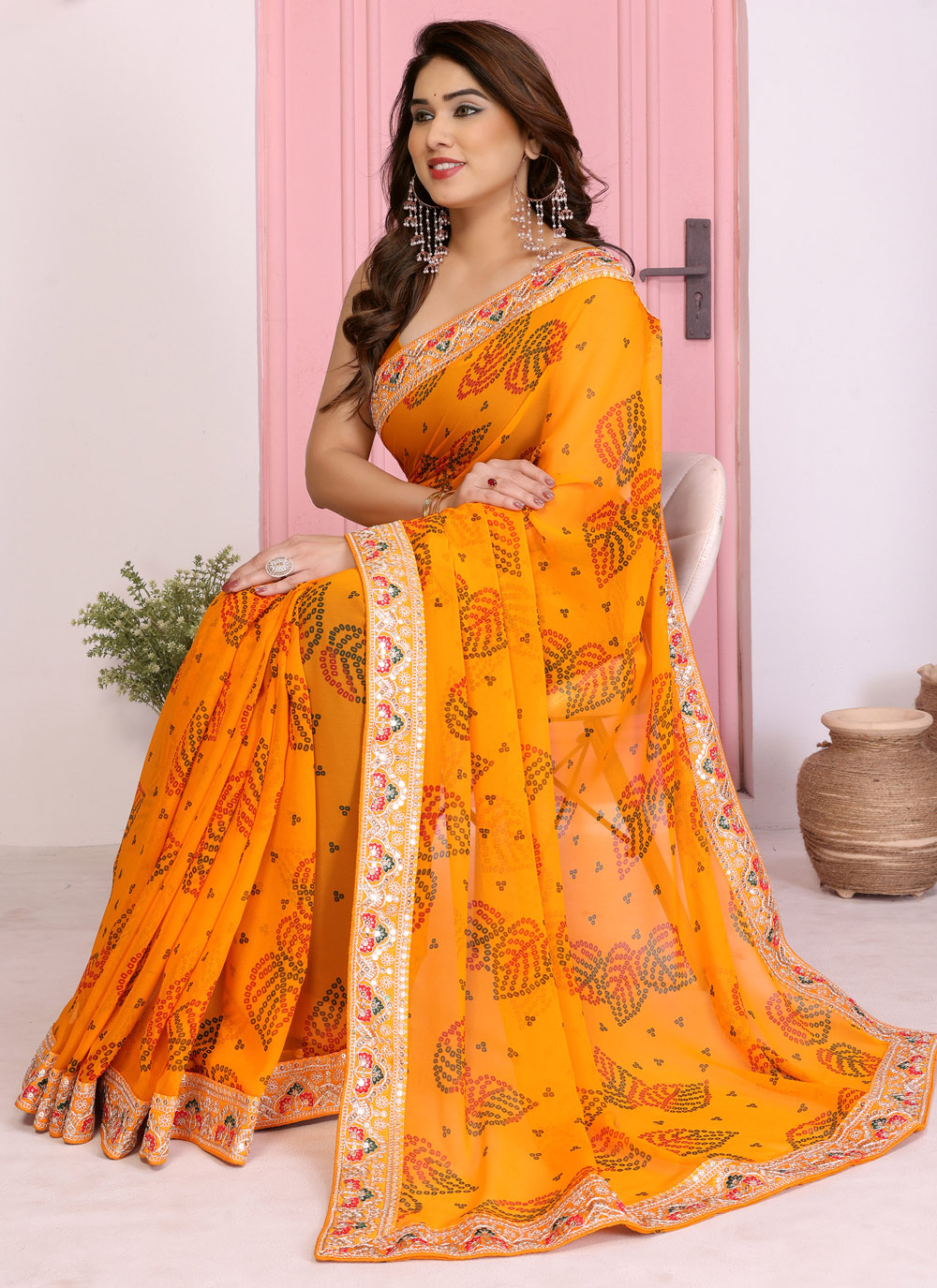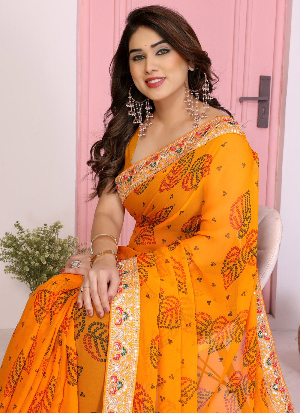 Step into ethnic elegance with this Orange Georgette Saree, highlighted by Bandhej prints and a beautifully embroidered lace patch border. Designed for comfort and sophistication, it is an ideal pick for festivals. Comes with matching blouse.