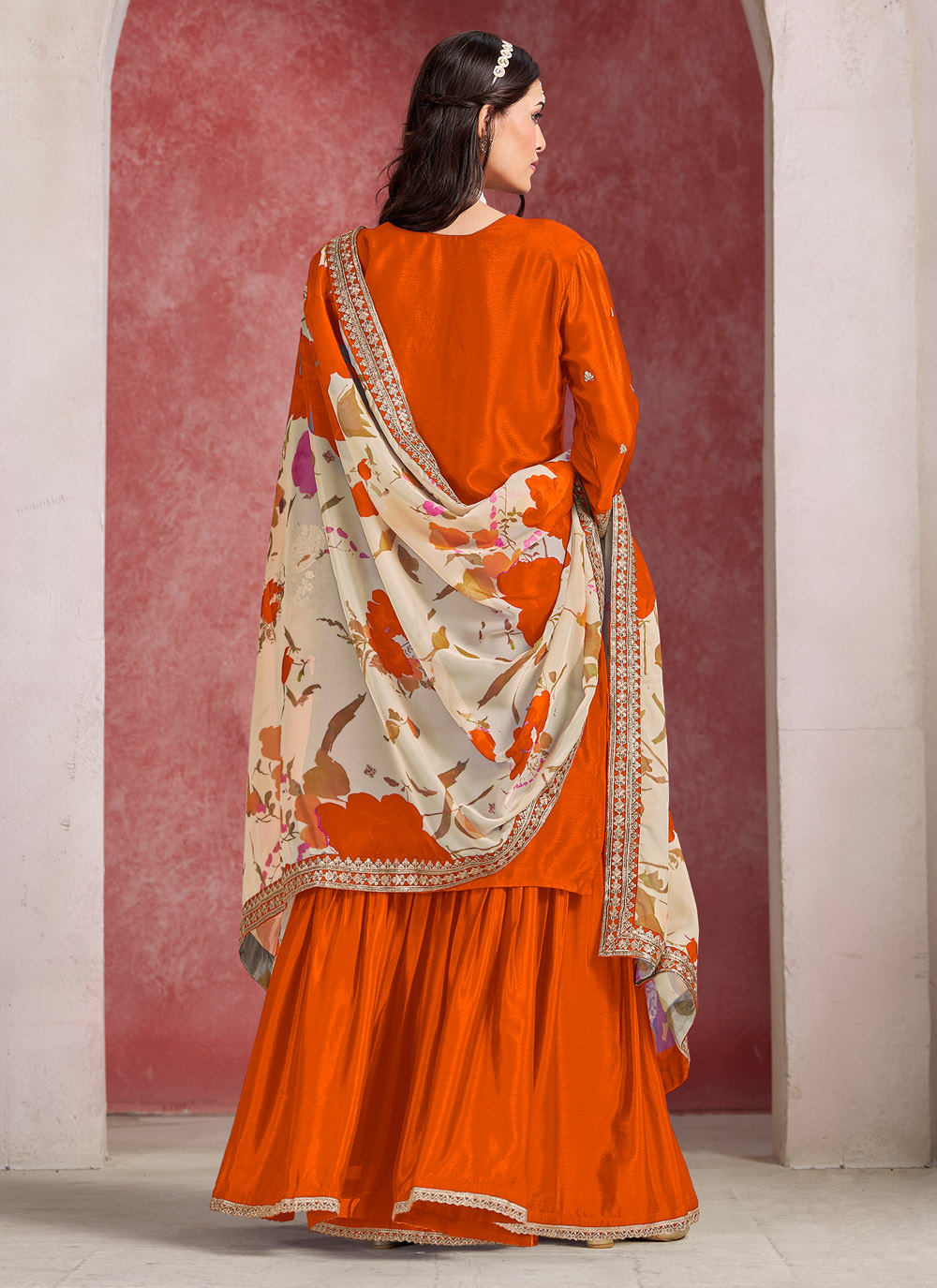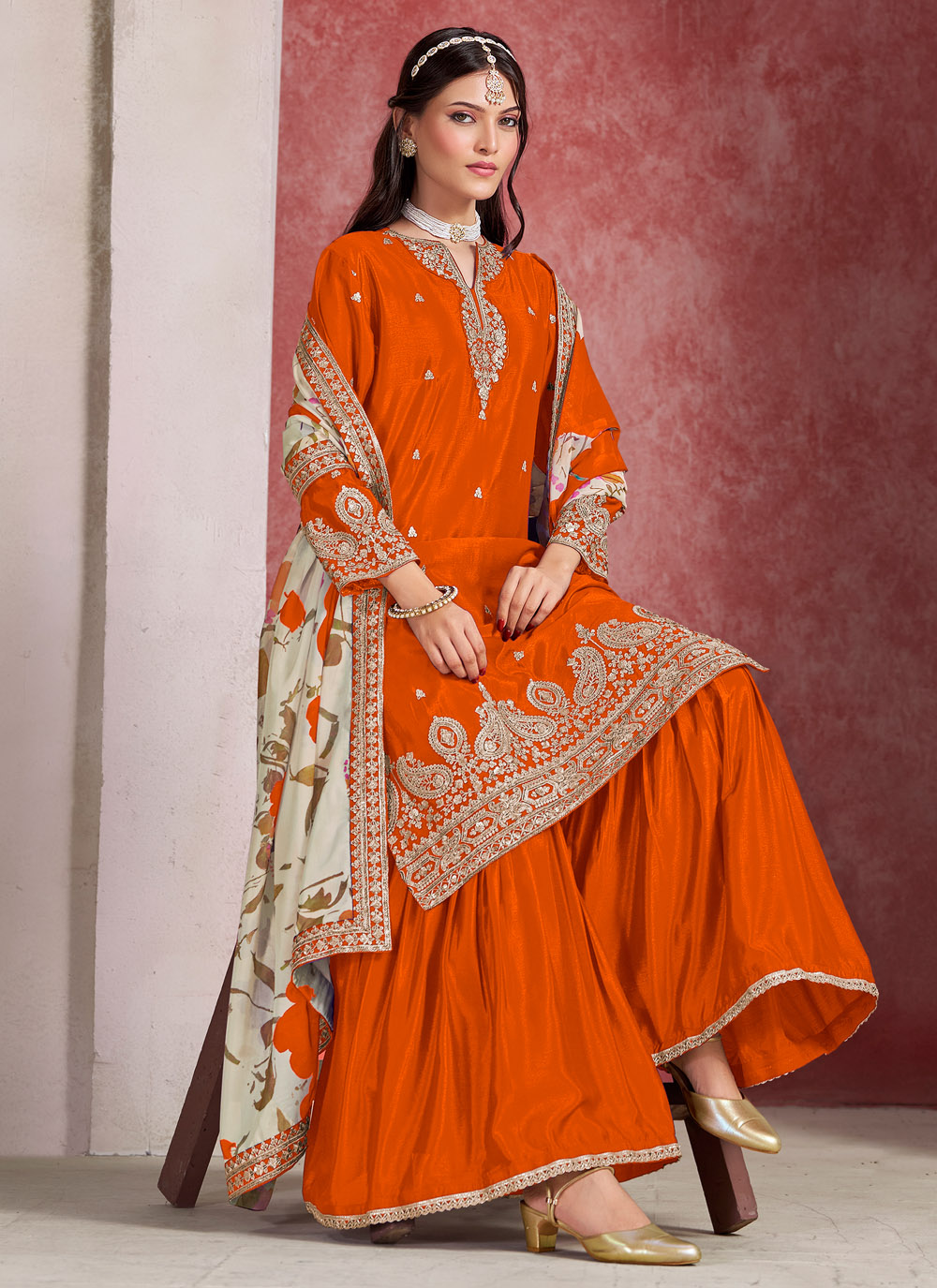 A blend of tradition and modern grace, this Orange Chinon Silk Embroidered Palazzo Suit captures the essence of festive style. Intricate thread embroidery adorns the front, sleeves, and hemline, while the flowy palazzo pants give you ease and style. Comes with matching bottom and dupatta.
