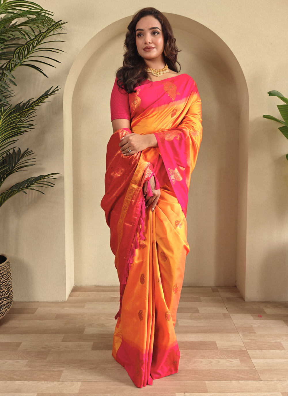 Drape elegance with this radiant orange silk saree, enriched with intricate zari weaving. Perfect for festive occasions and weddings, it exudes traditional charm and luxury. Pair it with statement jewellery to complete your regal ethnic look. Comes with matching blouse.