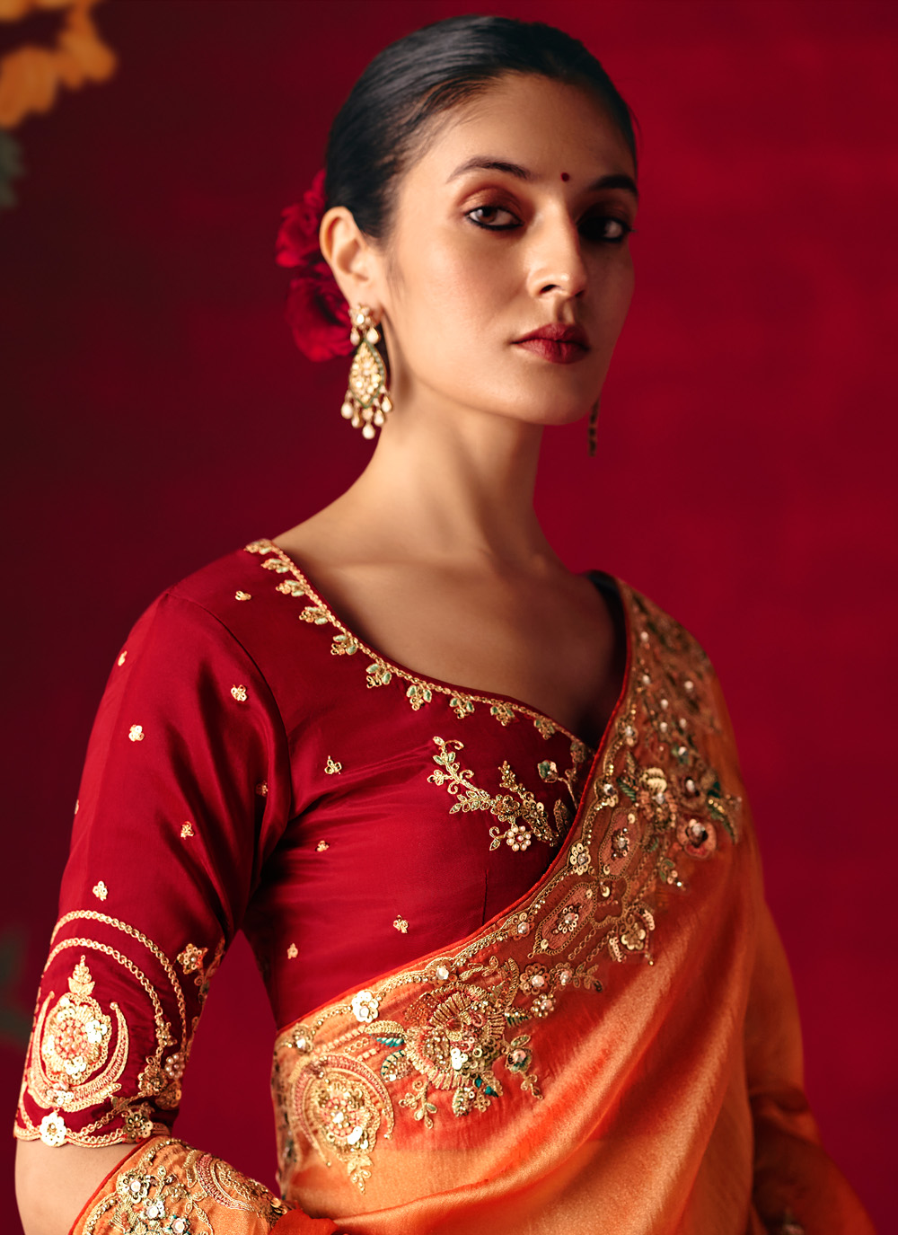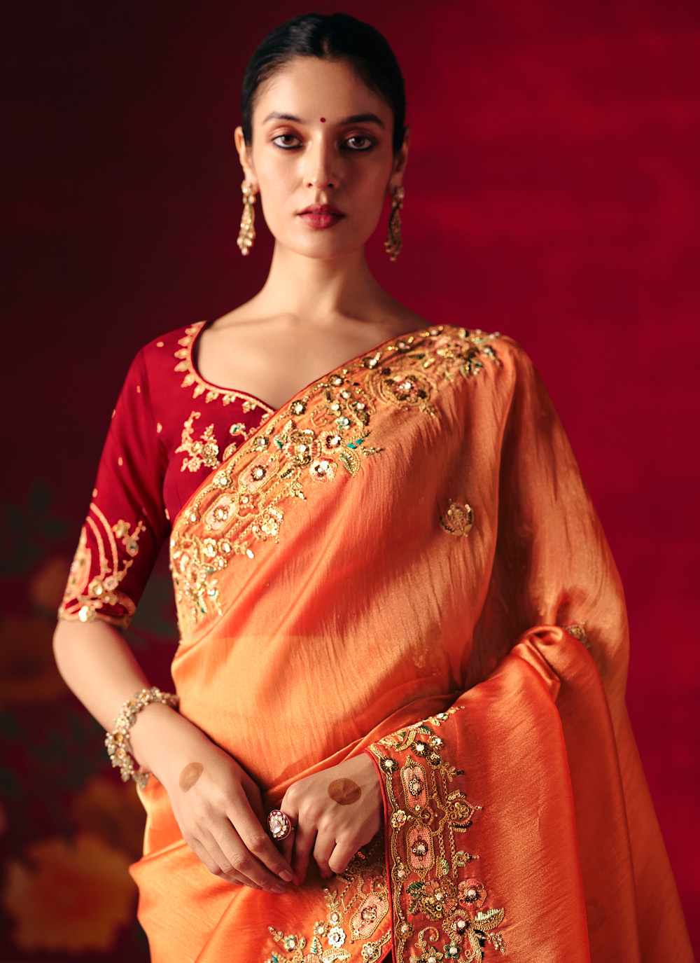 This contemporary saree showcases skilled craftsmanship through delicate thread embroidery, shimmering sequins and classic butti work on rich fancy fabric. The bright orange tone enhances its festive and stylish appeal. Comes with matching blouse.